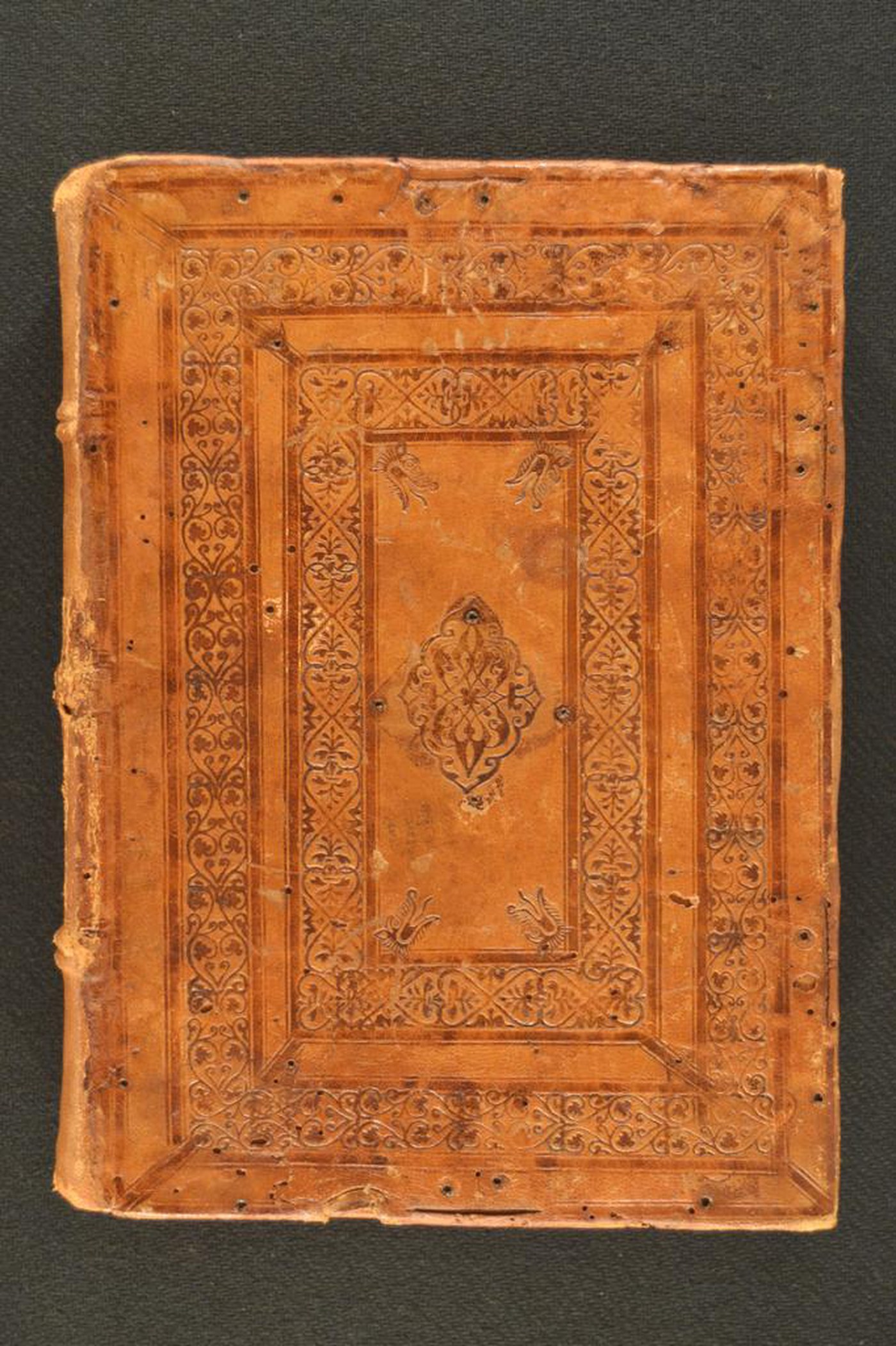 Cuoio di capra marrone su assi lignee smussate ai contropiatti in corrispondenza dei tagli, decorato a secco e in oro. Impronte di quattro borchie lanceolate e umbone quadrangolare. Filetti bruniti concentrici parzialmente collegati agli angoli. Seconda e quarta cornice rispettivamente caratterizzate da anfore fogliate e coppie di fregi cuoriformi fogliati addossati. Testa di lupo negli angoli interni dello specchio. Cognome dell’autore e titolo dell’opera in testa al piatto posteriore. Motivo mamelucco centrale. Tracce di quattro fermagli. Cucitura su tre nervi rinnovati. Capitelli, indorsatura, rimbocchi e carte di guardia rinnovati. Tagli rustici. Stato di conservazione: mediocre. Materiale di copertura originale scomparso al dorso; fiore diffusamente svanito al piatto anteriore. Volume restaurato.