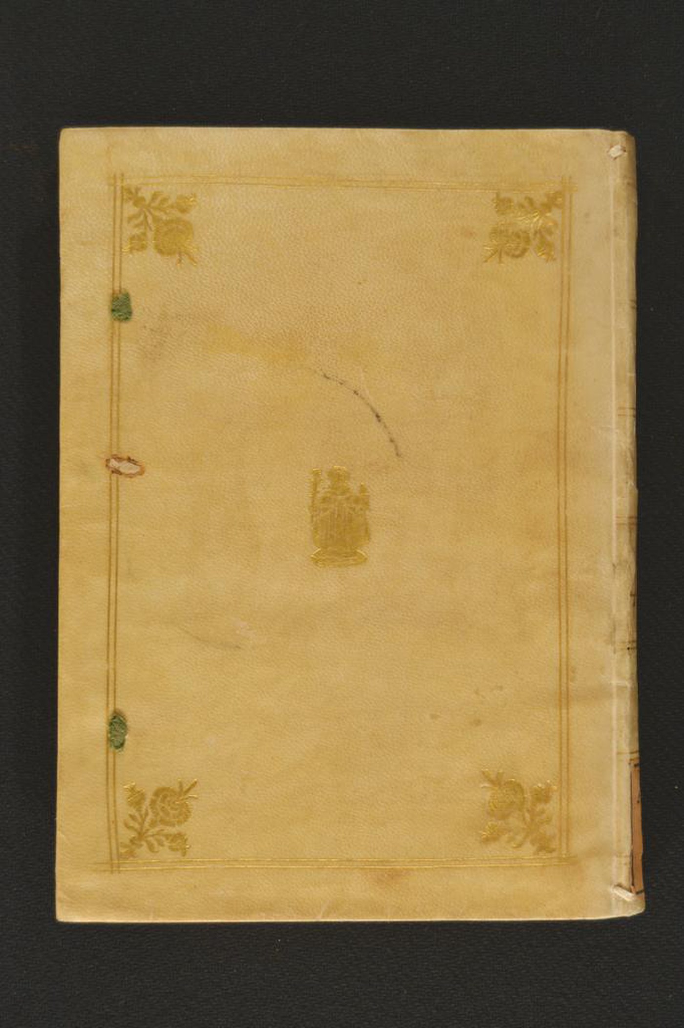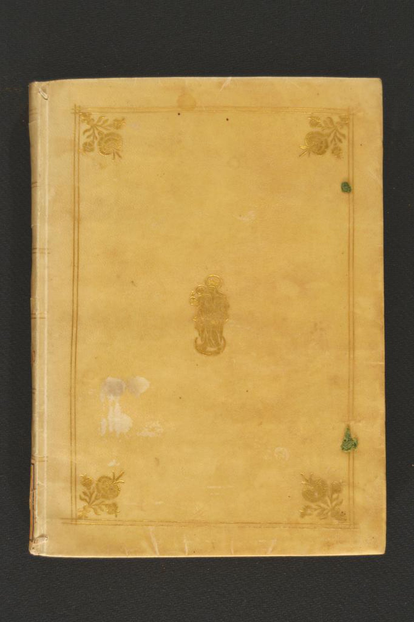 Pergamena semifloscia su quadranti in cartone decorata in oro. Coppia di filetti concentrici. Garofano negli angoli dello specchio. Crescente sormontato dalla Madonna a piena immagine con il Bambino in braccio al piatto anteriore a fronte di figura antropomorfa con ramo fiorito e ghianda a quello posteriore. Tracce di due lacci in seta verde. Testina classica negli scompartimenti del dorso. Capitelli muniti di anima in pelle allumata passante avvolta da fili in lino in rosso e grigio. Cucitura su tre nervi. Indorsatura realizzata tramite alette orizzontali cartacee. Rimbocchi accuratamente rifilati. Carte di guardia bianche. Tagli dorati. Stato di conservazione: discreto. Gore brune al materiale di copertura.