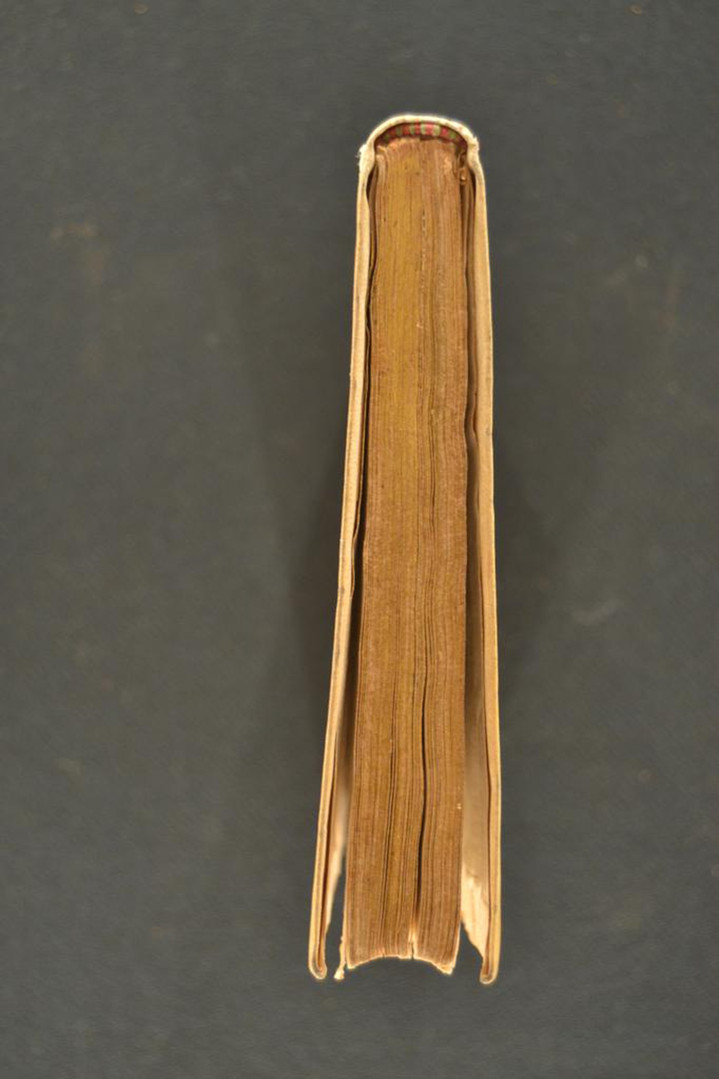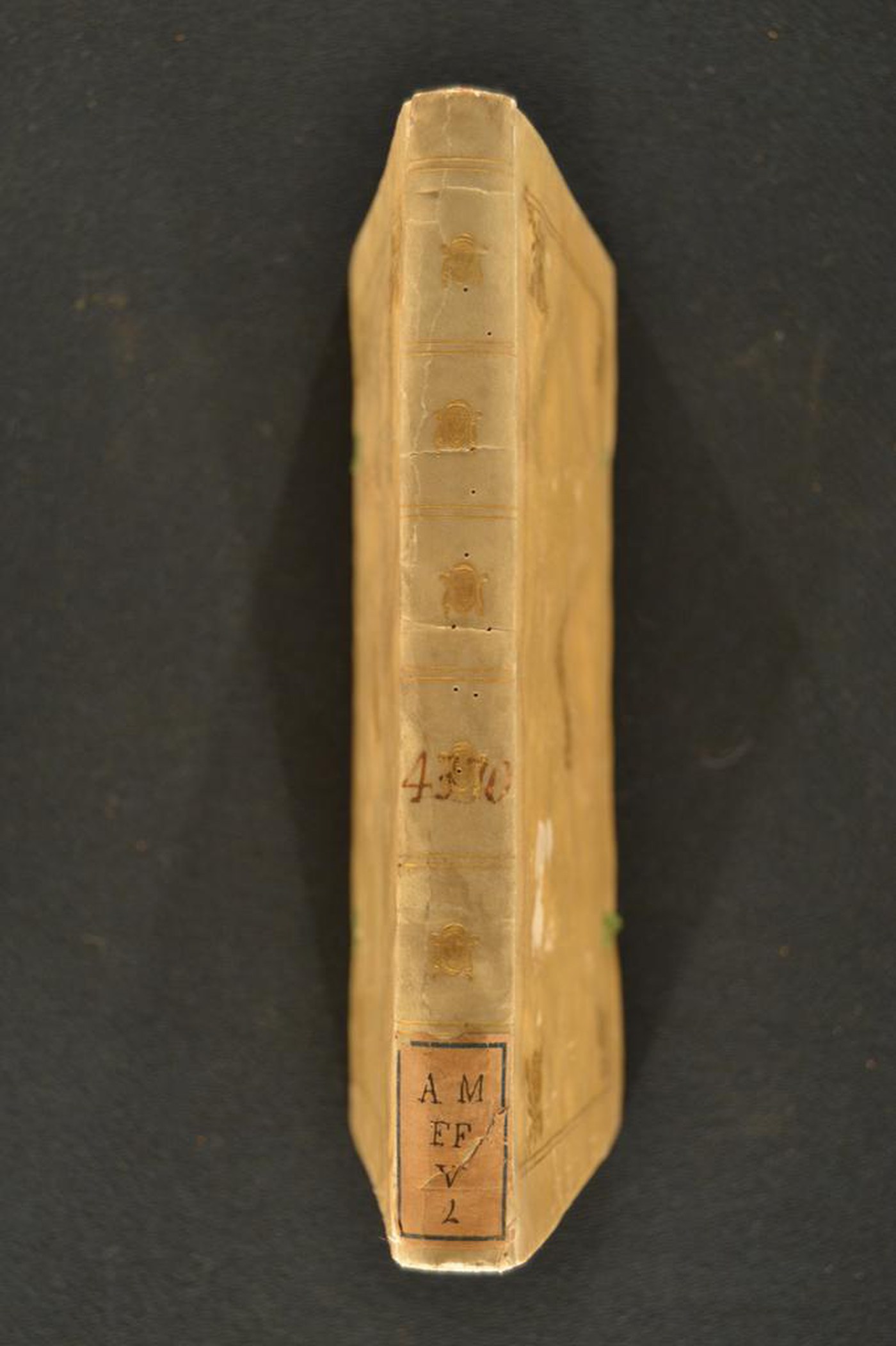Un paio di fregi e le note tipografiche inducono ad assegnare la legatura alla prima metà del XVII secolo, eseguita a Bologna (?). In evidenza i capitelli muniti di anima in pelle allumata passante, i lacci in seta verde, i rimbocchi accuratamente rifilati e i tagli dorati.