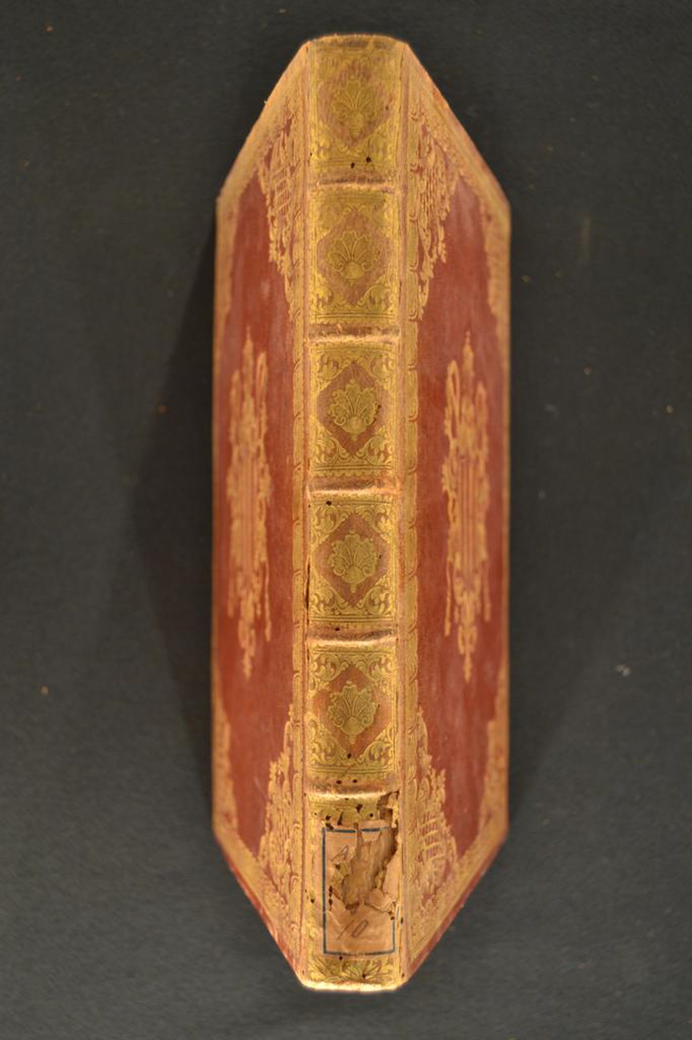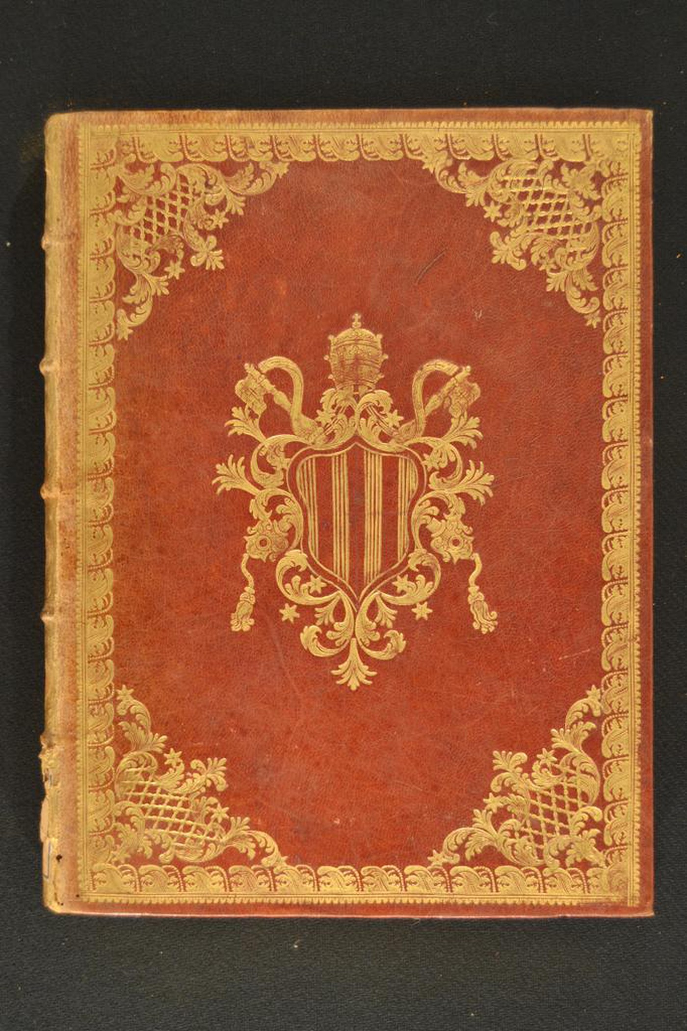 Cuoio di capra rosso su quadranti in cartone decorato in oro. Cornice caratterizzata da monticelli e due filetti. Margini interni dello specchio provvisti di fogliami mossi alternati ad archi filigranati, tralicci, fronde. Armi (100x80 mm) riferibili al pontefice Benedetto XIV (1740-1758). Scompartimenti del dorso riquadrati; volute fogliate negli angoli interni e conchiglia centrale in quelli residui. Capitelli muniti di anima circolare avvolta da fili in canapa e seta rosa. Cucitura su cinque nervi rilevati. Indorsatura realizzata tramite alette orizzontali cartacee. Labbri muti. Rimbocchi discretamente rifilati. Contropiatti rivestiti da foglio in carta marmorizzata policroma pettinata. Carte di guardia bianche. Tagli dorati brillanti incisi. Stato di conservazione: discreto, Marginali spellature al materiale di copertura dalla tonalità scolorita lungo il dorso.