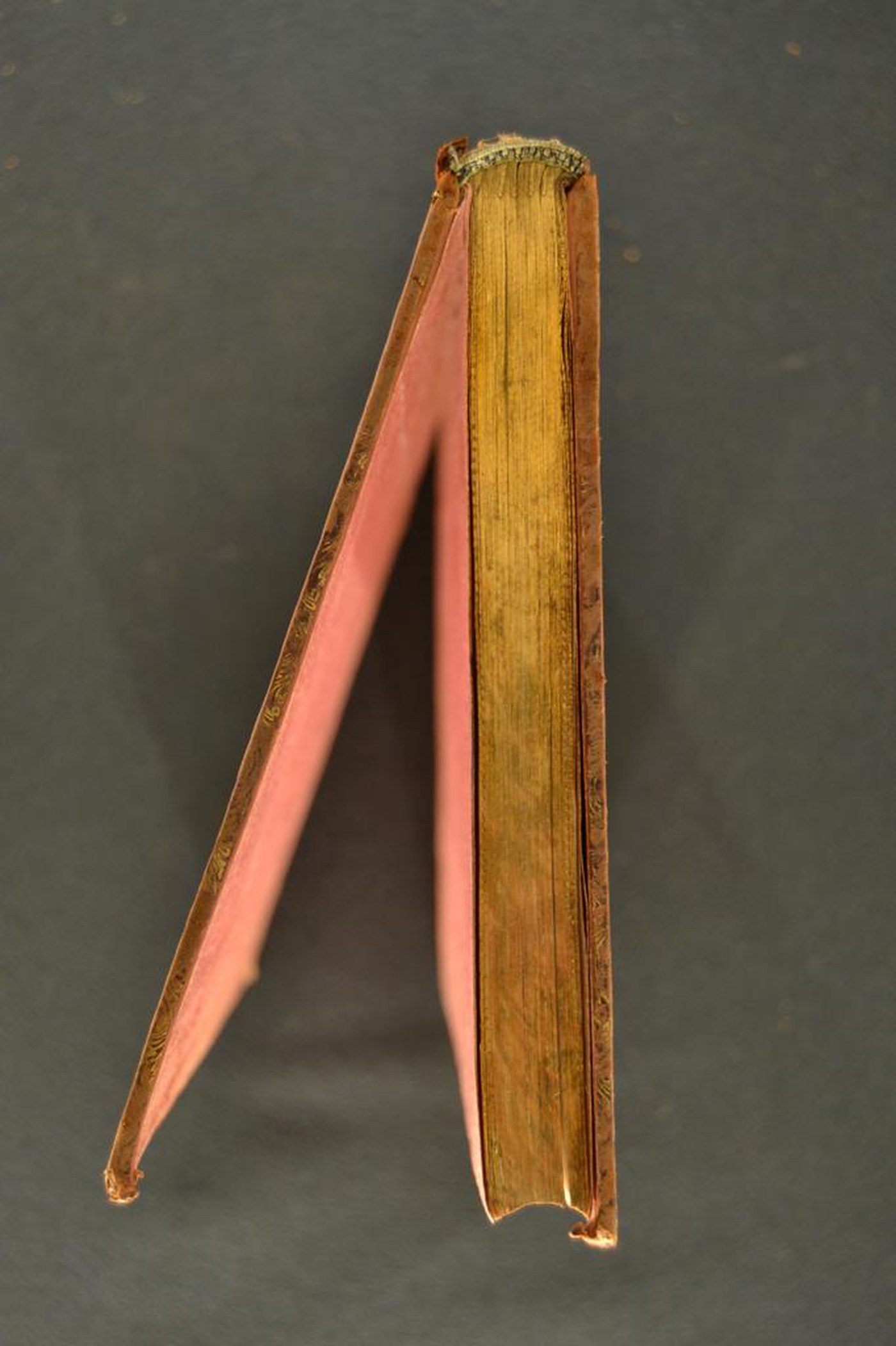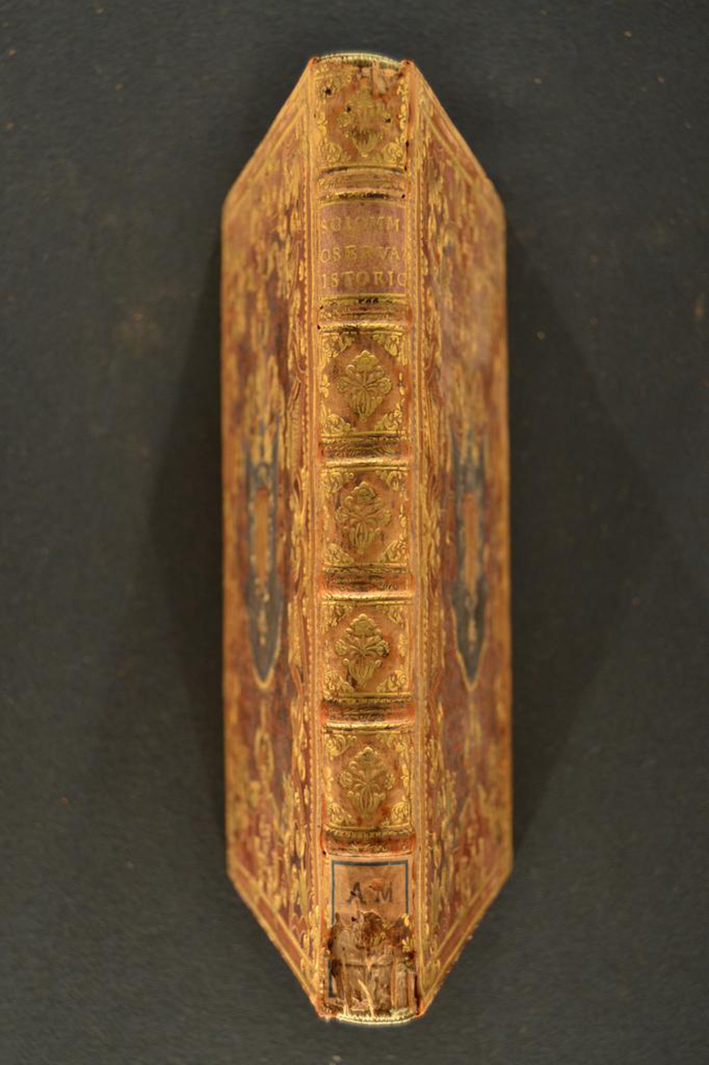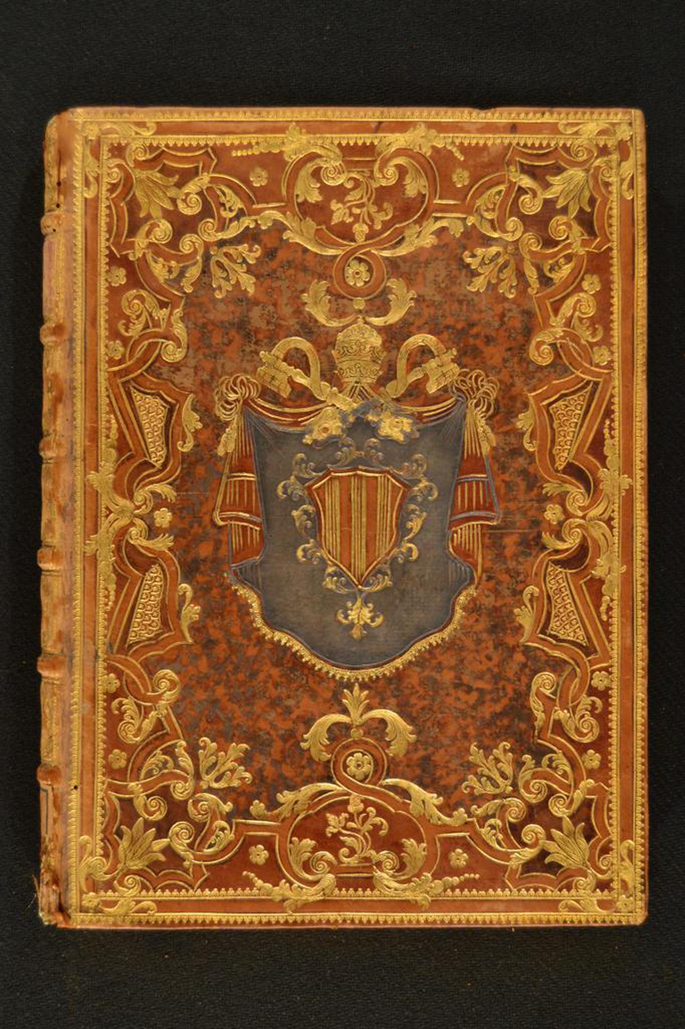 I fregi, le carte di guardia sbruffate e le note tipografiche consentono di assegnare la legatura al secondo quarto del XVIII secolo, eseguita a Roma. In evidenza i tagli dorati brillanti incisi.