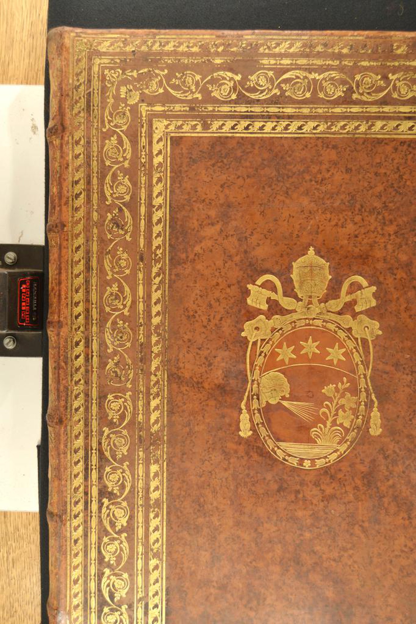 Cuoio di vitello su quadranti in cartone decorato in oro. Cornici concentriche caratterizzate da fogliami ritorti, catenelle, volute fogliate e fiorite. Armi (195x122 mm) riferibili al pontefice Pio VI (1775-1799). Scompartimenti del dorso riquadrati. Nel secondo, il titolo dell’opera e la partizione del volume; rosone entro serto fogliato in quelli residui. Capitelli muniti di anima circolare avvolta da fili in seta rosa e azzurra. Cucitura su sei nervi rilevati. Indorsatura non osservabile. Labbri ornati con tratteggi diagonali rettilinei e ondivaghi. Rimbocchi non osservabili. Carte di guardia marmorizzate policrome del genere caillouté, bianche rifatte e coeve. Tagli dorati. Stato di conservazione: discreto. Spellature al materiale di copertura e parziale scomparsa della doratura. Volume restaurato.