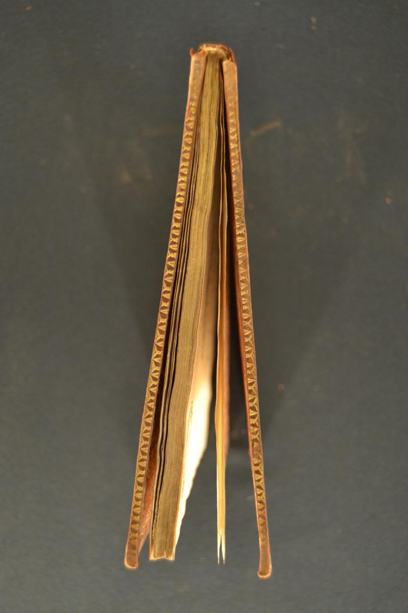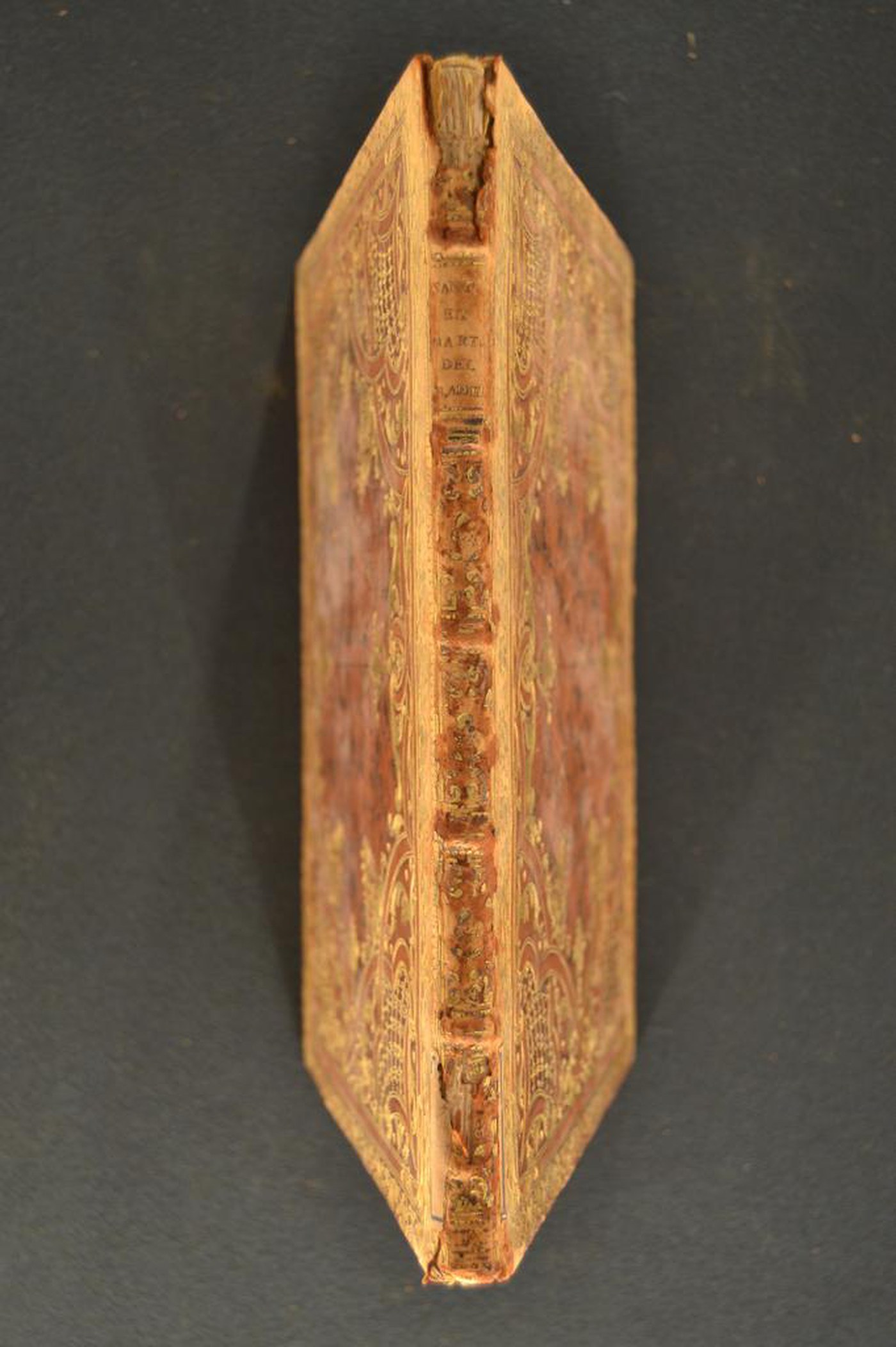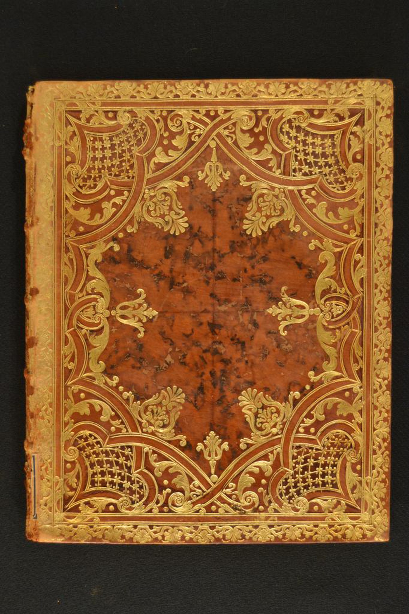 I fregi e le note tipografiche consentono di assegnare la legatura al terzo quarto del XVIII secolo, eseguita a Roma. In evidenza l’inusuale impianto ornamentale, le carte di guardia goffrate realizzate tramite matrice calcografica impressa su foglia dorata precedentemente applicata alla carta bianca e i tagli dorati brillanti incisi.