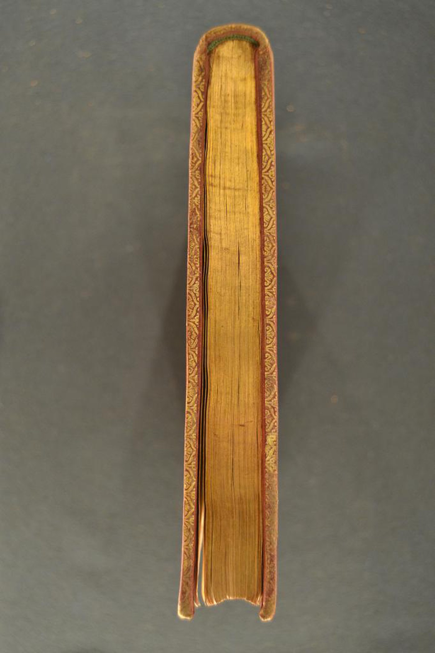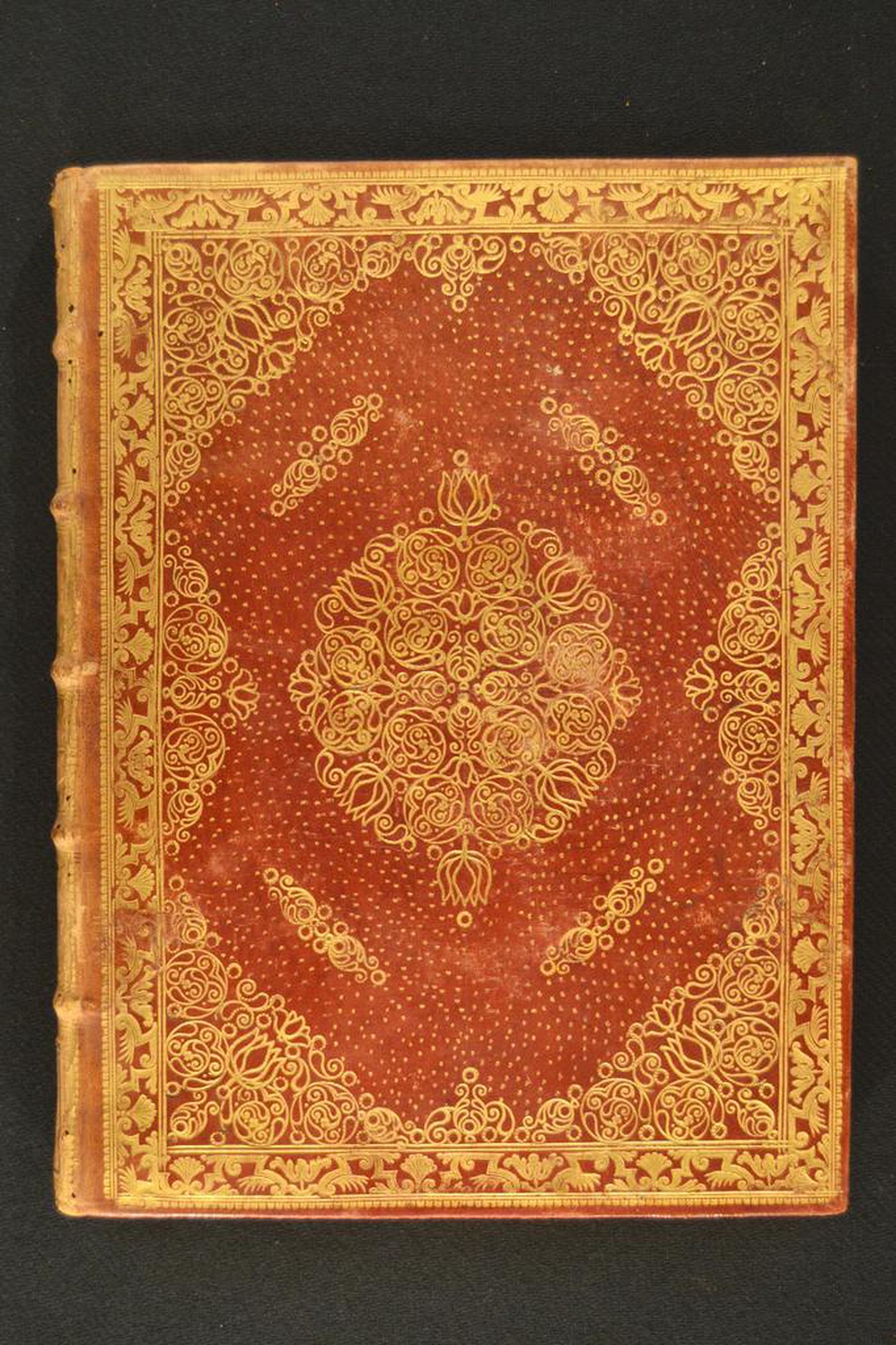 Cuoio di capra marrone su quadranti in cartone decorato in oro. Cornice caratterizzata da corolle trilobate alternate a palmette entro nastri. Margini interni dello specchio provvisti di anfore panciute, cerchielli filigranati muti, volute, tulipani, foglie caudate, motivi ripresi nell’ampia cartella centrale entro sfondo puntinato. Scompartimenti del dorso riquadrati. Nel secondo, il cognome dell’autore e il titolo dell’opera; voluta fogliata negli angoli interni e motivo fitomorfo centrale in quelli residui. Capitelli muniti di anima circolare in seta turchese. Cucitura su cinque nervi rilevati. Indorsatura realizzata tramite alette orizzontali cartacee. Labbri ornati con fogliami trilobati entro cuspidi. Rimbocchi discretamente rifilati. Carte di guardia marmorizzate policrome pettinate e bianche. Tagli dorati brillanti. Stato di conservazione: discreto. Marginali spellature al materiale di copertura dalla tonalità scolorita lungo il dorso, ivi parzialmente assente in testa.