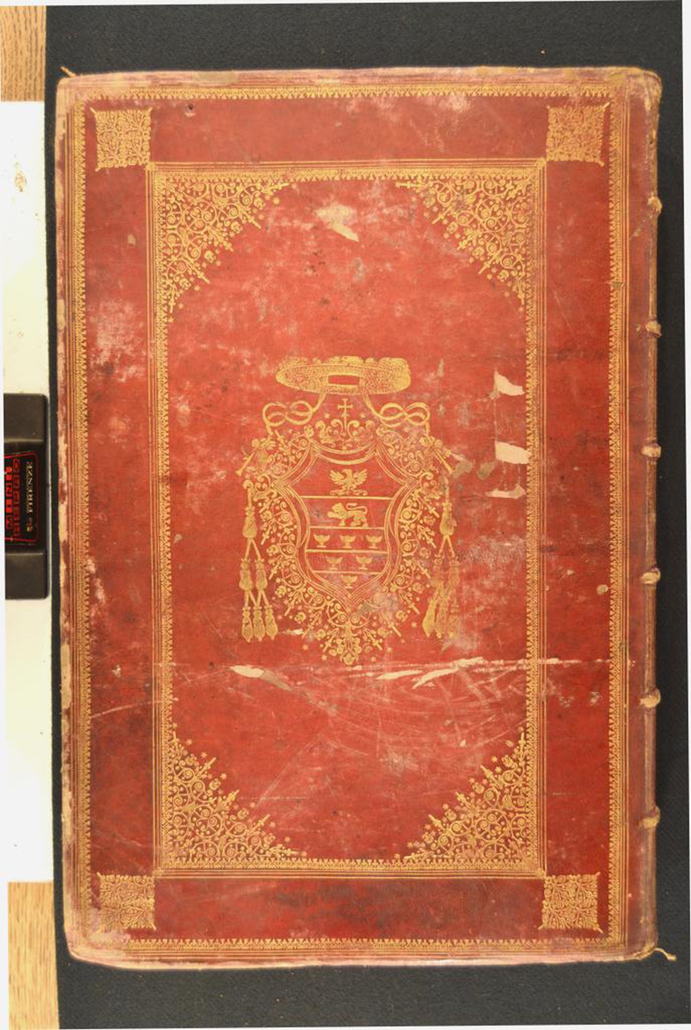 Cuoio di capra rosso su quadranti in cartone decorato in oro. Due fasci di filetti all’antica affiancati da motivi a pizzo. Motivo fitomorfo su base losangata negli angoli esterni del riquadro interno. Negli angoli interni dello specchio, grottesche e minute stelle. Armi prelatizie (115x100 mm) riferibili al cardinale Benedetto Odescalchi - Erba. Scompartimenti del dorso riquadrati. Nel secondo, il titolo dell’opera; grottesca negli angoli interni e fregio fitomorfo su sfondo losangato in quelli residui. Capitelli muniti di due anime circolari avvolte da fili in lino verde, bianco e rosa. Cucitura su cinque nervi rilevati. Indorsatura realizzata tramite alette orizzontali cartacee. Labbri ornati con fregi a pizzo. Rimbocchi rifilati senza particolare cura. Carte di guardia goffrate a raffigurare fogliami, fiorami e grappoli d’uva bianchi su sfondo dorato, e bianche. Tagli dorati brillanti incisi. Stato di conservazione: mediocre. Diffuse spellature al materiale di copertura. Supporti stanchi. Angoli ricurvi e parzialmente sbrecciati ai piatti.