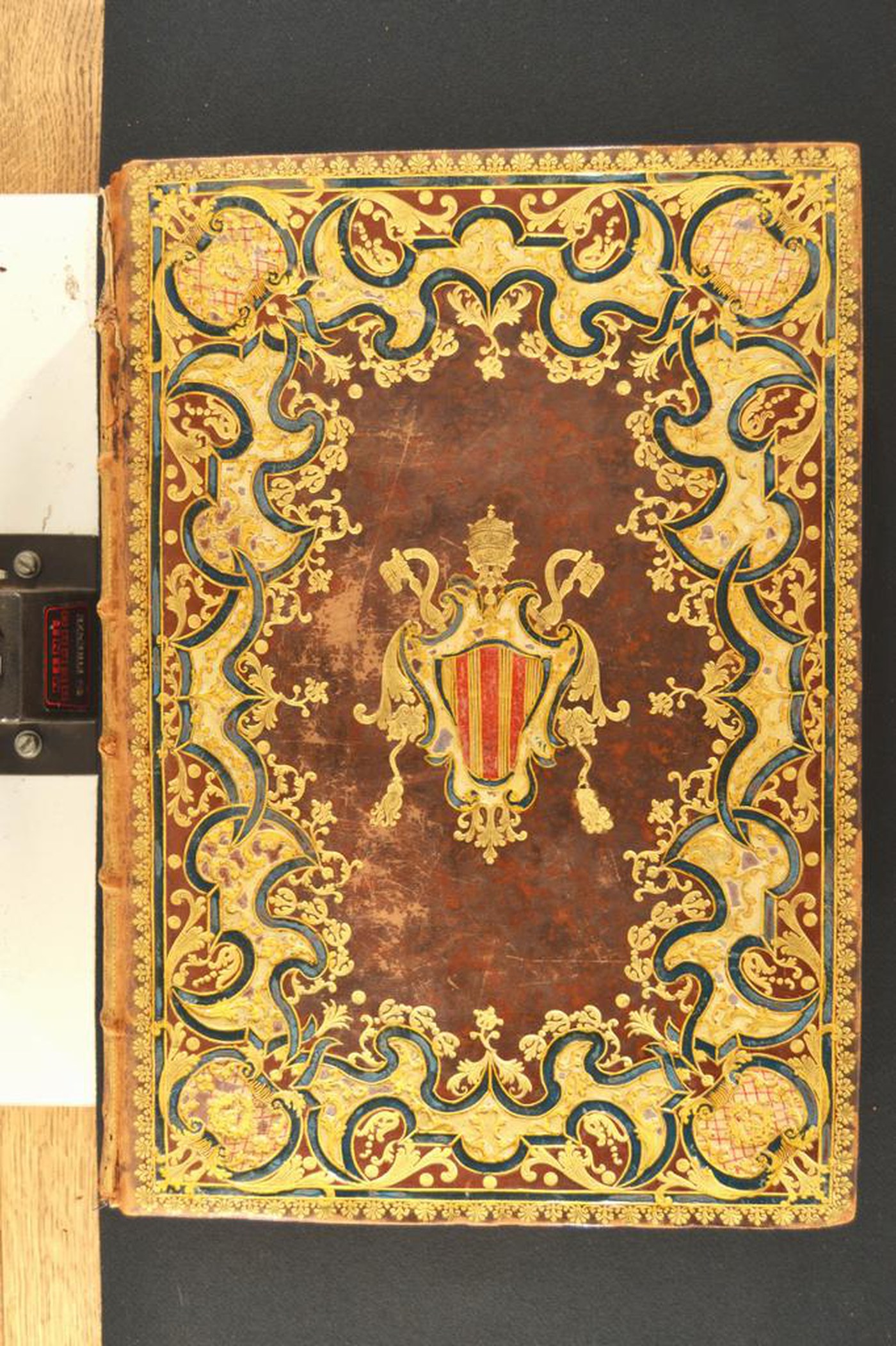 Cuoio marmorizzato marrone su quadranti in cartone decorato in oro e a colori. Cornice caratterizzata da palmette alternate a fogliami e da due filetti rilevati in blu. Margine interno dello specchio provvisto di scompartimenti fogliati e tralicci su sfondo in pasta bianca. Armi (110x110 mm) riferibili al pontefice Benedetto XIV (1740-1758). Scompartimenti del dorso riquadrati. Nel secondo, il titolo dell’opera; fogliami mossi in quelli residui. Capitelli muniti di anima circolare avvolta da fili in seta rosa e blu. Cucitura su sei nervi rilevati. Indorsatura realizzata tramite aletta cartacea verticale. Labbri ornati con fregi fogliati. Rimbocchi discretamente rifilati; margini ornati con motivi a pizzo. Carte di guardia marmorizzate policrome a foglia di quercia e bianche. Tagli dorati brillanti incisi. Stato di conservazione: mediocre - discreto. Materiale di copertura in parte spellato. Cerniere particolarmente indebolite. Angoli ricurvi, in parte sbrecciati. Volume restaurato nel 2010.