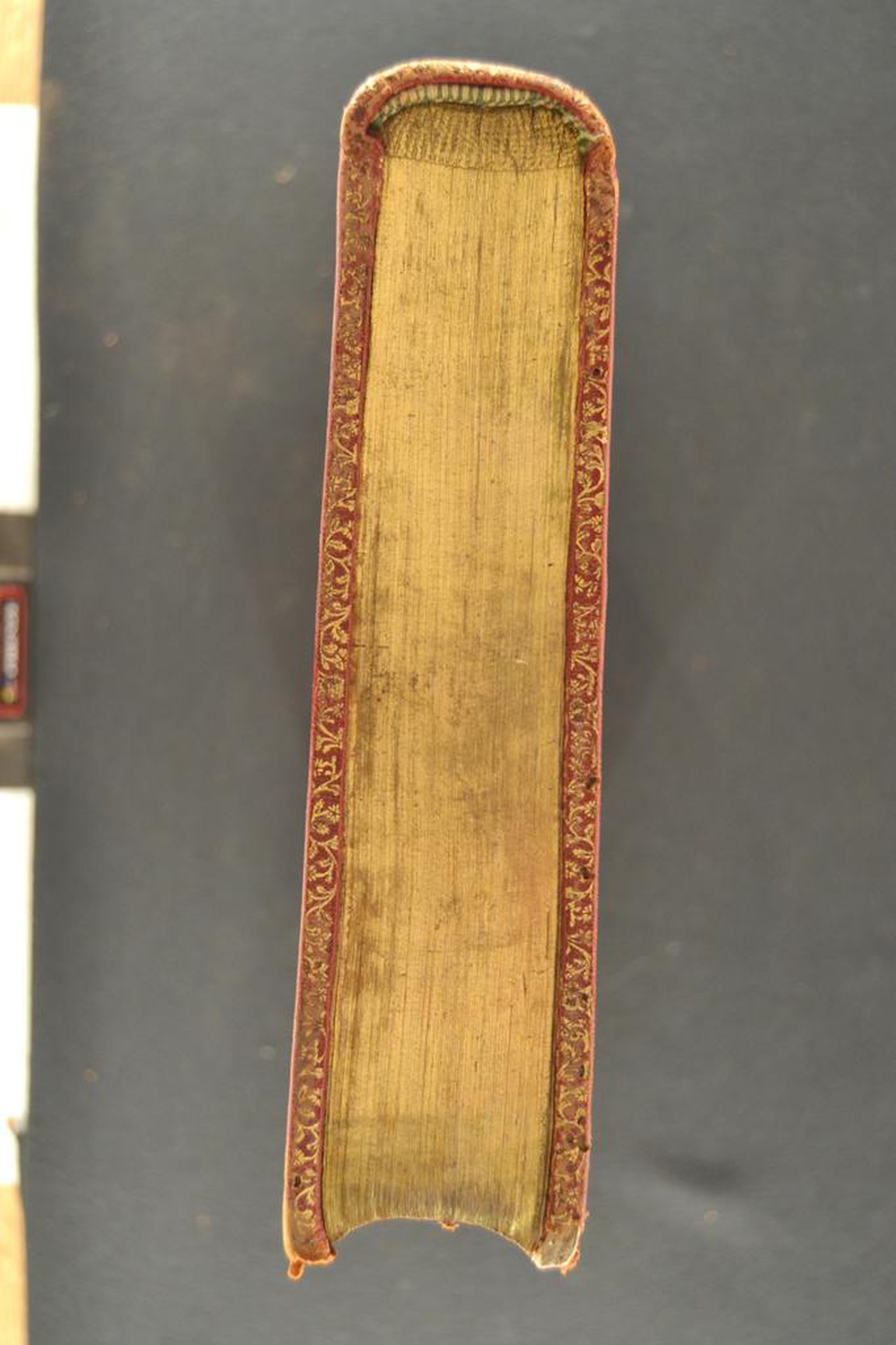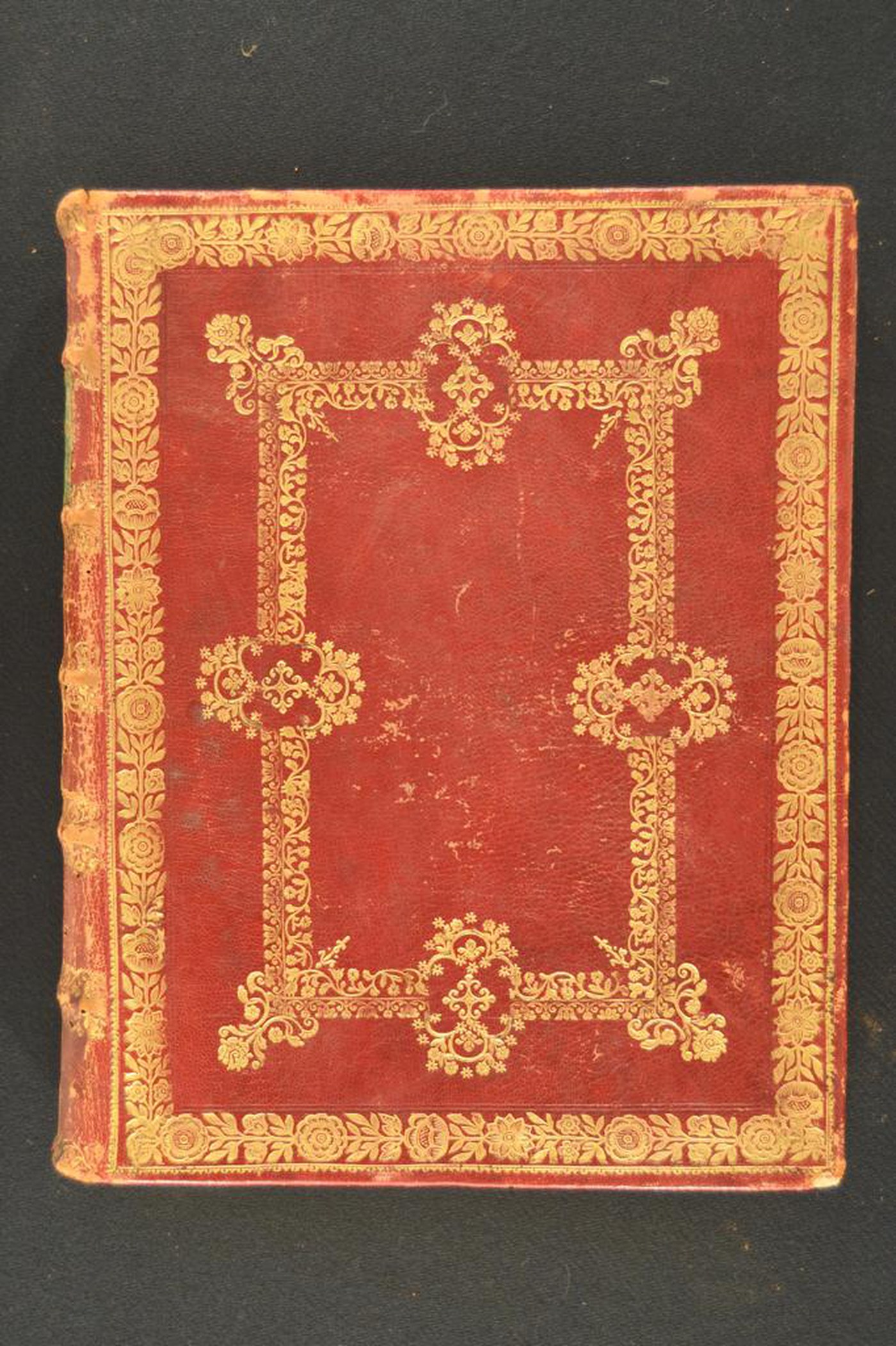 Cuoio di capra rosso su quadranti in cartone decorato in oro. Coppia di cornici concentriche provviste di fiorami e fogliami. Nel secondo scompartimento del dorso, il cognome dell’autore e il titolo dell’opera entro il tassello in corame verde; fiorame in quelli residui. Capitelli muniti di anima circolare avvolta da fili in seta bianca e verde. Cucitura su cinque nervi rilevati. Indorsatura non osservabile. Labbri ornati con fiorami e fogliami. Rimbocchi discretamente rifilati. Carte di guardia bianche. Contropiatti rivestiti da foglio in carta goffrata a raffigurare fogliami, fiorami e grappoli d’uva bianchi su sfondo dorato. Tagli dorati brillanti incisi. Stato di conservazione: discreto. Marginali spellature al materiale di copertura.