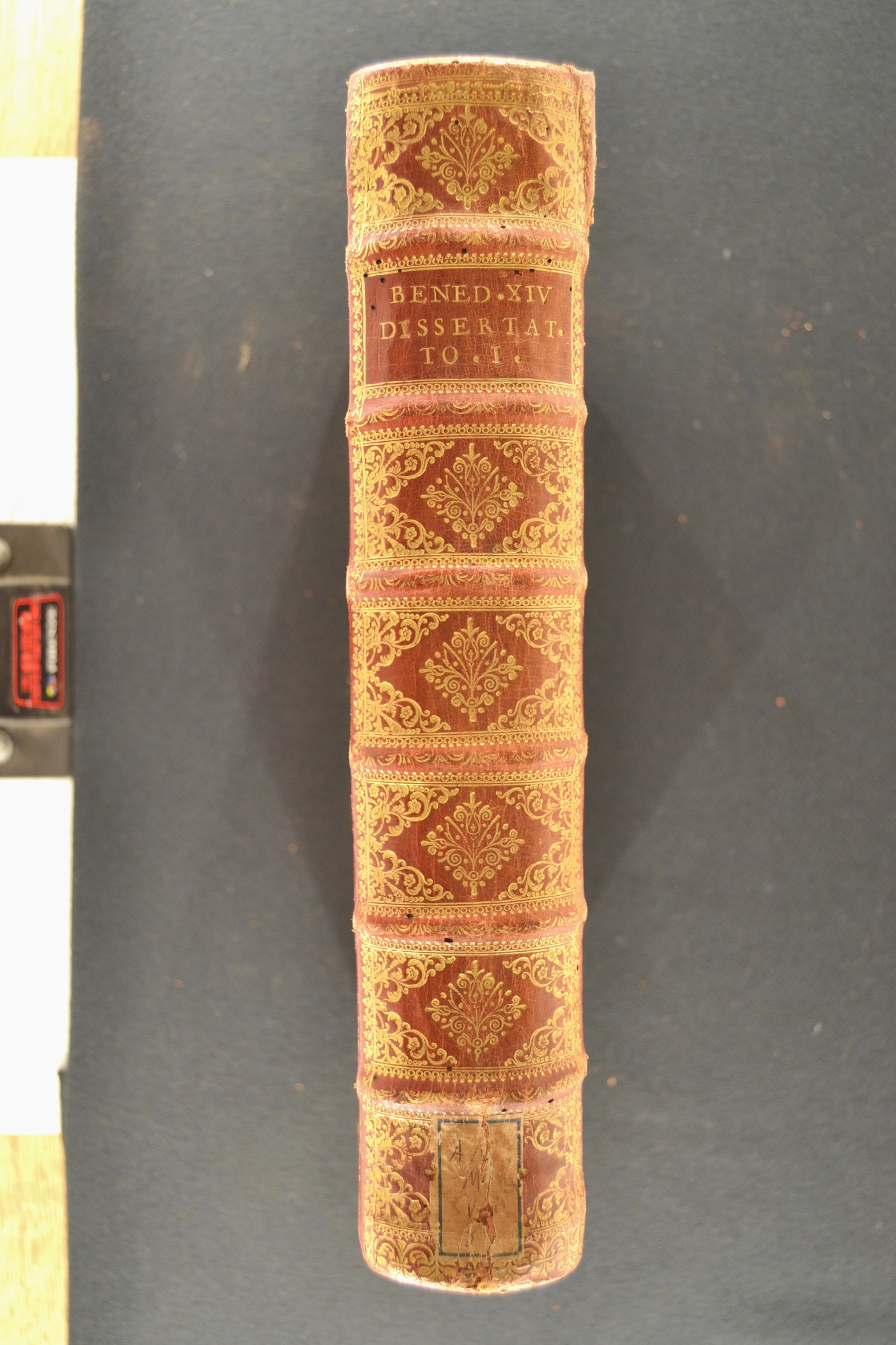 Benedictus <papa ; 14.>, SS. domini nostri Benedicti 14. Dissertationes in omni doctrinæ genere selectissimæ ex quatuor ejusdem auctoris de canonizatione sanctorum libris extractæ ... in tres partes distributæ. Volumen primum [-tertium] continens dissertationes miscellaneas, Venetiis : excudebat Joannes Baptista Albritius Hier. fil., 1751-1752, 312x208x60 mm.