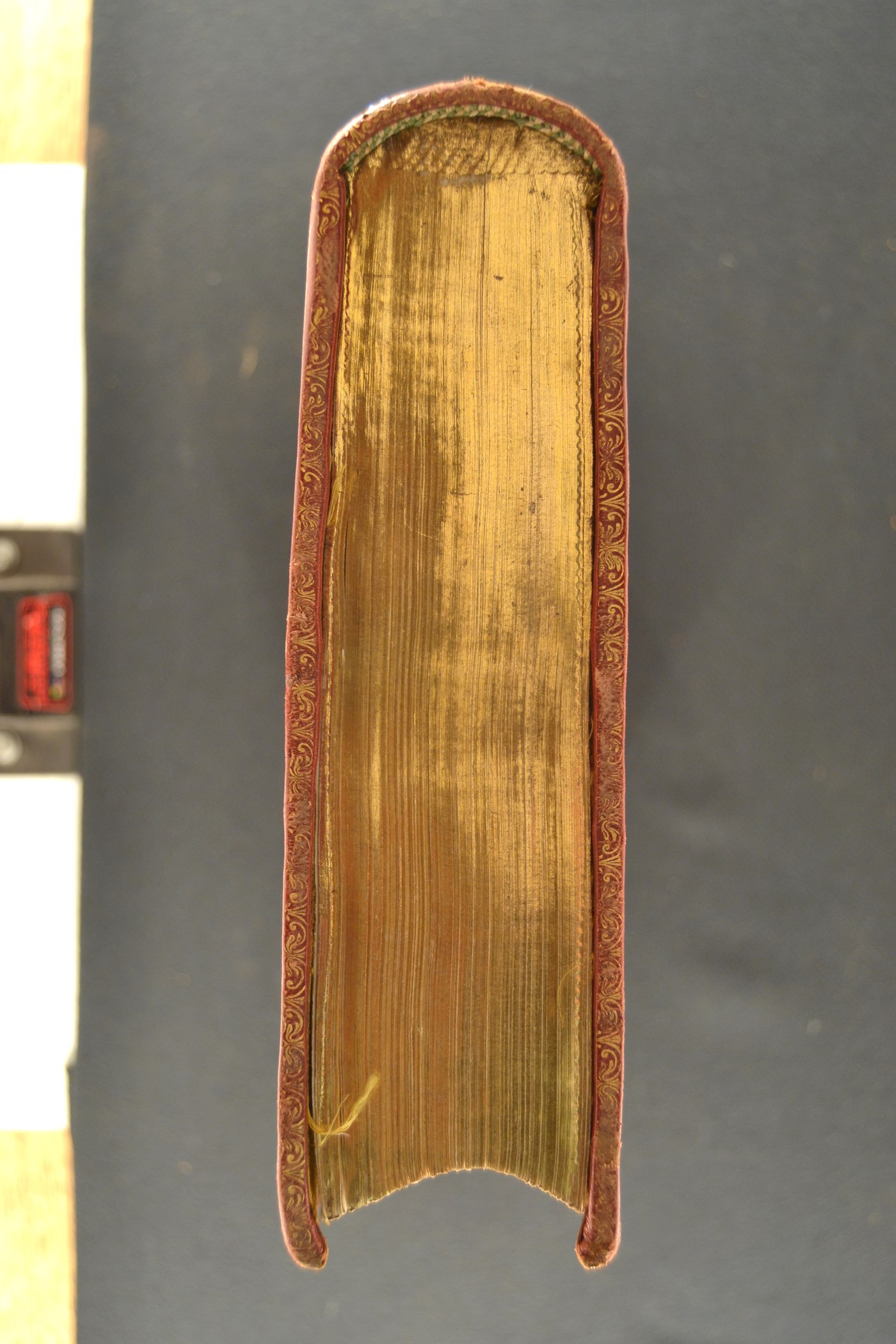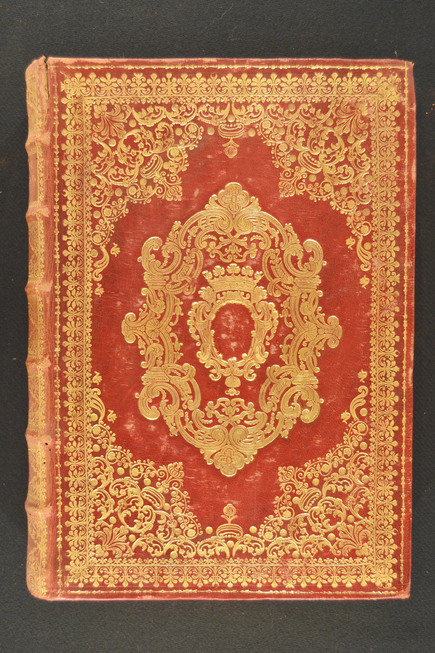 Cuoio di capra rosso su quadranti in cartone decorato in oro. Cornice caratterizzata da archi sormontati da gigli e fregi fitomorfi lungo il margine interno dello specchio. Ampia placca (170x125 mm) di foggia orientaleggiante. Punte alternate a corolle stilizzate, grottesche, fogliami, fiorami, cerchielli pieni. Scompartimenti del dorso riquadrati. Nel secondo, il nome dell’autore, il titolo dell’opera e la partizione del volume; rami fronzuti mossi, fiorami negli angoli interni e fregio fitomorfo centrale in quelli residui. Capitelli muniti di anima circolare avvolta da fili in seta bianca e verde. Cucitura su sei nervi rilevati. Indorsatura non osservabile. Labbri ornati con fogliami. Rimbocchi accuratamente rifilati. Carte di guardia in tessuto dorato e bianche. Tagli dorati incisi. Stato di conservazione: discreto. Marginali spellature al materiale di copertura. Cerniera indebolita in testa al piatto anteriore. Angoli ricurvi.