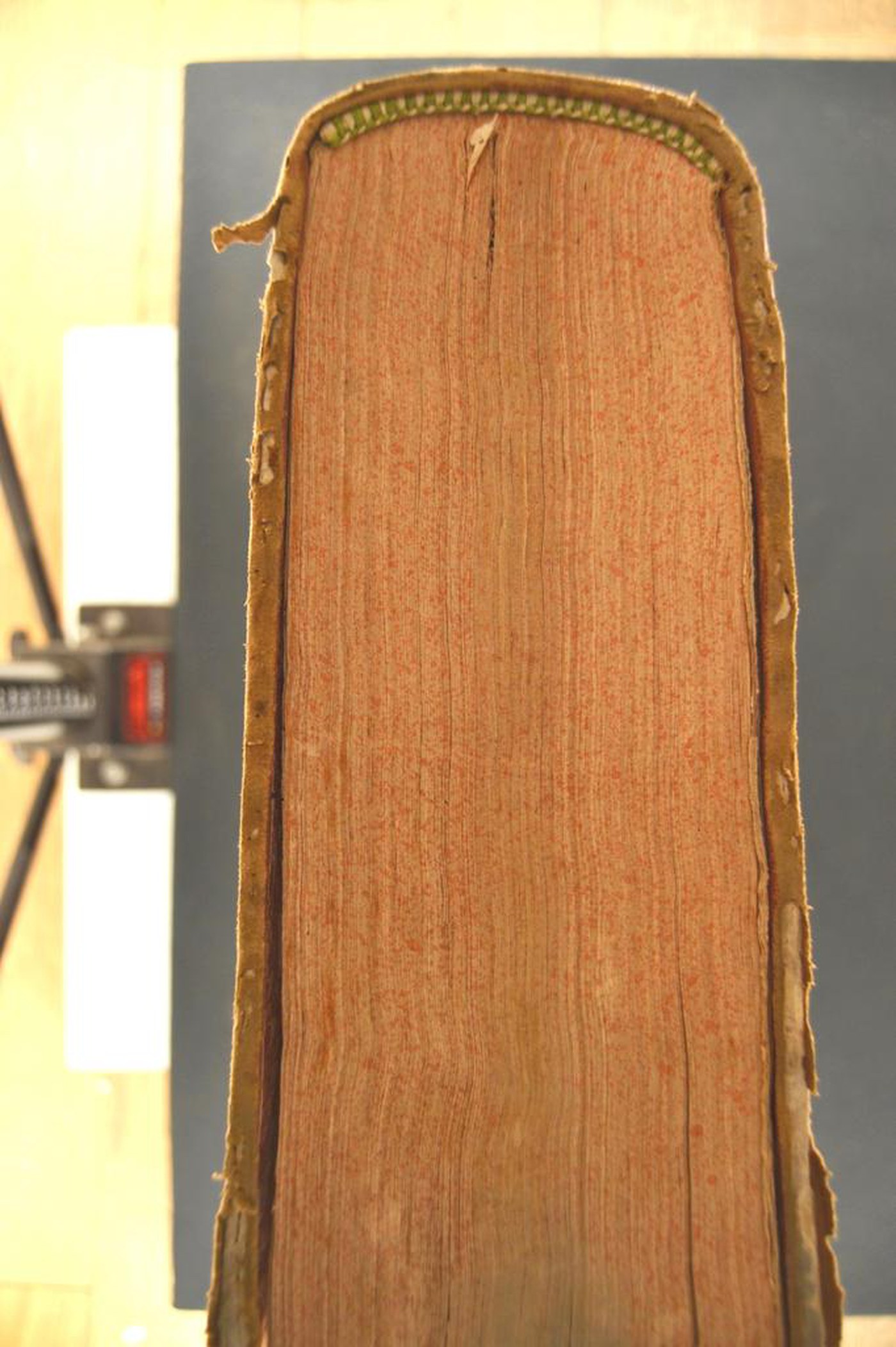 L’impianto ornamentale, le testine classiche pure riscontrate in produzioni seicentesche romane, la cartella al dorso dai margini parzialmente arcuati propongono di assegnare la legatura alla prima metà del XVII secolo, eseguita in Francia. In evidenza i contropiatti rivestiti da foglio di carta marmorizzata policroma e i tagli spruzzati.