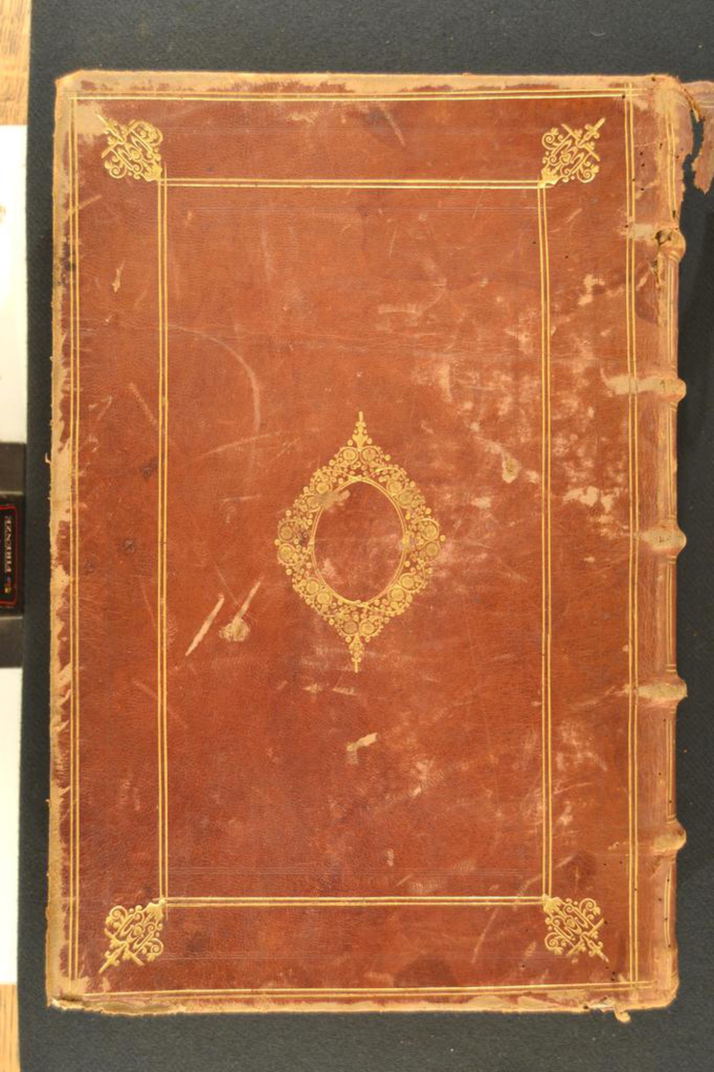 Cuoio di capra marrone su quadranti in cartone decorato in oro. Coppia di due cornici concentriche costituite da due filetti. Testina classica negli angoli esterni. Cartella centrale muta entro corolle stilizzate, grottesche, fiorami, cerchielli bucati. Scompartimenti del dorso riquadrati. Nel secondo, entro cartella dai margini parzialmente ricurvi, il titolo dell’opera; quattro corolle addossate delimitate da altrettante perle degradanti centrali in quelli residui. Capitelli muniti di anima circolare avvolta da fili in seta bianca e verde. Cucitura su nervi rilevati. Indorsatura non osservabile. Rimbocchi accuratamente rifilati; risvolti laterali collocati sopra quelli di testa e di piede. Contropiatti rivestiti da foglio di carta marmorizzata policroma pettinata. Carte di guardia bianche. Tagli spruzzati di rosso. Stato di conservazione: mediocre. Materiale di copertura spellato. Angoli ricurvi e sbrecciati al piede.