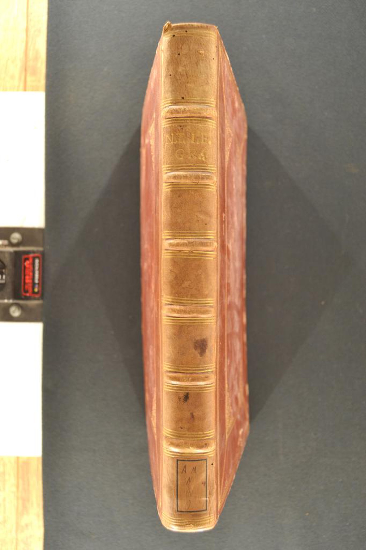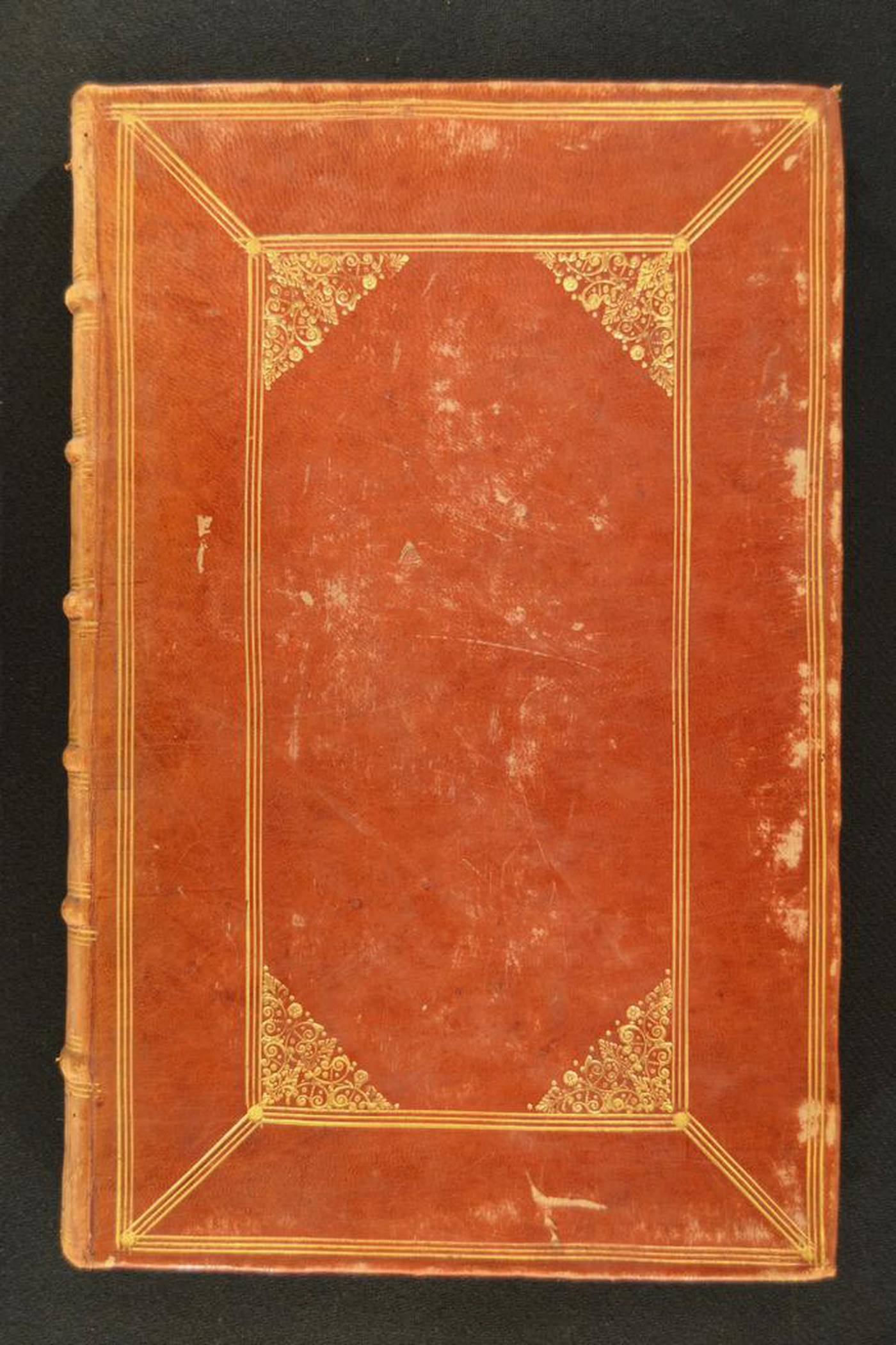 Cuoio di bazzana marrone su quadranti in cartone decorato in oro. Coppia di cornici concentriche a fascio di tre filetti collegate negli angoli. Corolle stilizzate, grottesche, rosette, cerchielli pieni negli angoli interni dello specchio. Nel secondo scompartimento del dorso il titolo dell’opera abbreviato. Capitelli muniti di anima circolare avvolta da fili in seta bianca e rosso mattone. Cucitura su sei nervi rilevati. Indorsatura realizzata tramite alette orizzontali cartacee Rimbocchi rifilati senza particolare cura. Carte di guardia bianche. Tagli dorati brillanti. Stato di conservazione: discreto. Spellature al materiale copertura dalla tonalità scolorita lungo il dorso. Volume restaurato.