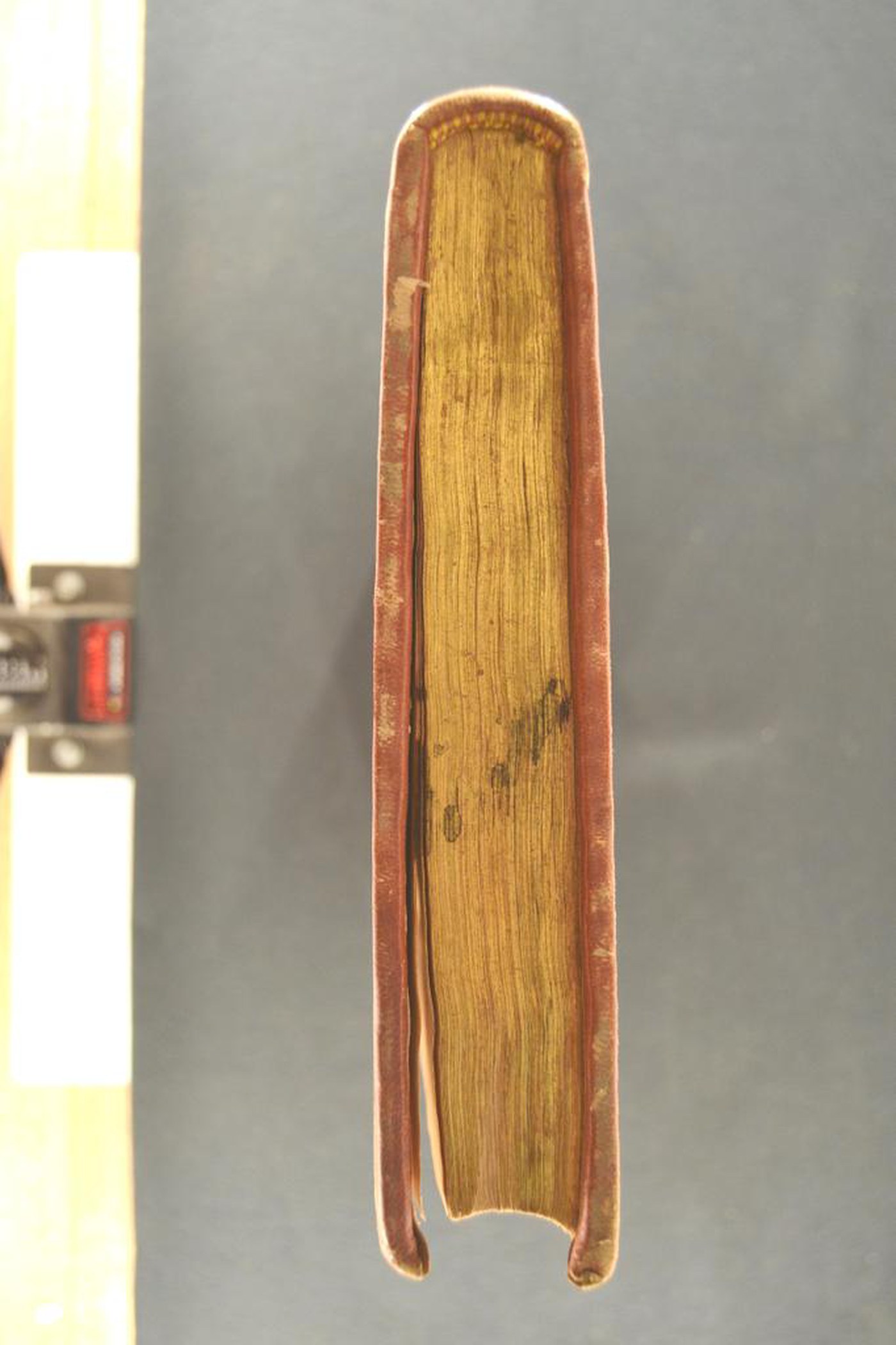 L’impianto ornamentale, i fregi e i tagli dorati brillanti inducono ad assegnare la legatura al (primo quarto[?]) XVIII secolo. In evidenza i tagli dorati.