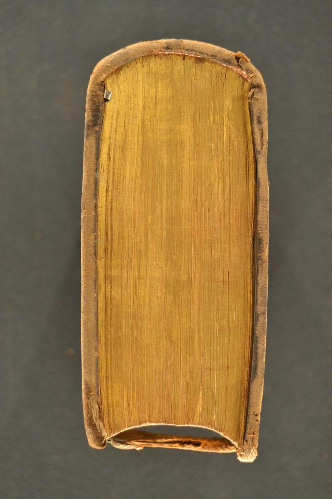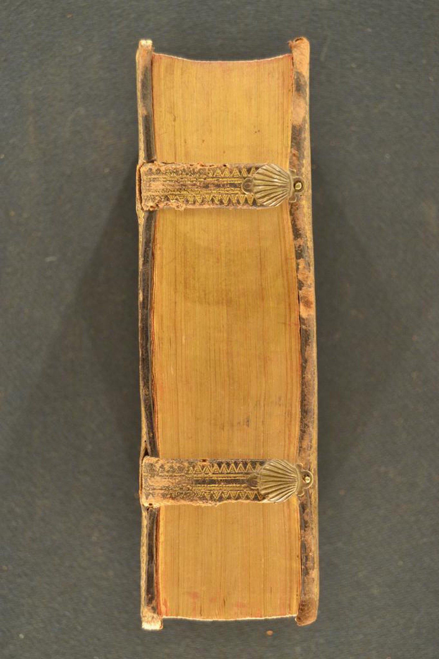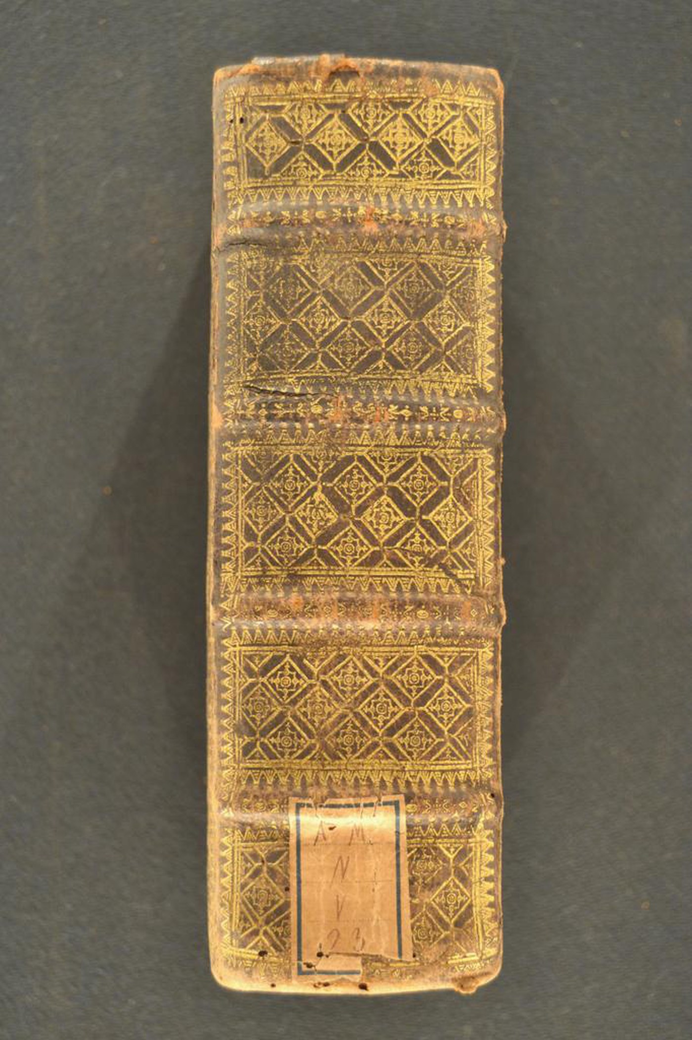 Cuoio di bazzana bruno su quadranti in cartone decorato in oro. Cornice dal margine esterno a punte, caratterizzata da cerchielli muti sormontati da palmette alternate a corolle stilizzate. Due rosette entro altrettante cuspidi sormontate da mezzo ventaglio negli angoli interni dello specchio, ripreso sotto forma di rosone provvisto del titolo dell’opera al centro affiancato da un paio di cuspidi. Coppia di fermagli costituiti da altrettante bindelle in cuoio di bazzana bruno con puntale in forma di conchiglia metallica nervata munita di occhiello, inserite sotto il corame, assicurate a mezzo di tre chiodi metallici a testa piatta e da un paio di tenoni in metallo inseriti nel labbro del supporto posteriore. Scompartimenti del dorso riquadrati, provvisti di seminato di minute rosette entro sfondo quadrangolare. Capitelli muniti di anima circolare avvolta da fili in seta bianca e rosa. Cucitura su quattro nervi rilevati. Indorsatura realizzati tramite aletta verticale cartacea. Rimbocchi discretamente rifilati. Carte di guardia marmorizzate policrome pettinate. Tagli dorati. Stato di conservazione: discreto. Spellature al materiale di copertura.