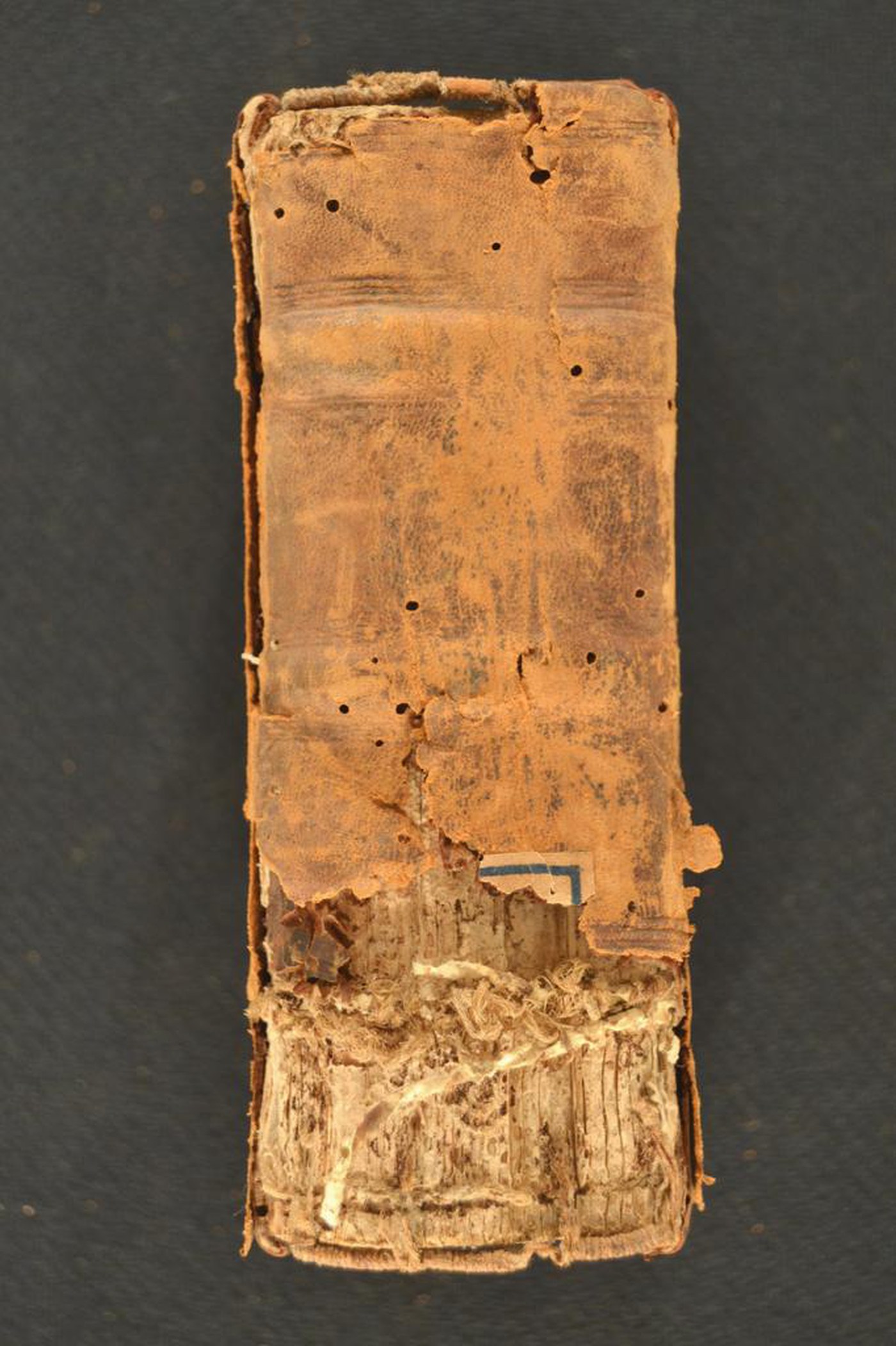 Cuoio bruno su quadranti in cartone decorato a secco e in oro. Coppia di filetti bruniti concentrici. Fregio fitomorfo negli angoli esterni del riquadro interno. Placca centrale fogliata (35x22 mm). Capitelli muniti di anima spezzata avvolta da fili in canapa. Cucitura su tre nervi in pelle allumata rilevati. Indorsatura realizzata tramite alette orizzontali cartacee. Rimbocchi rifilati senza particolare cura. Carte di guardia assenti. Tagli rustici. Stato di conservazione: mediocre. Materiale di copertura originale (in parte spellato) scomparso, quindi parzialmente restaurato. Piatto anteriore in fase di distacco.