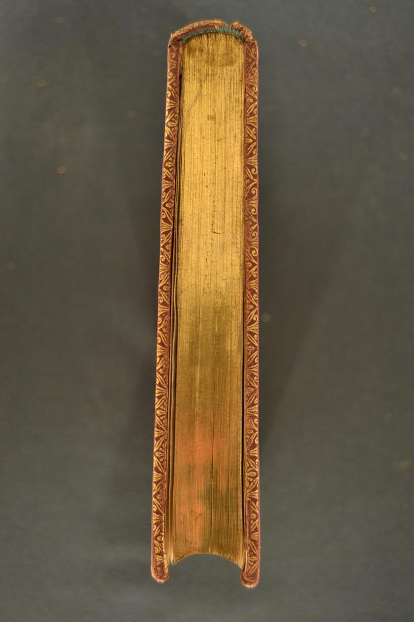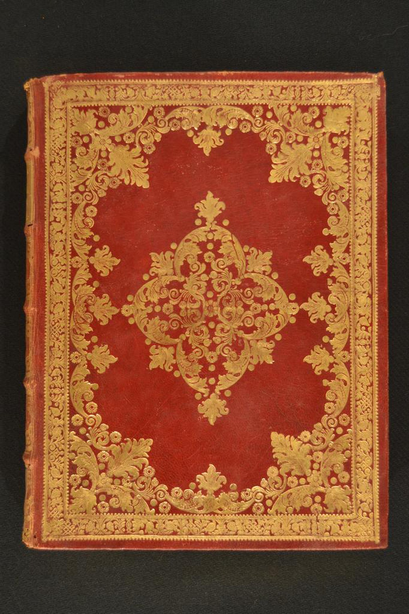 Cuoio di capra rosso su quadranti in cartone decorato in oro. Cornice caratterizzata da fogliami e frutti. Margini interni dello specchio provvisti di rosette pentalobate, fronde, cerchielli pieni, motivi ripresi nell’ampia cartella centrale. Scompartimenti del dorso riquadrati. Nel secondo, il titolo dell’opera entro tassello in cuoio nocciola; fiorame e fogliame negli angoli interni congiuntamente al fregio fitomorfo centrale in quelli residui. Capitelli muniti di anima circolare avvolta da fili in lino turchese. Cucitura su cinque nervi rilevati. Indorsatura non osservabile. Labbri ornati a pizzo. Rimbocchi accuratamente rifilati. Carte di guardia marmorizzate policrome pettinate e bianche. Tagli dorati brillanti incisi. Stato di conservazione: discreto - buono, Marginali gore brune al materiale di copertura dalla tonalità scolorita lungo il dorso.