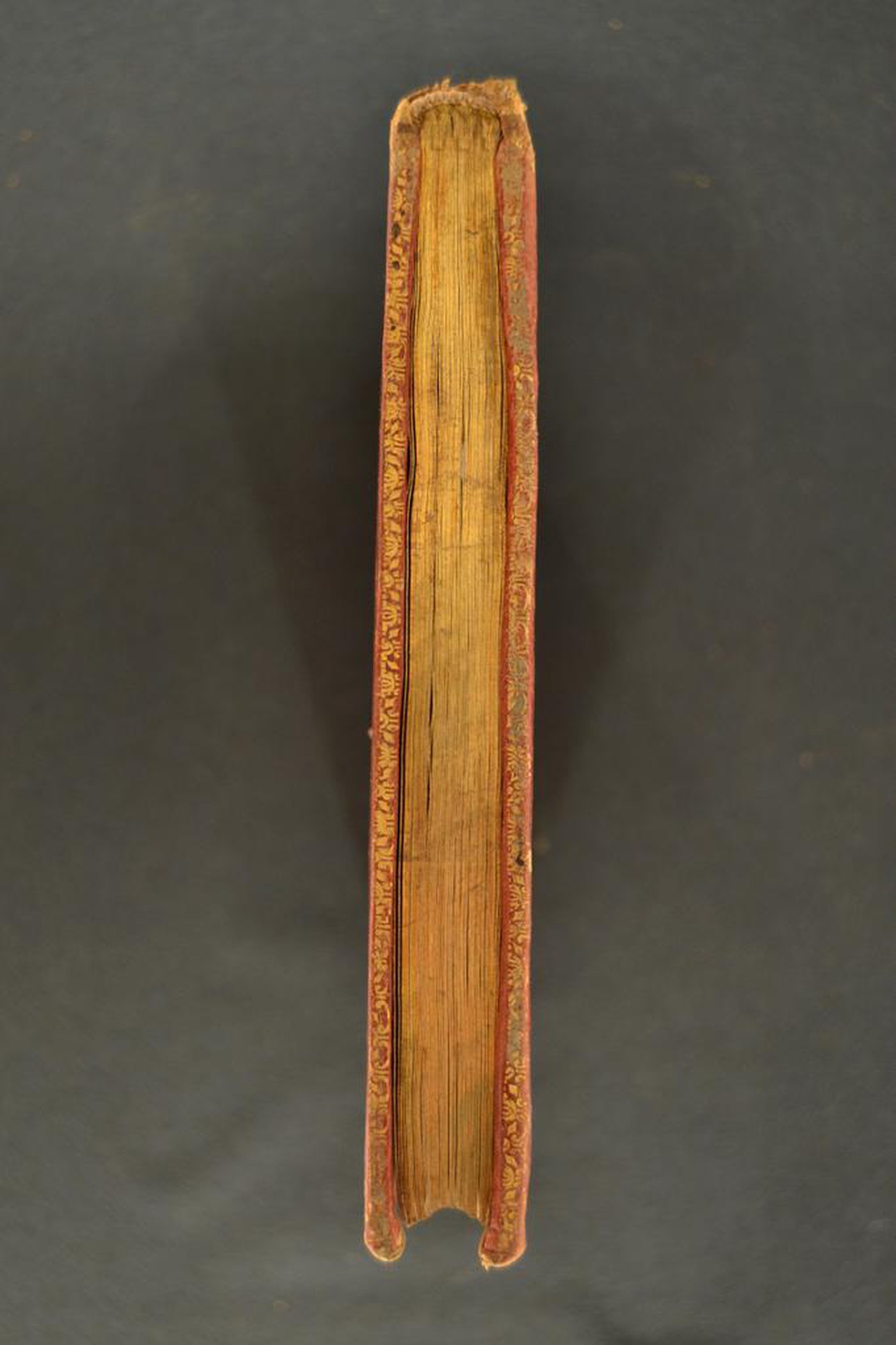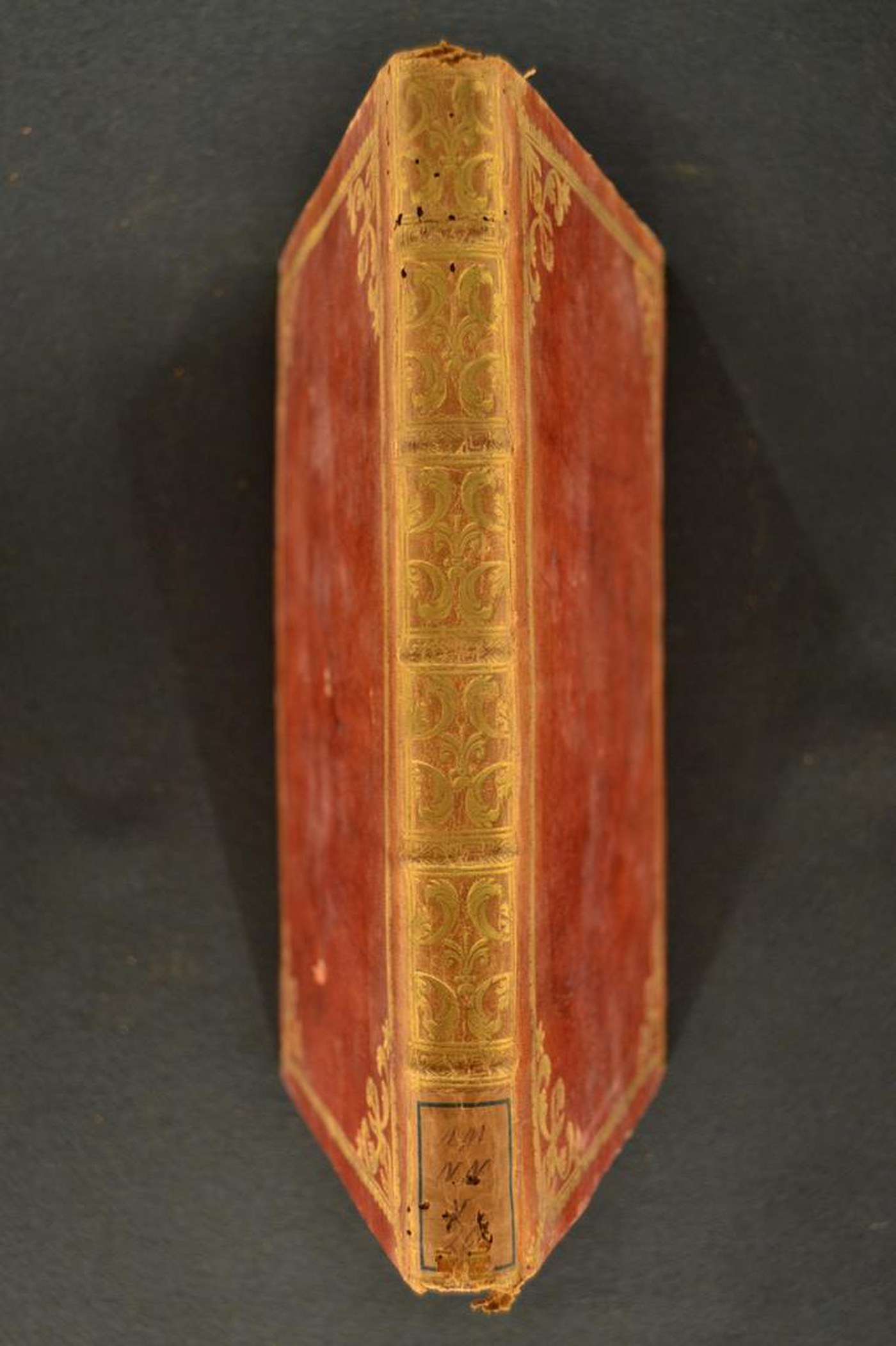 I fregi non riferibili ad una bottega in particolare, il carattere economico della pubblicazione, l’argomento del testo dalla probabile limitata diffusione e le note tipografiche inducono ad assegnare la legatura al terzo quarto del XVIII secolo, verosimilmente eseguita a Napoli. In evidenza i contropiatti rivestiti da foglio in carta marmorizzata policroma e i tagli dorati brillanti incisi.