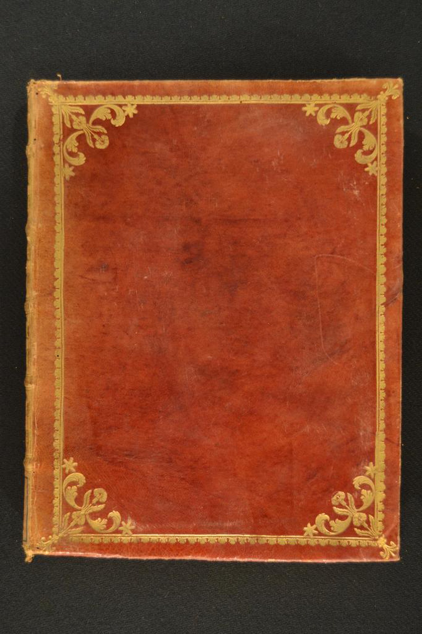 Cuoio di bazzana marrone su quadranti in cartone decorato in oro. Cornice caratterizzata da minuti fogliami svasati e da filetto. Margine interno dello specchio provvisto di fiorami, fronde, stelle a sei punte. Scompartimenti del dorso riquadrati; voluta fogliata e corolla stilizzata centrale. Capitelli muniti di anima circolare avvolta da fili in canapa. Cucitura su cinque nervi rilevati. Indorsatura realizzata tramite alette orizzontali cartacee. Labbri ornati con corolle stilizzate. Rimbocchi accuratamente rifilati. Contropiatti rivestiti da foglio in carta marmorizzata policroma pettinata. Carte di guardia bianche. Tagli dorati brillanti incisi. Stato di conservazione: discreto. Bruniture al materiale di copertura dalla tonalità scolorita lungo il dorso.