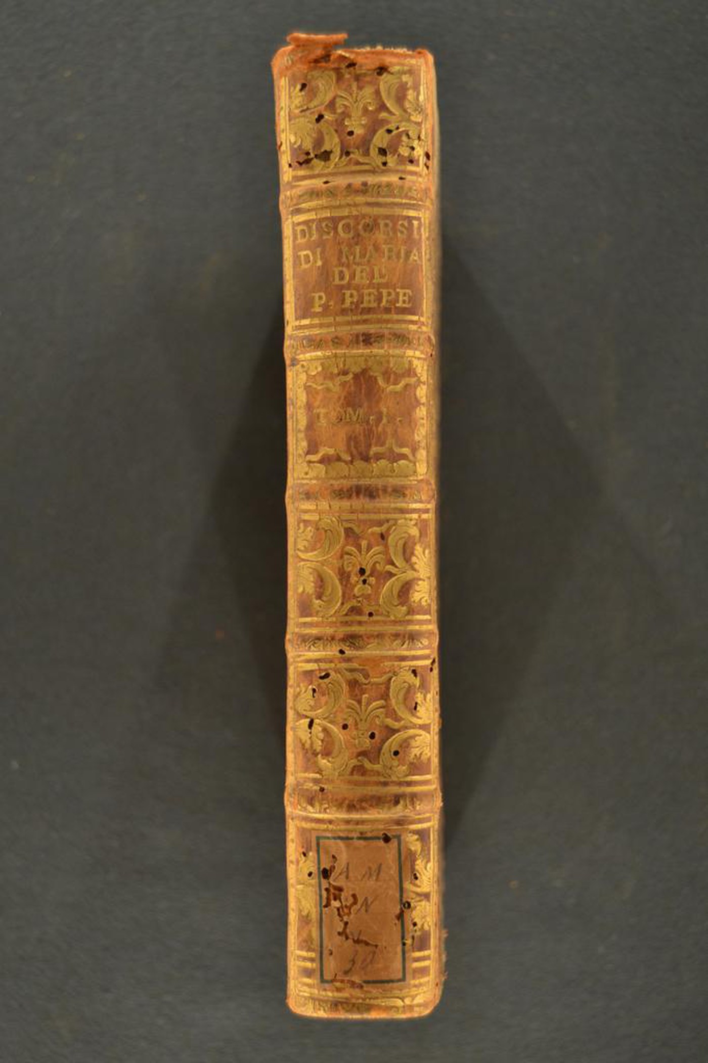 Pepe, Francesco <sec. 18.>, Discorsi in lode di Maria Santissima per tutt'i sabbati dell'anno di Francesco Pepe della Compagnia di Gesù. Tomo primo (-secondo), In Napoli : presso Benedetto Gessari, 1756, 242x185x41 mm.