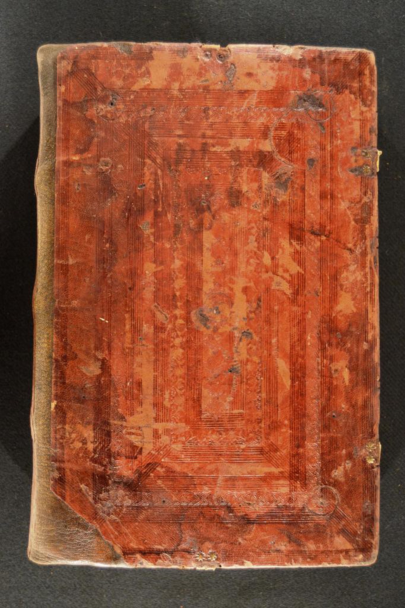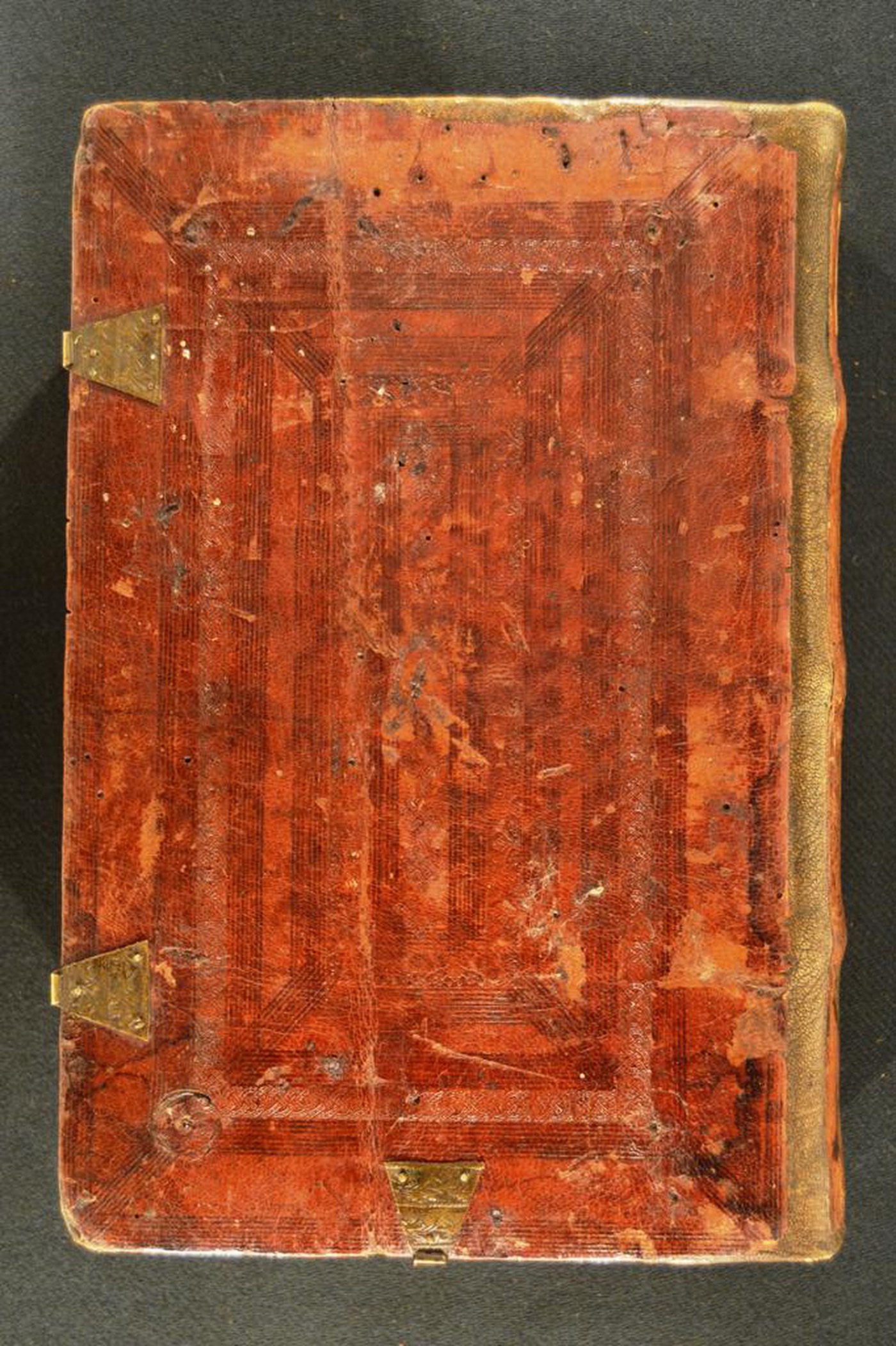Cuoio di bazzana su assi lignee smussate ai contro piatti in corrispondenza dei tagli, decorato a secco. Fasci di filetti concentrici collegati agli angoli. Cornici caratterizzate da doppi nodi e fregi fitomorfi. Quattro nodi entro sfondo losangato disposti verticalmente nello specchio. Tracce di quattro borchie entro sfondo circolare e di fermagli costituirti da altrettante bindelle in cuoio dall’anima in pergamena assicurate a mezzo di due chiodi metallici al piatto anteriore e da due paia di contrograffe (scomparsa quella di testa) in ottone sotto forma di trapezio ancorate a quello posteriore. Capitelli restauro. Cucitura su tre nervi rilevate. Indorsatura, rimbocchi e carte di guardia rifatte, anche coeve queste ultime. Tagli rustici. Stato di conservazione: mediocre. Diffuse spellature e bruniture al materiale di copertura. Restauro Pietro Gozzi, Modena, 1983.