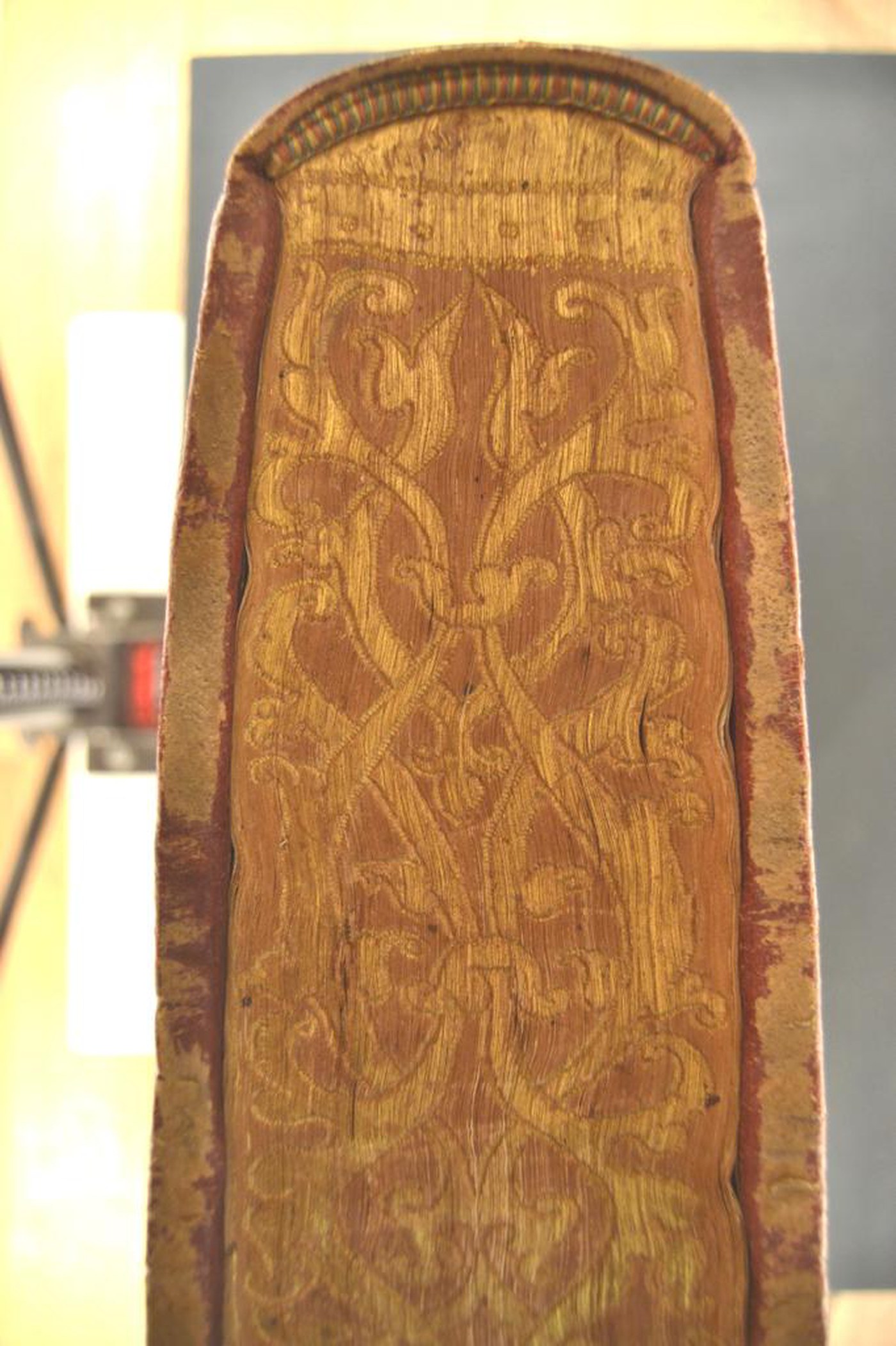L’impianto ornamentale à la Du Seuil, l’indorsatura realizzata tramite aletta in foggia di trapezio e i capitelli a doppia anima propongono di attribuire la legatura alla prima metà del XVII secolo eseguita in Francia. In evidenza i tagli dorati incisi: l’ornamento, congruente con la data di stampa del testo considerati i nastri intrecciati e non con il periodo di produzione del manufatto, segnala che non si tratta probabilmente della prima copertura. Testo réglé.