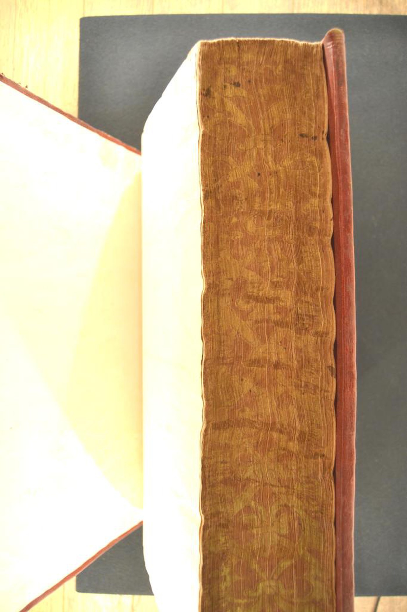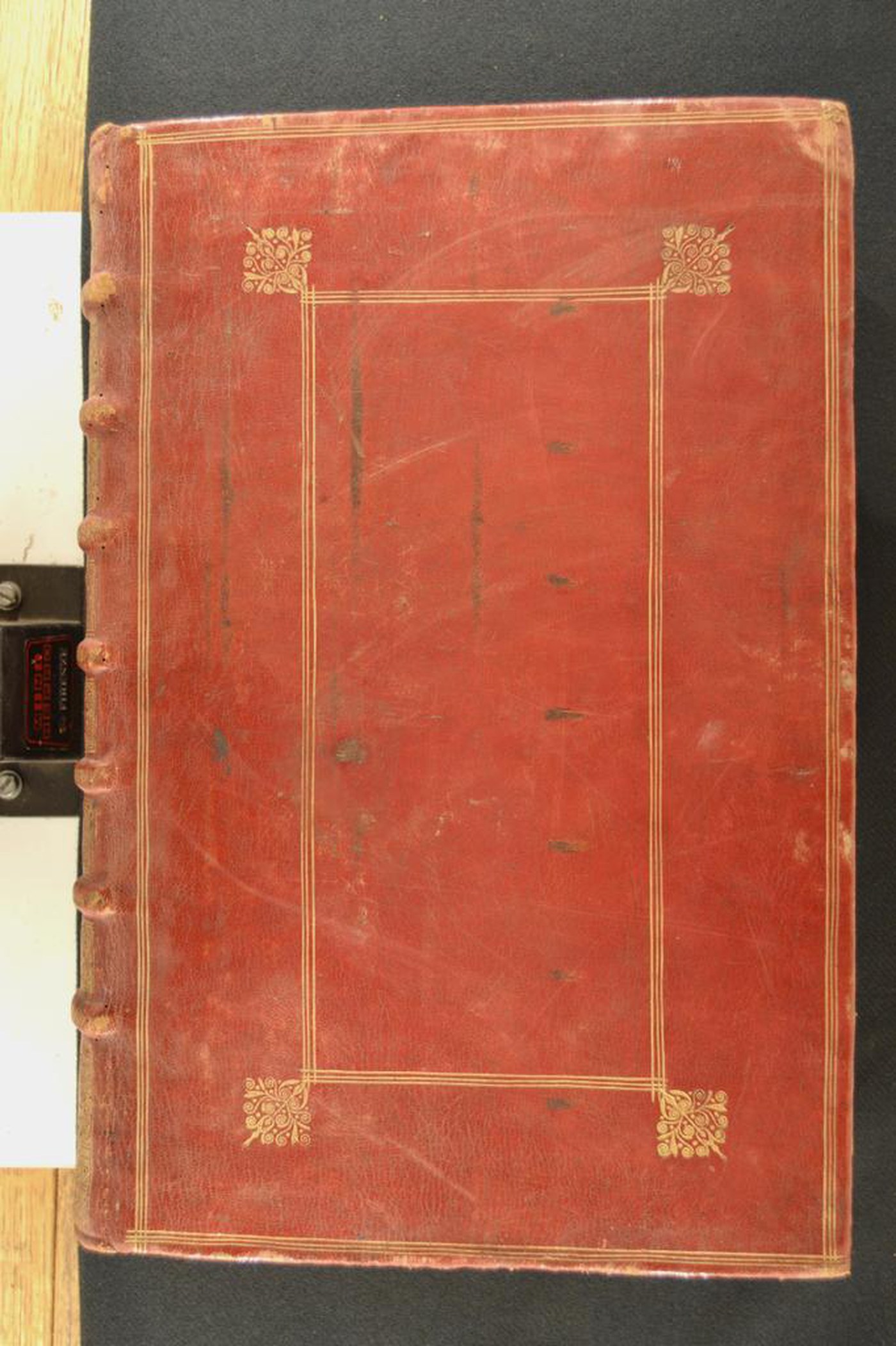 Cuoio di capra rosso su quadranti in cartone decorato in oro. Coppia di fasci di filetti concentrici. Fregio fitomorfo su sfondo quadrangolare negli angoli esterni del riquadro residuo. Scompartimenti del dorso riquadrati. Capitelli muniti di due anime avvolte da fili in seta azzurra, rossa e bianca. Cucitura su sette nervi rilevati. Indorsatura realizzata tramite aletta sotto forma di trapezio. Labbri muti. Rimbocchi discretamente rifilati; risvolti laterali collocati sopra quelli di testa e di piede. Carte di guardia. Tagli dorati incisi. Stato di conservazione: discreto. Gore brune e spellature ai piatti Spellature al piede dei piatti.