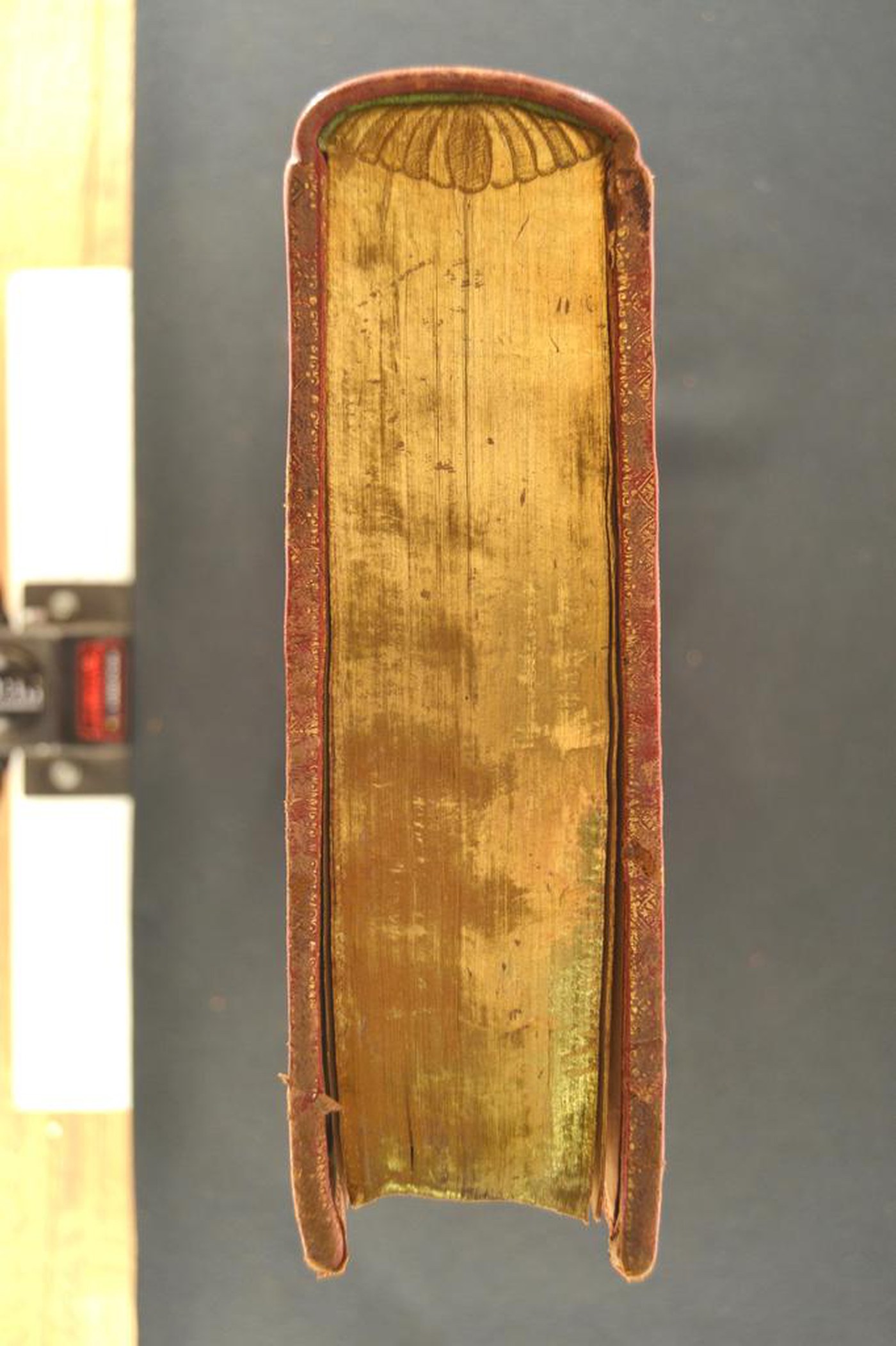 I fregi e le note tipografiche propongono di assegnare la legatura alla fine del XVII – inizio del XVIII secolo, eseguita in area tedesca. In evidenza le carte di guardia dorate in parte ossidate, il margine dei contropiatti ornati a pizzo, i tagli dorati brillanti incisi e gli ampi valori di unghiatura che non danno qui adito al sospetto di rincasso considerato il titolo indicato in testa al dorso congruente con quello dell’opera.