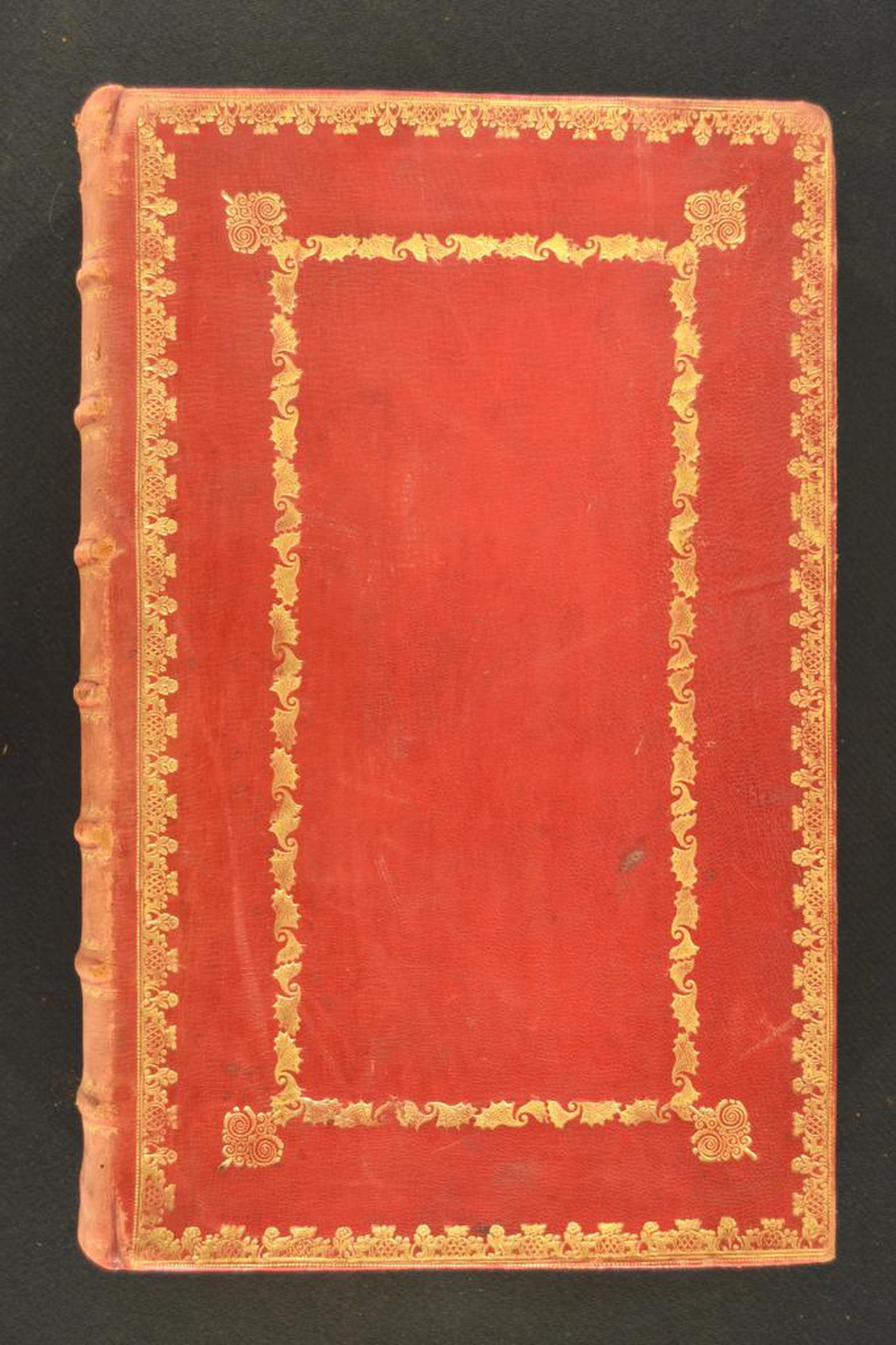 Cuoio di capra rosso su quadranti in cartone decorato in oro. Coppia di cornici concentrici caratterizzate da fiorami alternati a fregi a culla con tralicci, fogliami mossi dai margini arcuati. Coppia di volute filigranate sormontate da corolla stilizzata negli angoli esterni del riquadro interno. Nel secondo scompartimento del dorso il titolo dell’opera. Capitelli muniti di anima circolare avvolta da fili in seta verde. Cucitura su sette nervi rilevati. Indorsatura realizzata tramite alette orizzontali cartacee. Rimbocchi accuratamente rifilati. Margine dei contropiatti ornati a pizzo. Carte di guardia dorate e bianche. Tagli dorati brillanti incisi. Stato di conservazione: discreto. Marginali spellature e bruniture al materiale di copertura. Angoli ricurvi