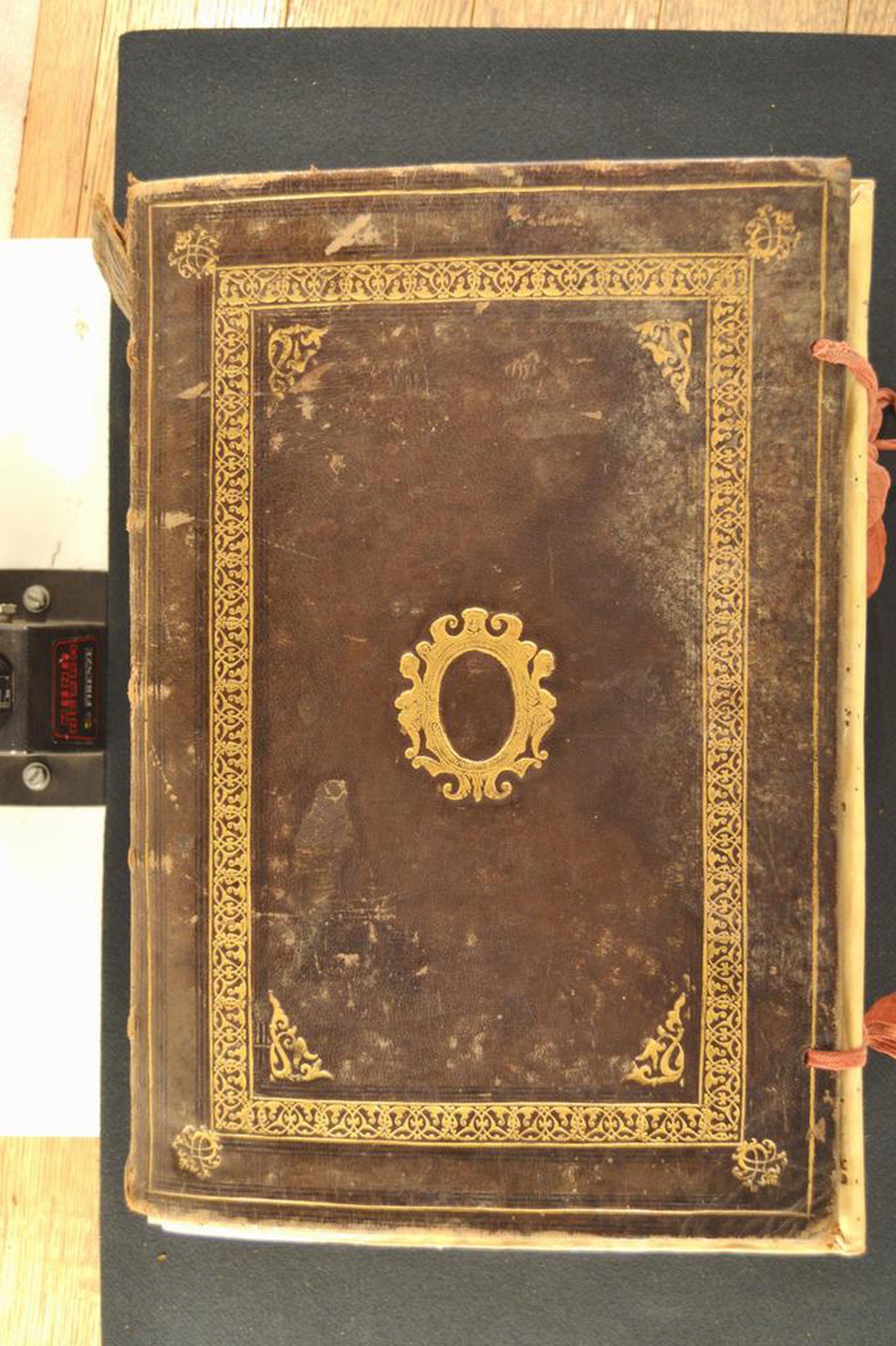 Cuoio di capra oliva su quadranti in cartone decorata a secco e in oro. Filetti concentrici. Cornice caratterizzata da arabeschi; fregi di gusto orientaleggiante negli angoli, parzialmente ripresi negli scompartimenti del dorso. Placca centrale (70x55 mm) internamente muta. Coppia di lacci rifatti. Rimbocchi discretamente rifilati.
