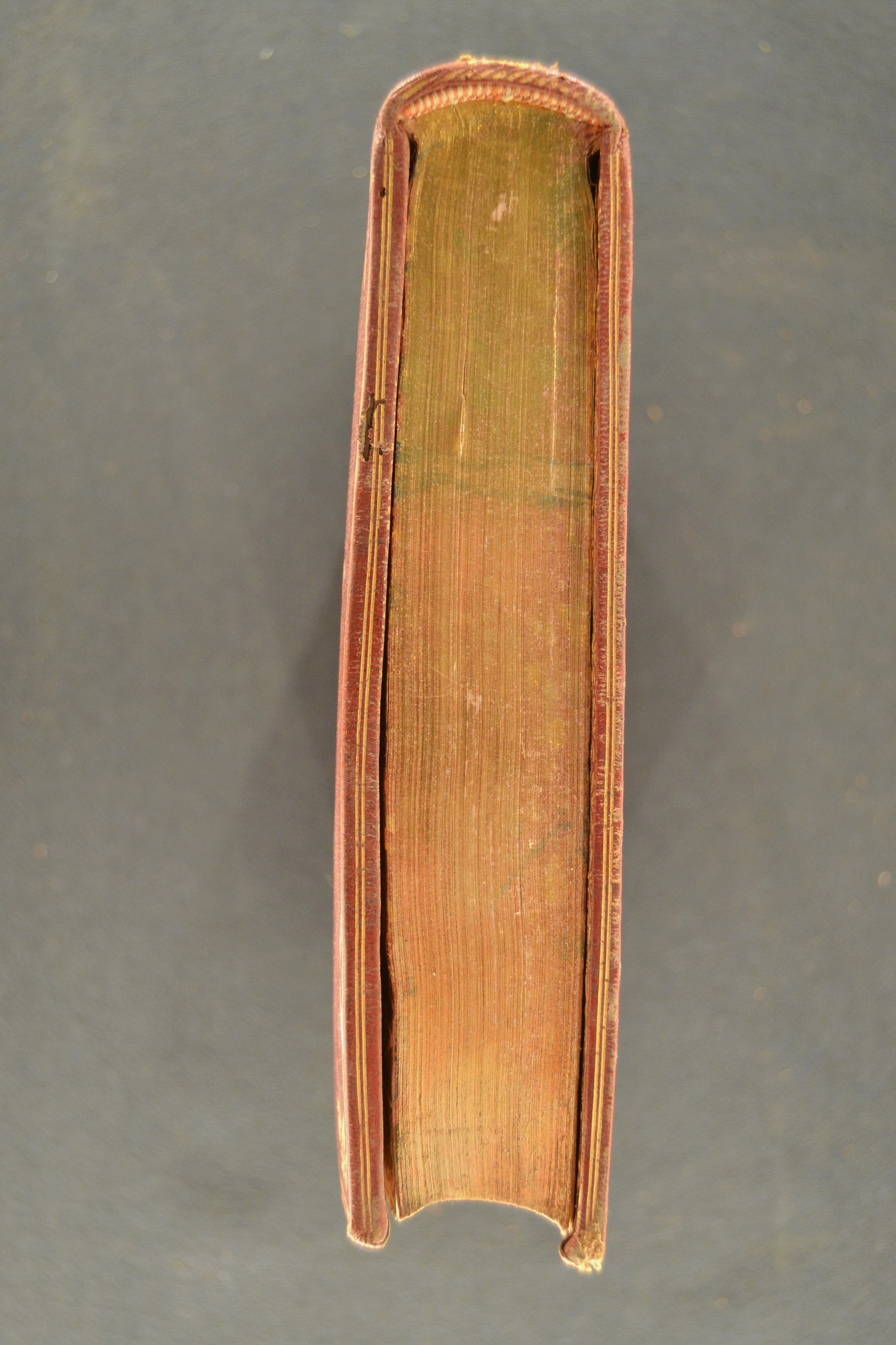 Il genere di manufatto, la cornice all’antica provvista di tre filetti due dei quali ravvicinati, le armi a placca (solitamente assente nelle produzioni coeve nostrane realizzate a filetti) e le note tipografiche propongono di assegnare la legatura verso la metà del XVIII secolo, eseguita in Francia. In evidenza le carte di guardia goffrate realizzate tramite impressione a caldo di matrice calcografica su foglia dorata applicata alla carta tinta in precedenza a macchie variopinte, e i tagli dorati marmorizzati brillanti con tracce del bolo d’Armenia utilizzato come mordente.