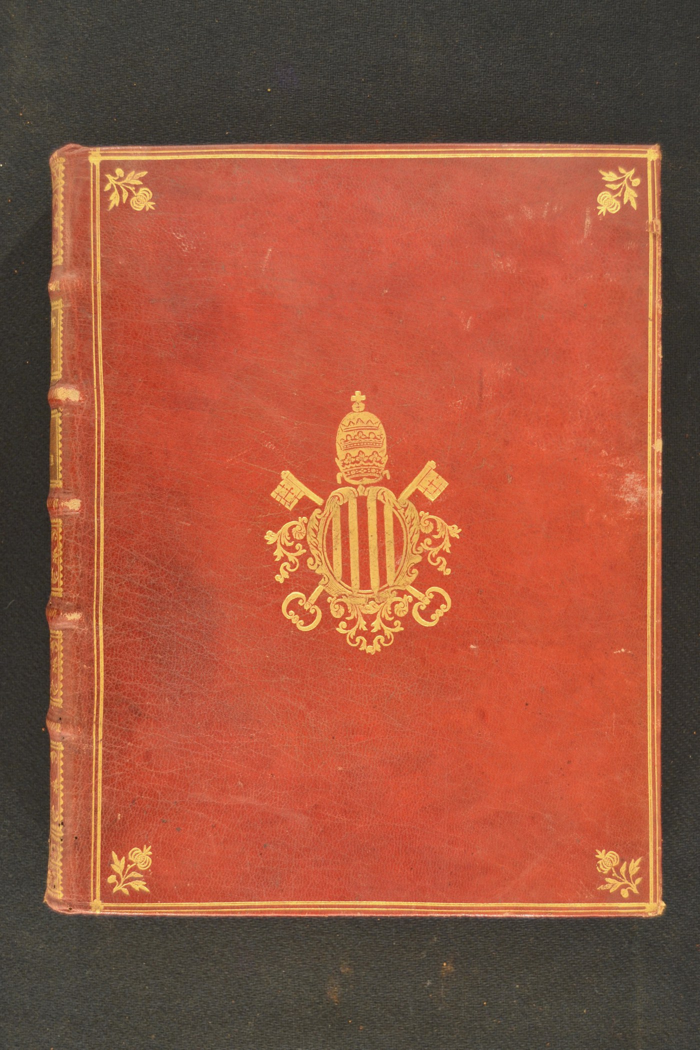 Cuoio di capra rosso su quadranti in cartone decorato in oro. Cornice all’antica centrata da cerchiello pieno in punta d’angolo. Armi (90x60 mm) riferibili al pontefice Benedetto XIV (1740-1758). Scompartimenti del dorso arrotondato riquadrati. Nel secondo e terzo, il titolo dell’opera e la partizione del volume entro il tassello in corame verde oliva; ramo fronzuto negli angoli interni e motivo fitomorfo centrale in quelli residui. Capitelli muniti di anima circolare avvolta da fili in lino bianco e rosso. Cucitura su cinque nervi rilevati. Indorsatura non osservabile. Labbri ornati con due filetti continui. Rimbocchi non osservabili. Margini dei contropiatti caratterizzati da ornamento a pizzo. Carte di guardia goffrate dorate policrome a raffigurare steli fogliati mossi, fiorami, e bianche. Tagli dorati marmorizzati brillanti. Stato di conservazione: discreto. Marginali bruniture e spellature del materiale di copertura.