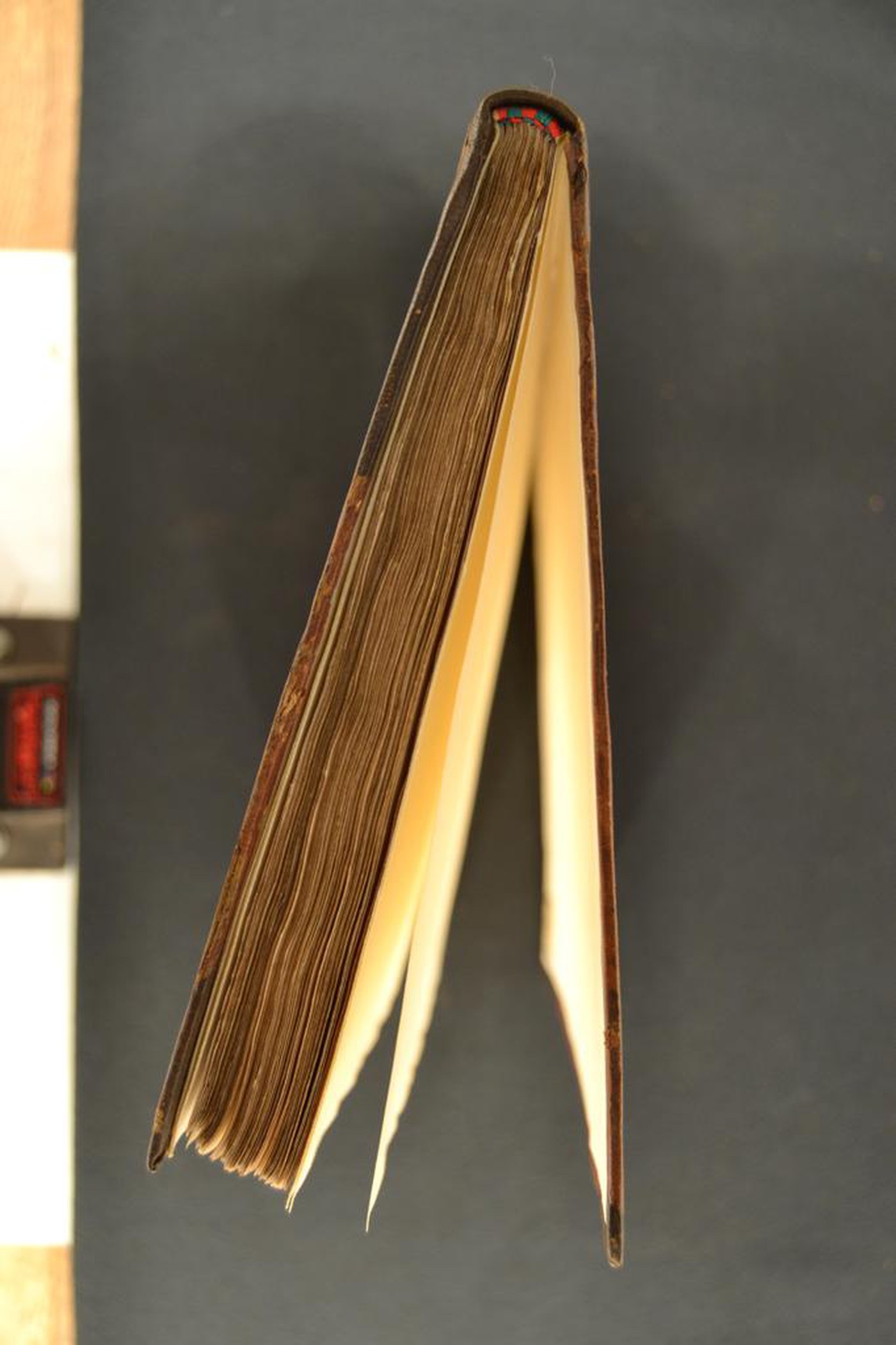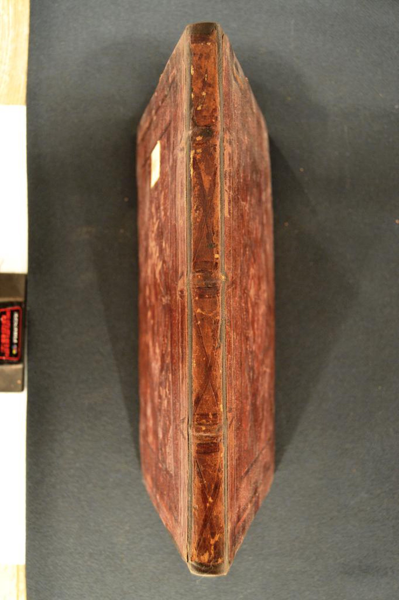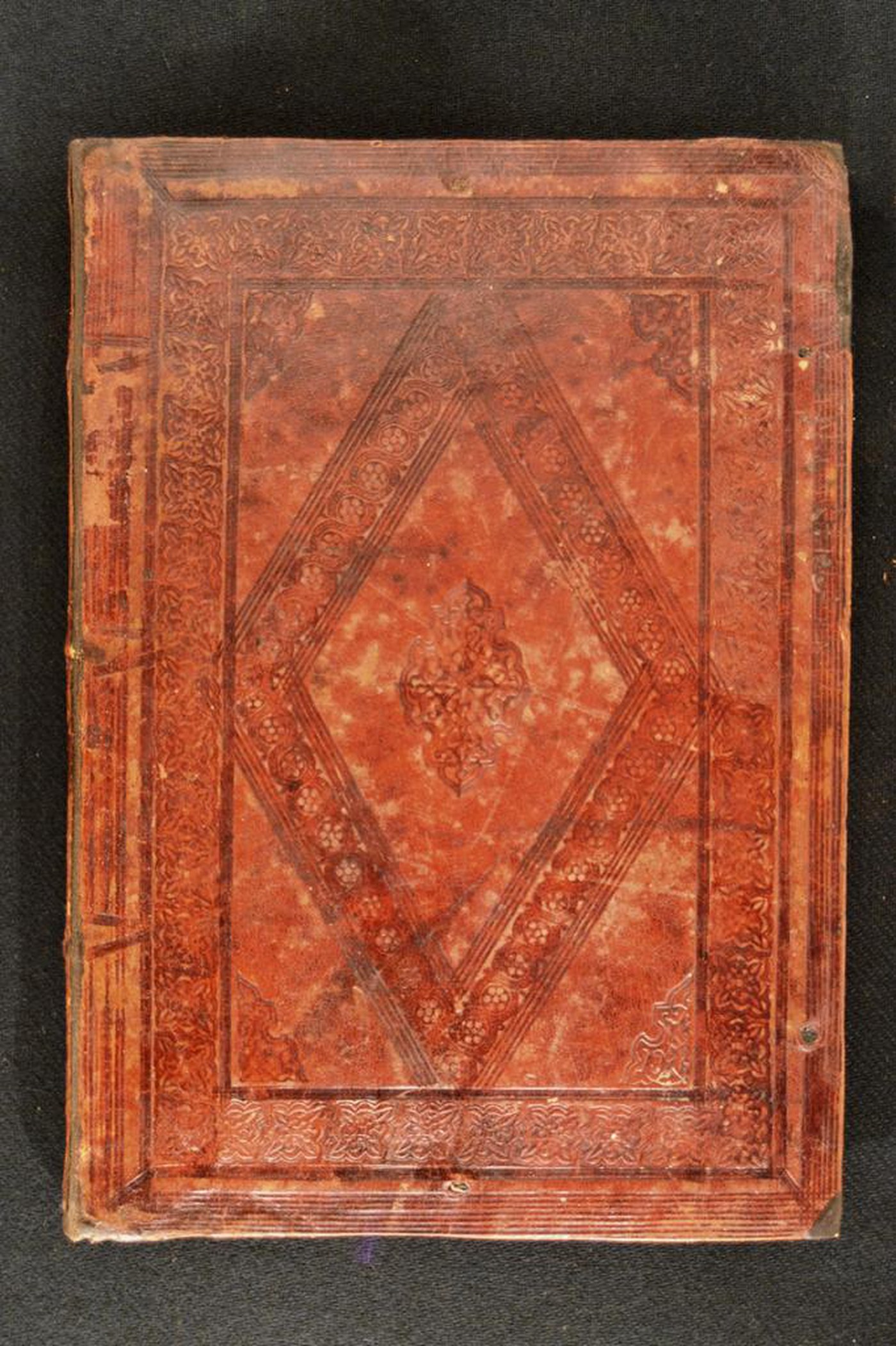 Cuoio di bazzana marrone su quadranti in cartone decorato a secco. Filetti concentrici bruniti in parte collegati agli angoli. Cornice caratterizzata da fregi mamelucchi. Fregio di gusto orientaleggiante negli angoli interni dello specchio, ripresi quattro volte addossati nella mandorla centrale entro ampia losanga ornata con rosette esalobate entro serpentine. Tracce di quattro lacci in tessuto verde. Capitelli, indorsatura, rimbocchi e carte di guardia di restauro. Cucitura su tre nervi rilevati. Tagli rustici. Stato di conservazione: discreto. Fiore parzialmente scomparso. Volume restaurato.