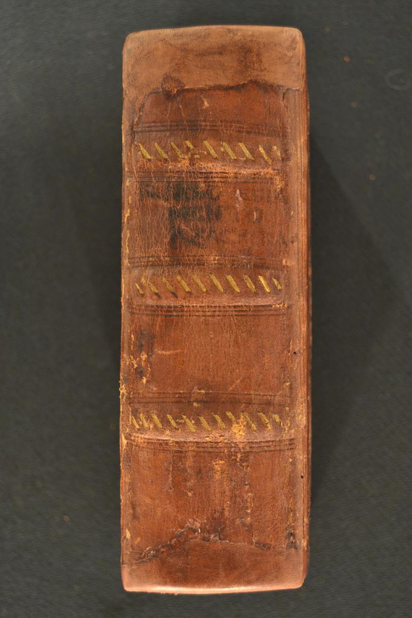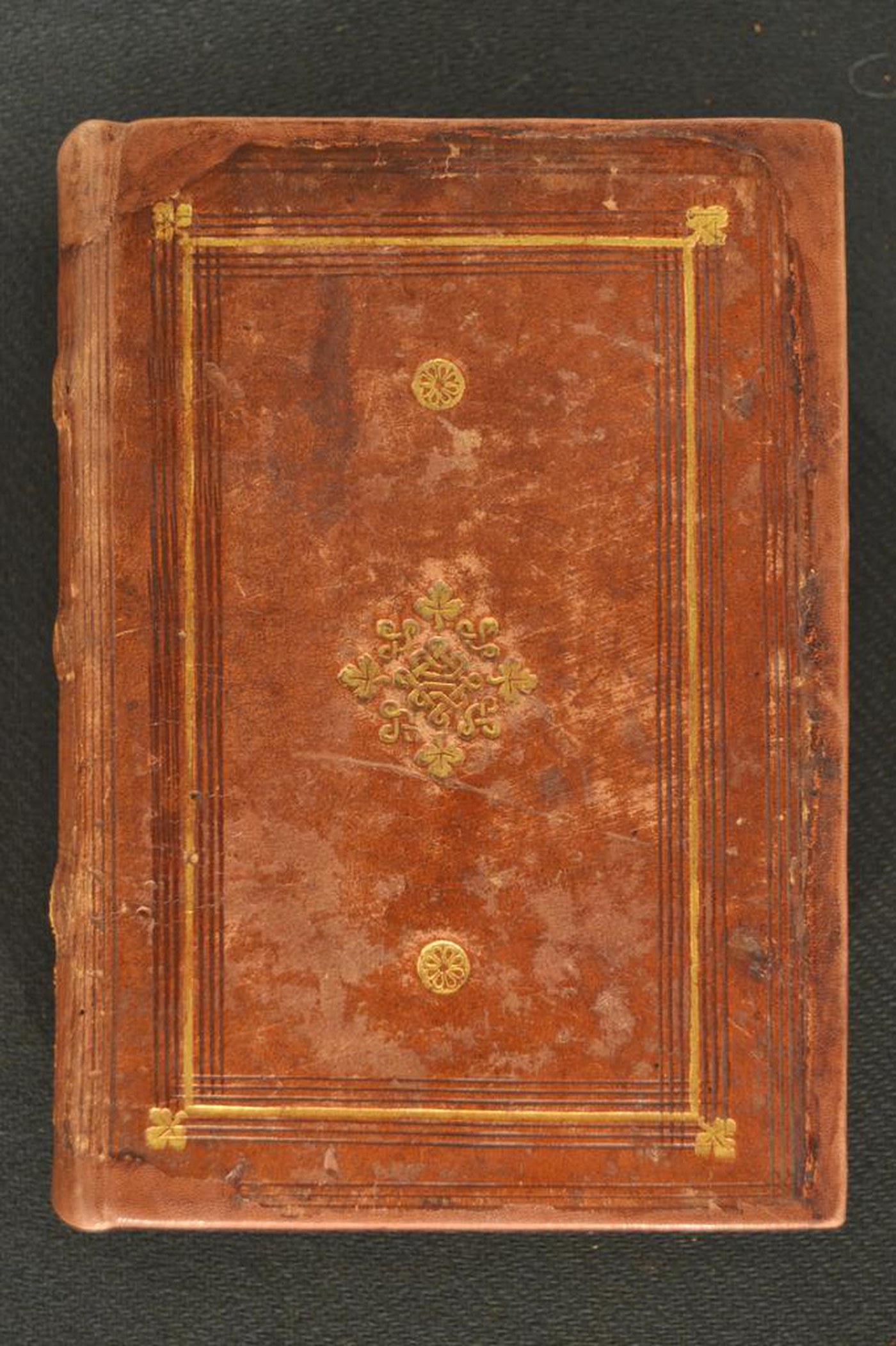 Cuoio di bazzana marrone su quadranti in cartone decorato a secco e in oro. Filetti concentrici. Cornice a filetto. Fogliame trilobato accantonato esterno. Nodo entro sfondo quadrangolare centrale affiancato da due rosette dal margine circolare internamente mute. Capitelli, rimbocchi, carte di guardia rinnovati. Cucitura su tre nervi rilevati tratteggiati. Tagli blu. Stato di conservazione: discreto. Spellature al materiale di copertura. Volume restaurato.