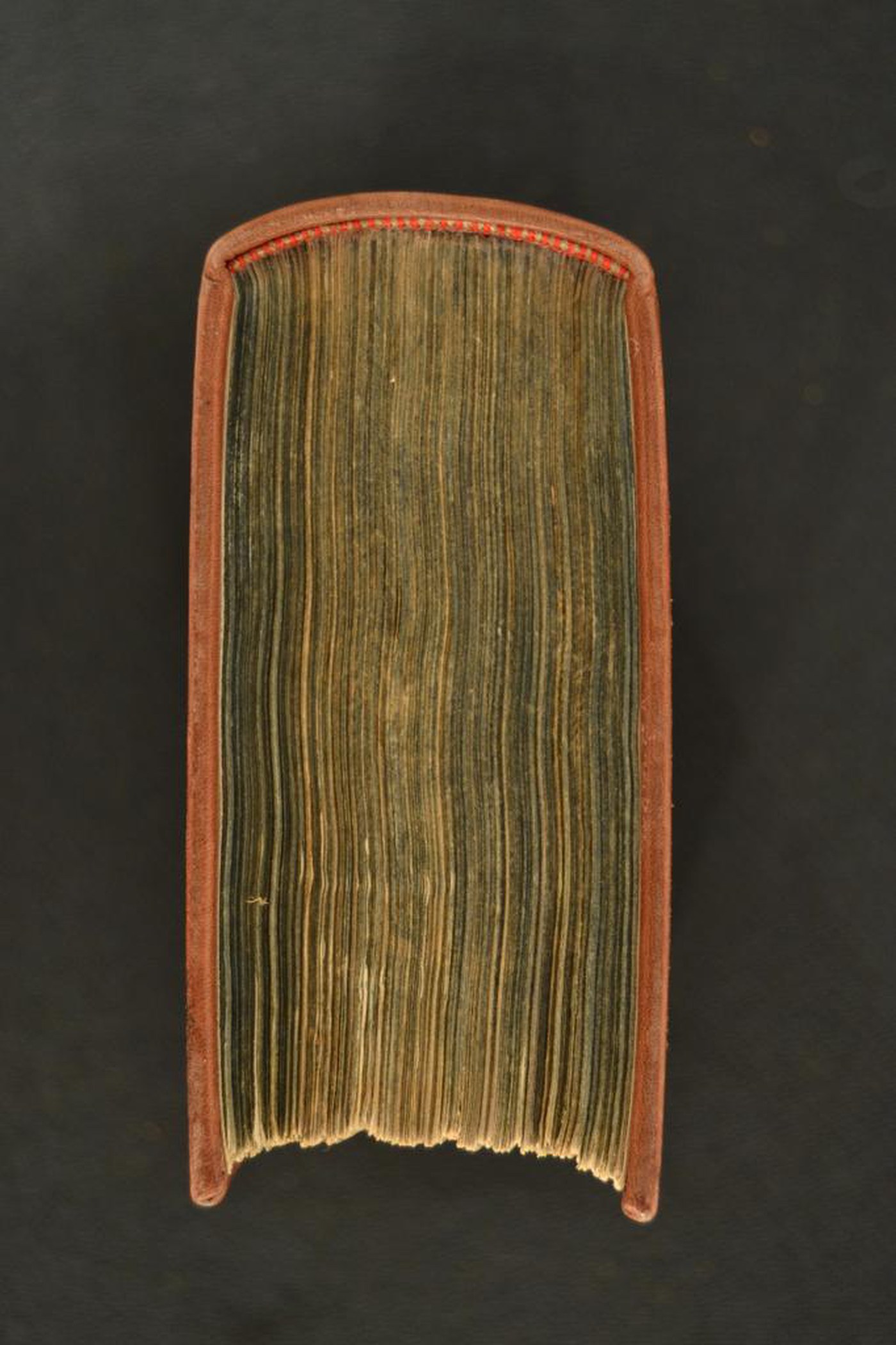 I fregi e le note tipografiche inducono ad assegnare la legatura al secondo quarto del XVI secolo, verosimilmente eseguita nell’Italia settentrionale. In evidenza il taglio blu e la nota di possesso in data 16 novembre 1627.