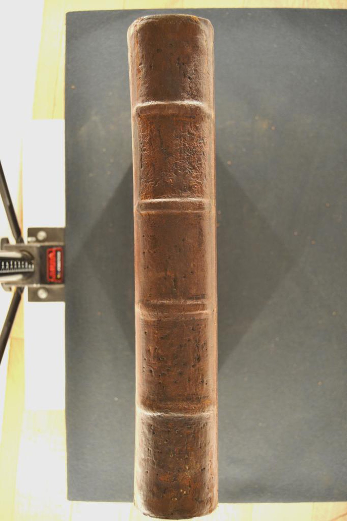 Cuoio di bazzana marrone su assi lignee smussate ai contropiatti in corrispondenza dei tagli, decorato a secco e in oro. Tracce di quattro cantonali e di umbone entro sfondo quadrangolare. Filetti concentrici. Cornici caratterizzati da fogliami entri coppie di nastri e meandri. Protome lupina negli angoli interni dello specchio e la Fortuna entro rettangolo sormontato da due punte al centro. Al piatto posteriore il titolo dell’opera in testa affiancato da due corolle stilizzate addossate. Due fermagli, capitelli, rimbocchi e carte di guardia rinnovate. Cucitura su quattro nervi rilevati. Tagli rustici. Stato di conservazione: mediocre. Fiore diffusamente scomparso. Volume restaurato.