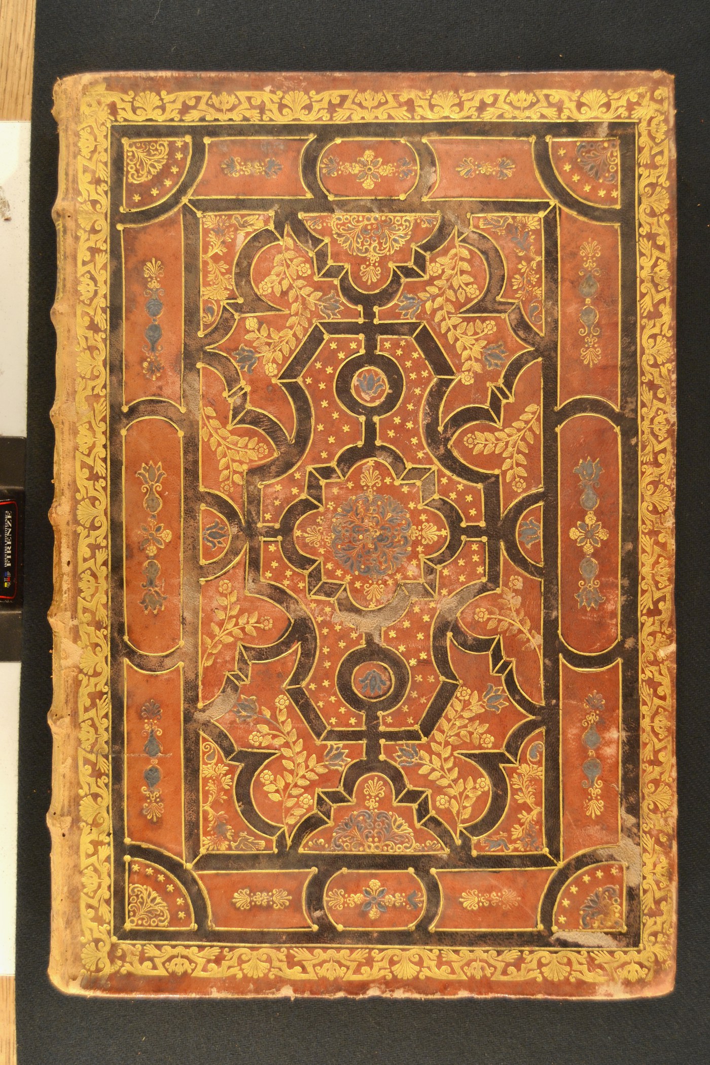 Cuoio di capra rosso mattone su quadranti in cartone decorato in oro e a colori. Cornici delimitate da pasta nera, caratterizzate da palmette alternate a corolle stilizzate entro nastri arcuati, fogliami svasati sormontati da arco di minute stelle a cinque punte, corolle e anfore panciute filigranate, fiorami, motivi parzialmente ripesi nello specchio e affiancati da rami fronzuti mossi. Scompartimenti del dorso riquadrati. Nel secondo, il cognome dell’autore e il titolo dell’opera entro il tassello in corame nero; volute caudate negli angoli interni e quattro fiorami addossati centrali su sfondo losangato muto in quelli residui. Capitelli muniti di anima circolare avvolta da fili in seta turchese e rosa. Cucitura su sette nervi rilevati. Indorsatura realizzata tramite alette orizzontali cartacee. Rimbocchi discretamente rifilati; risvolti laterali collocati sopra quelli di testa e di piede. Labbri ornati con fogliami e fiorami. Carte di guardia bianche. Tagli dorati brillanti, incisi e colorati. Stato di conservazione: discreto. Spellature al materiale di copertura, specie ai piatti, dalla tonalità scolorita lungo il dorso. Angoli di piede ricurvi.