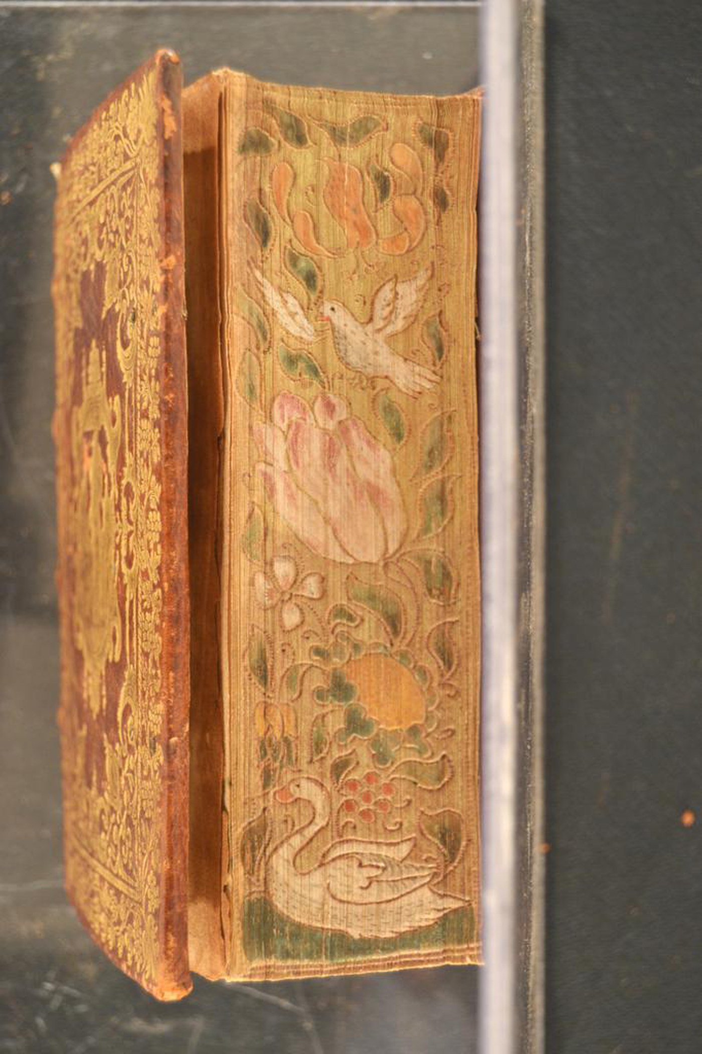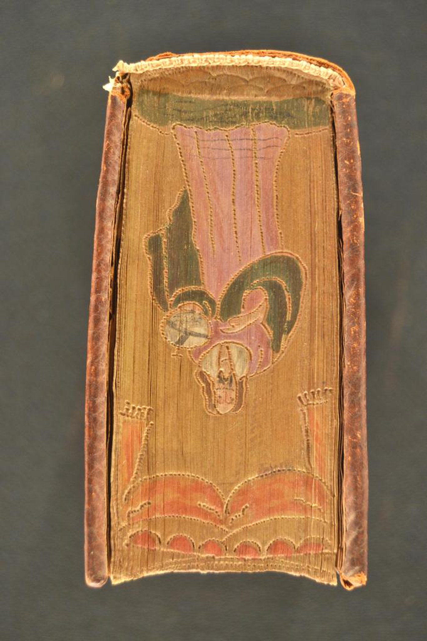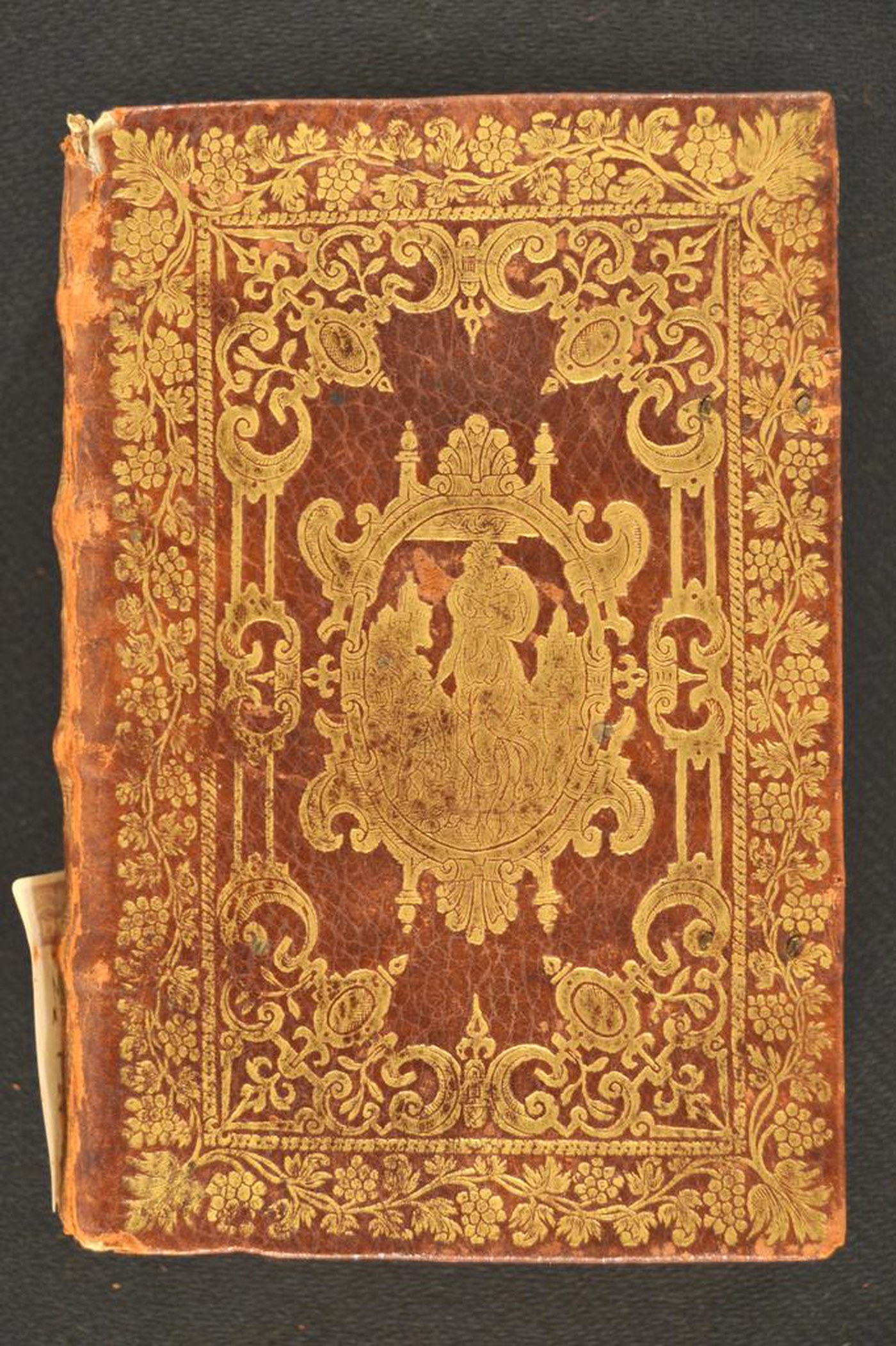 Cuoio di capra marrone su assi lignee smussate ai contropiatti in corrispondenza dei tagli, decorato in oro e a colori. Cornice caratterizzata da rami fronzuti e grappoli d’uva. Ovale entro due volute negli angoli interni dello specchio. Placca ovale centrale provvista di figura antropomorfa a figura intera; costruzioni sullo sfondo. Capitelli muniti di anima circolare avvolta da fili in seta bianca e rosa. Scompartimenti del dorso riquadrati; grottesca negli angoli interni e fregio fitomorfo centrale in quelli residui. Cucitura su quattro nervi rilevati. Indorsatura realizzata tramite alette cartacee orizzontali. Rimbocchi discretamente rifilati; risvolti collocati sopra quelli di testa e di piede. Carte di guardia bianche e ocra. Tagli dorati incisi e dipinti in policromia. Stato di conservazione: discreto. Materiale di copertura spellato al dorso.