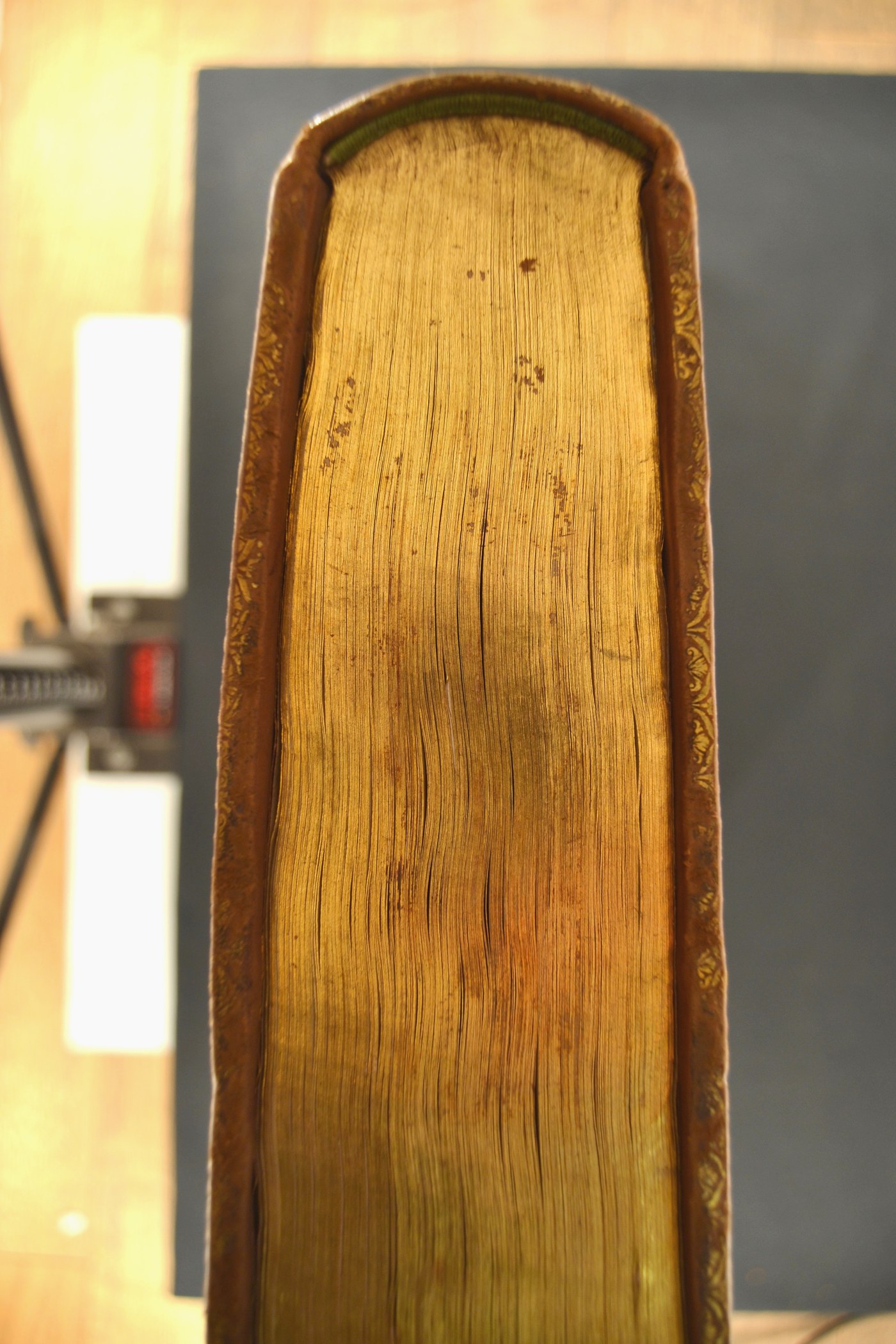 I fregi e le note tipografiche consentono di assegnare la legatura al secondo quarto del XVIII secolo, eseguita a Napoli. In evidenza le carte di guardia marmorizzate policrome pettinate e i tagli dorati incisi.