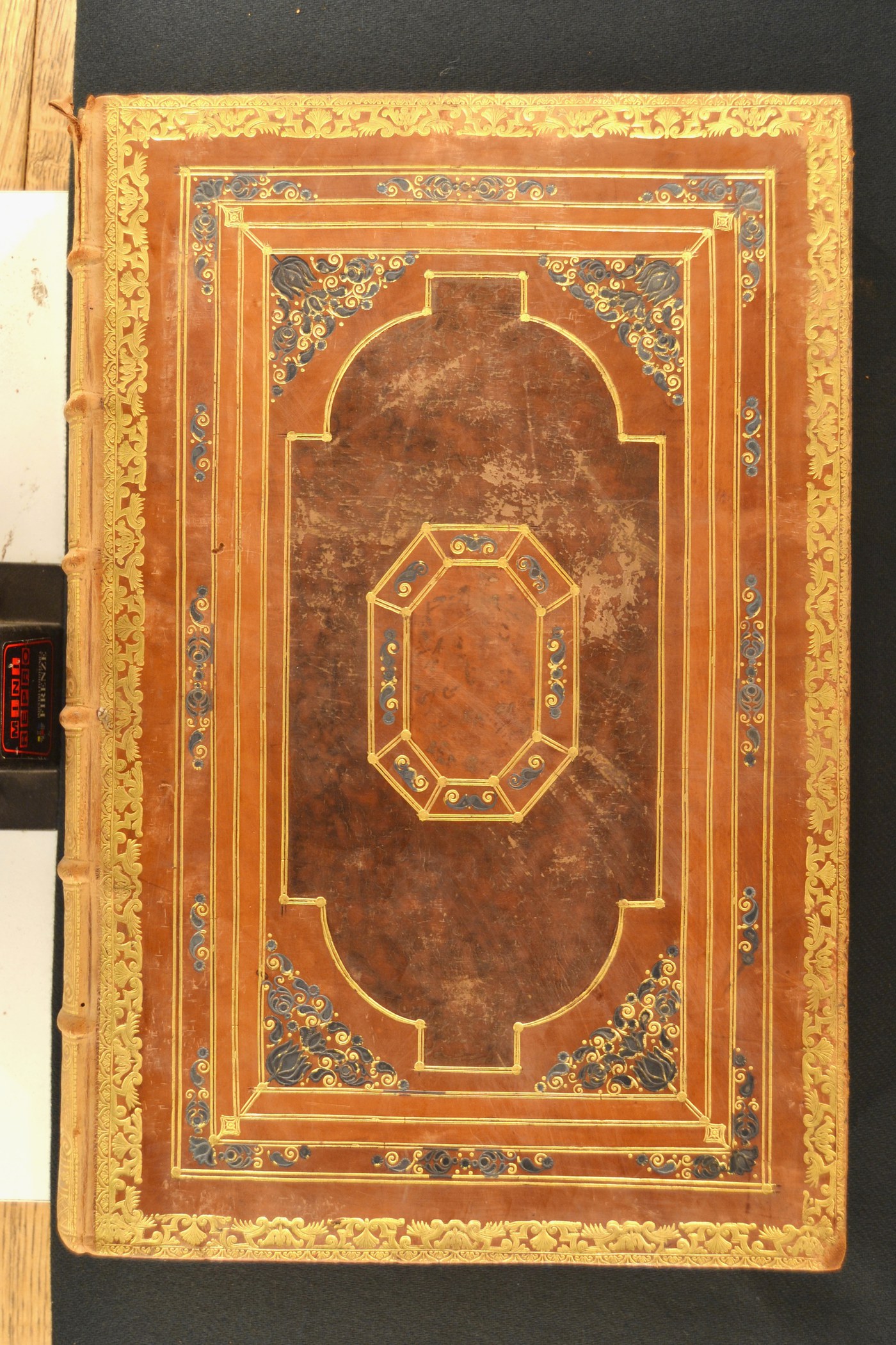 Cuoio di vitello marrone su quadranti in cartone decorato in oro e a colore. Cornici caratterizzate da palmette alternate a corolle stilizzate entro nastri, anfore panciute, fogliami circinnati, cerchielli filigranati, tulipani rilevati in pasta blu. Ampia cartella centrale a tripli filetti spezzati a delimitare il poligono centrale dai fogliami pure circinnati. Scompartimenti del dorso riquadrati. Nel secondo e terzo, il nome dell’autore, il titolo dell’opera e la partizione del volume; motivi in foggia di falce e fregi fitomorfi esterni a fronte della losanga interna dai margini concavi in quelli residui. Capitelli muniti di anima circolare avvolta da fili in seta verde. Cucitura su sei nervi rilevati. Indorsatura e rimbocchi non osservabili. Labbri ornati a pizzo. Carte di guardia marmorizzate policrome pettinate e bianche. Tagli dorati brillanti incisi. Stato di conservazione: discreto. Abrasioni al materiale di copertura