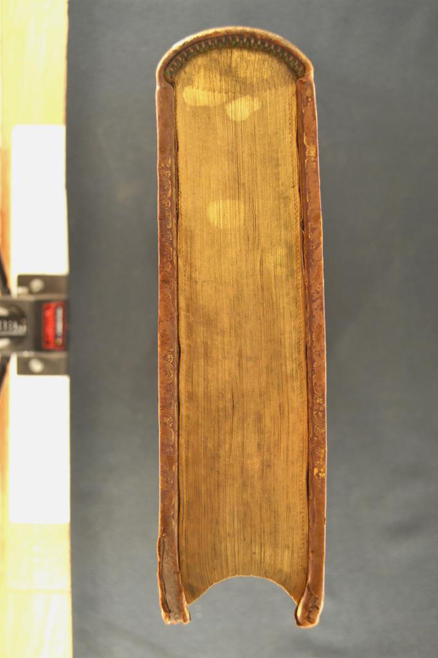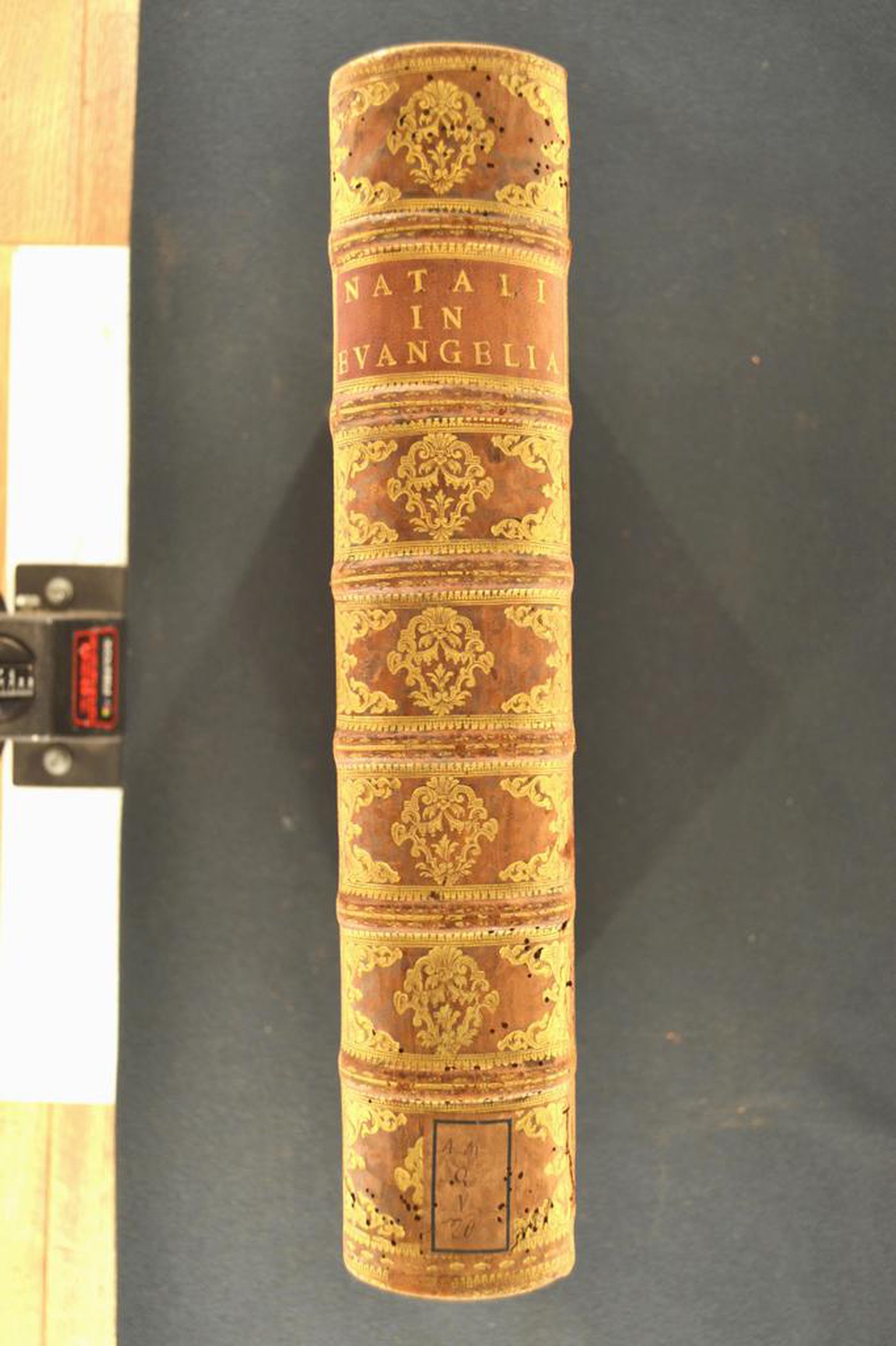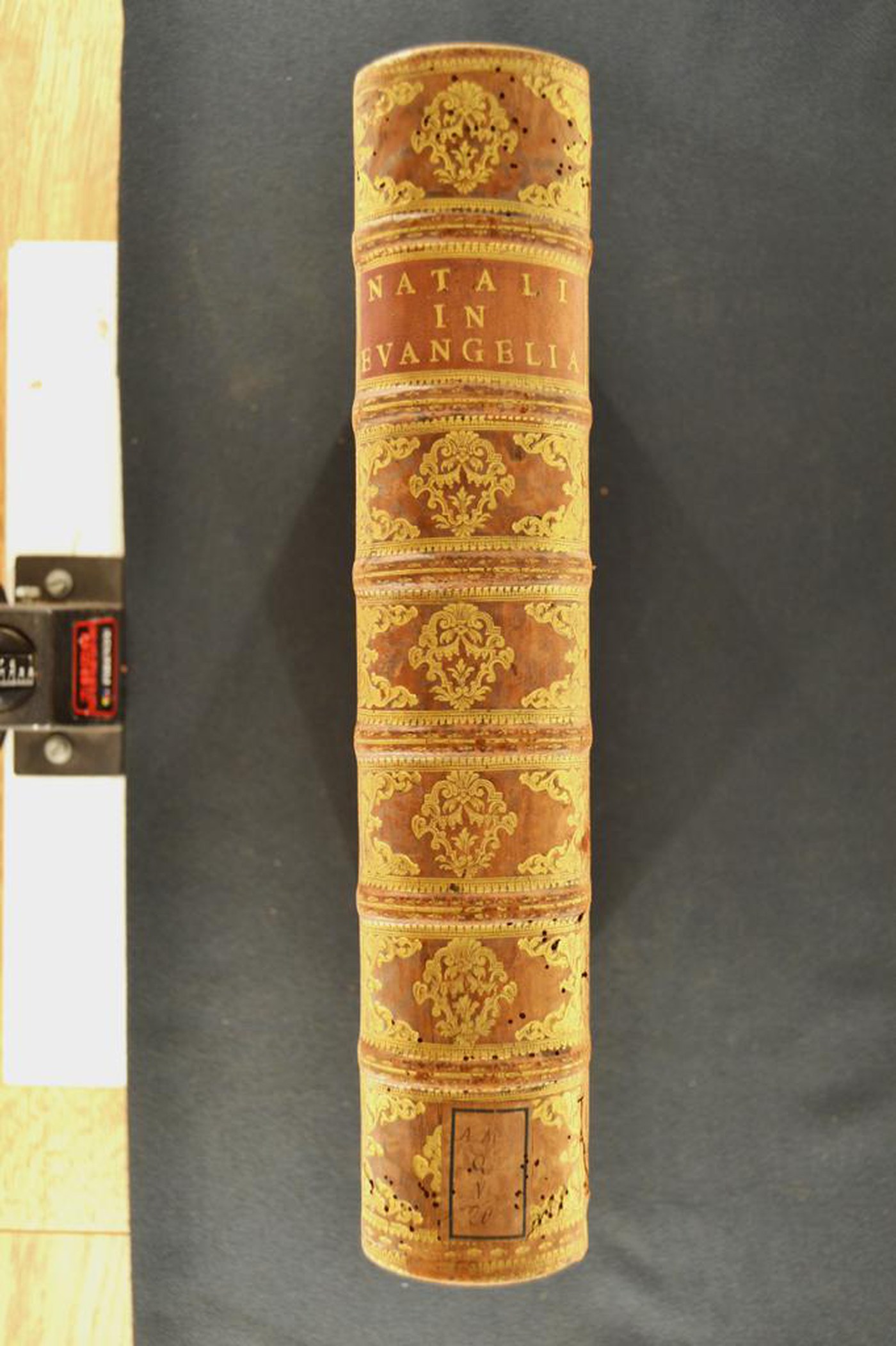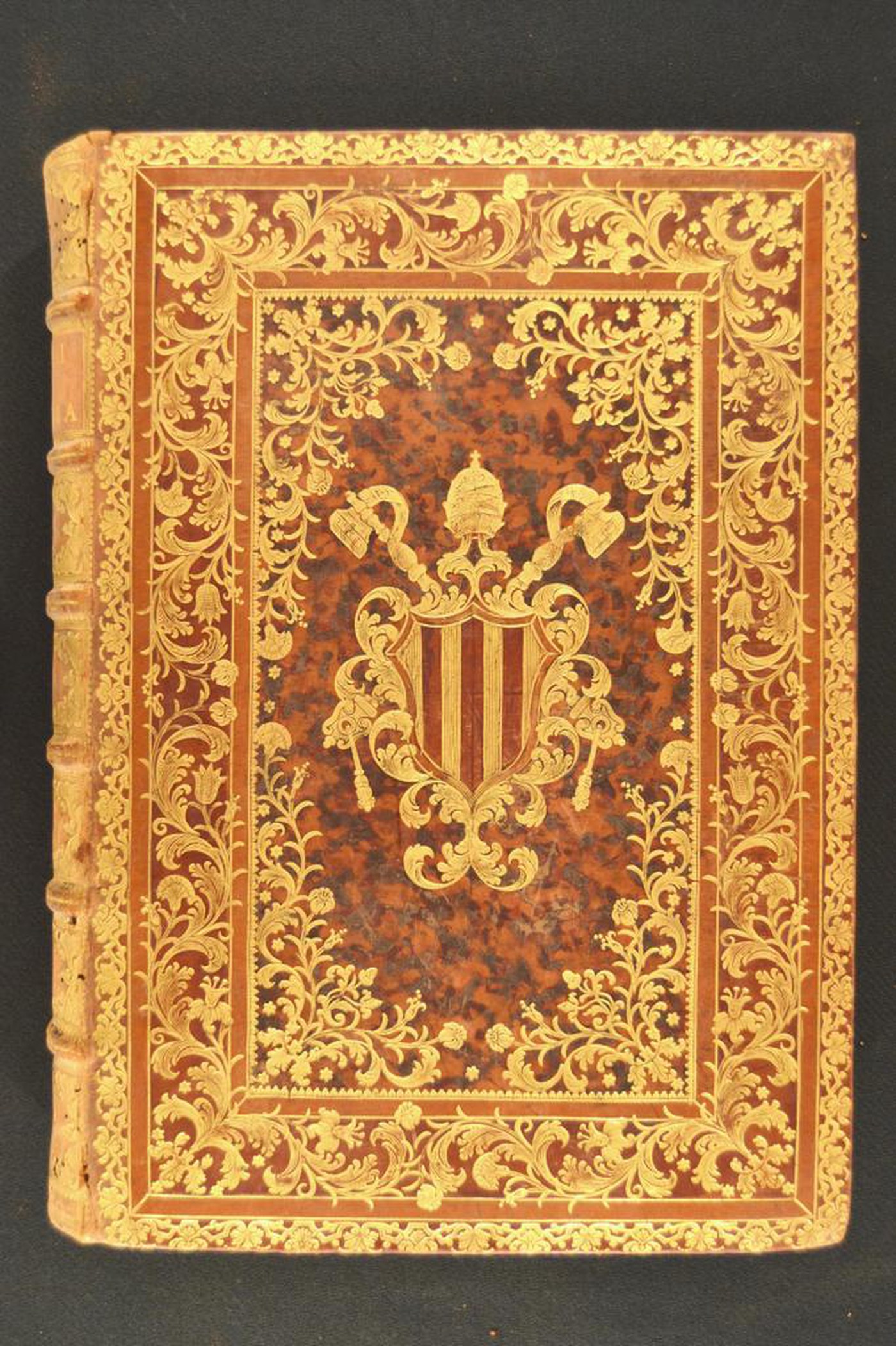 Cuoio di vitello marmorizzato marrone su quadranti in cartone decorato in oro. Coppia di cornici concentriche caratterizzate da palmette alternate a corolle stilizzate, rami fronzuti mossi, garofani, tulipani azzurrati, Margine interno dello specchio provvisto di fogliami, fiorami, minute stelle a sei punte. Armi (105x90 mm) riferibili al pontefice Benedetto XIV (1740-1758). Scompartimenti del dorso riquadrati. Nel secondo, il cognome dell’autore e il titolo dell’opera entro il tassello in corame rosso; fogliame negli angoli interni e fregio fitomorfo centrale in quelli residui. Capitelli muniti di fascio di fili in lino verde avvolto da fili in canapa. Cucitura su sei nervi rilevati. Indorsatura realizzata tramite alette orizzontali cartacee. Labbri ornati con fogliami. Rimbocchi discretamente rifilati. Margini dei contropiatti ornati con fogliami mossi e filetti filigranati. Carte di guardia sbruffate rosa e bianche. Tagli dorati brillanti incisi e marmorizzati. Stato di conservazione: discreto. Marginali spellature al materiale di copertura. Piatto anteriore indebolito. Angoli ricurvi e sbrecciati al piede.
