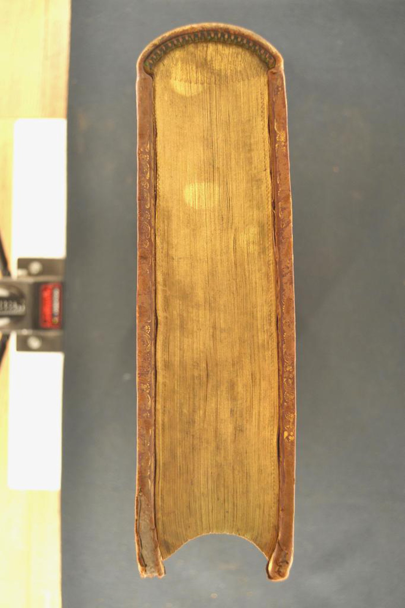 I fregi, le carte di guardia sbruffate rosa e le note tipografiche consentono di assegnare la legatura al XVIII secolo, eseguita a Roma. In evidenza i tagli dorati brillanti incisi e il frontespizio illustrato.