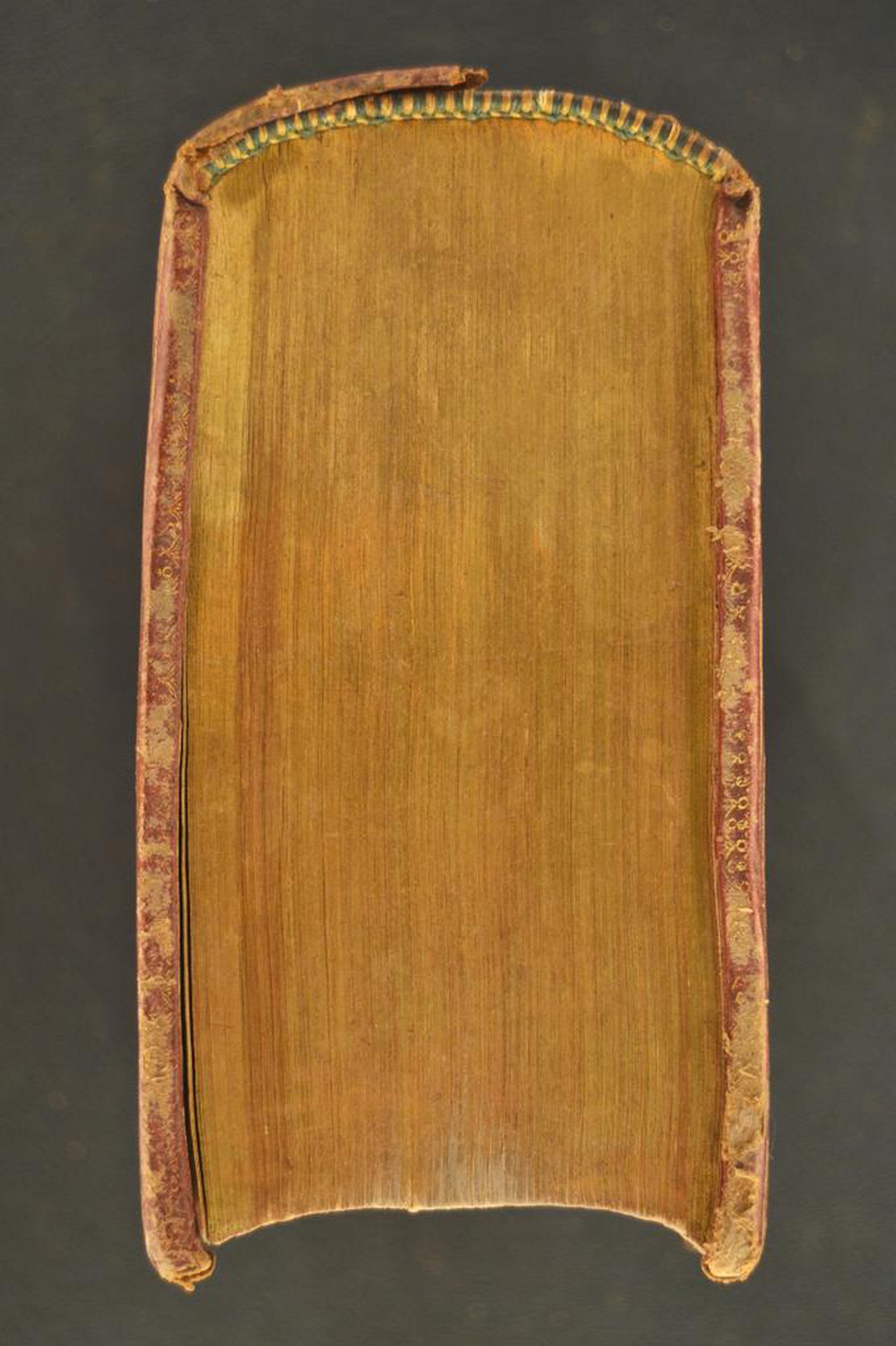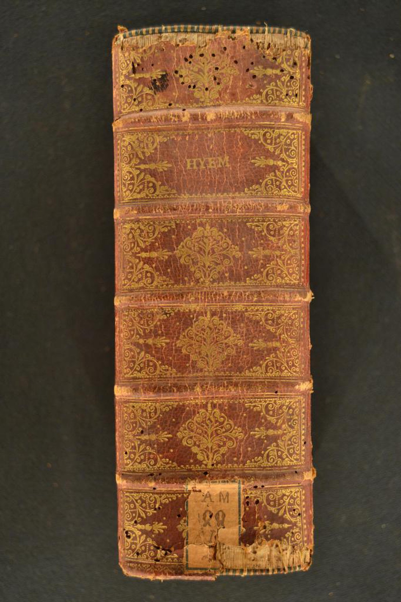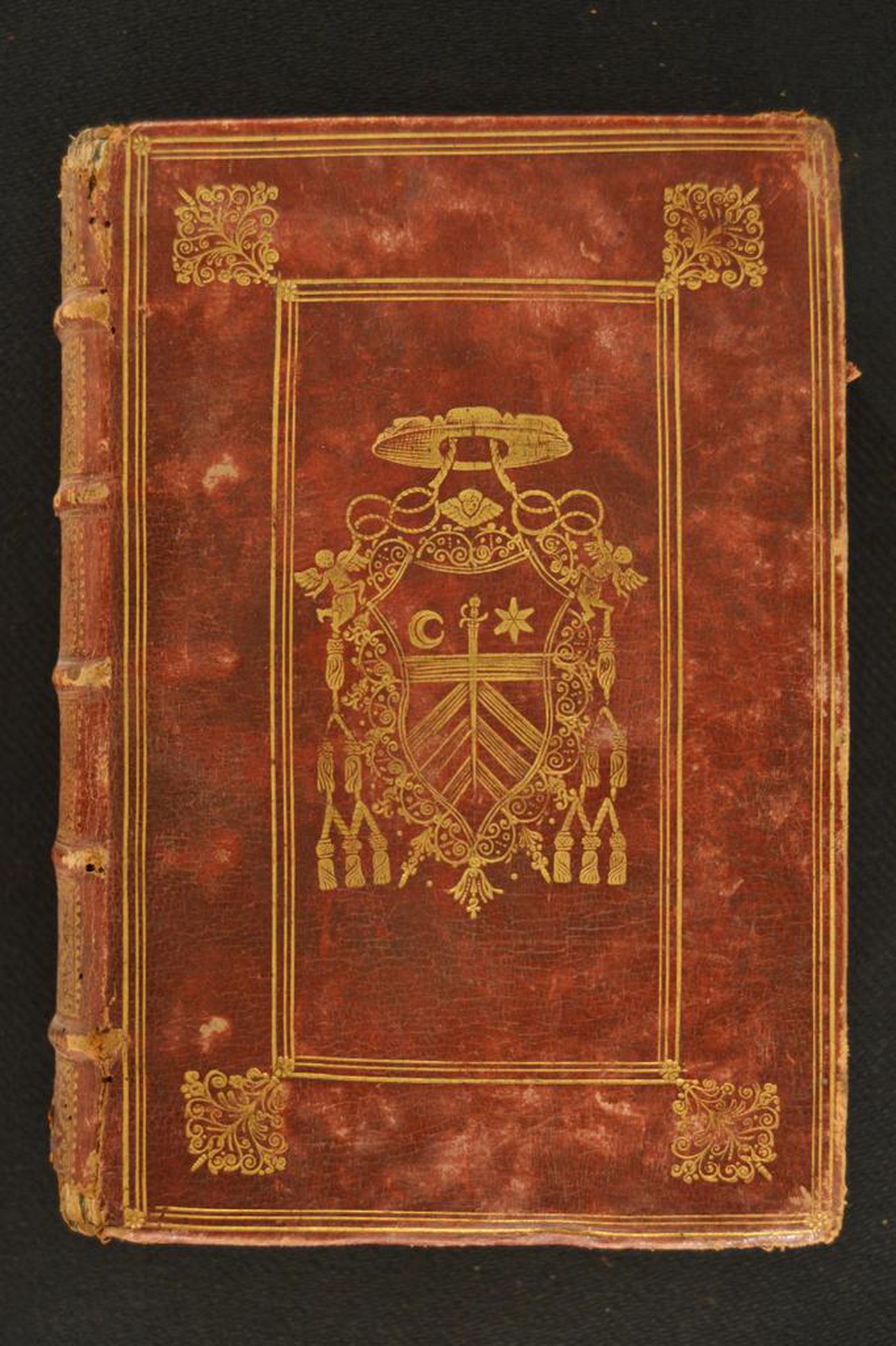 Cuoio di capra rosso su quadranti in cartone decorato in oro. Coppia di cornici concentriche all’antica; fregio fitomorfo negli angoli esterni del riquadro interno. Armi (85x60 mm) prelatizie al centro. Scompartimenti del dorso riquadrati. Nel secondo, la partizione del volume; due grottesche negli angoli interni e motivo fitomorfo centrale in quelli residui. Capitelli muniti di anima circolare avvolta da fili in canapa e in lino verde. Cucitura su cinque nervi rilevati. Indorsatura realizzata tramite alette orizzontali cartacee. Labbri ornati a pizzo. Rimbocchi non osservabili. Contropiatti ornati da foglio in carta marmorizzata policroma pettinata. Carte di guardia bianche. Tagli dorati brillanti. Stato di conservazione: discreto. Spellature al materiale di copertura, parzialmente scomparse in testa e al piede del dorso. Cerniere indebolite. Angoli ricurvi.
