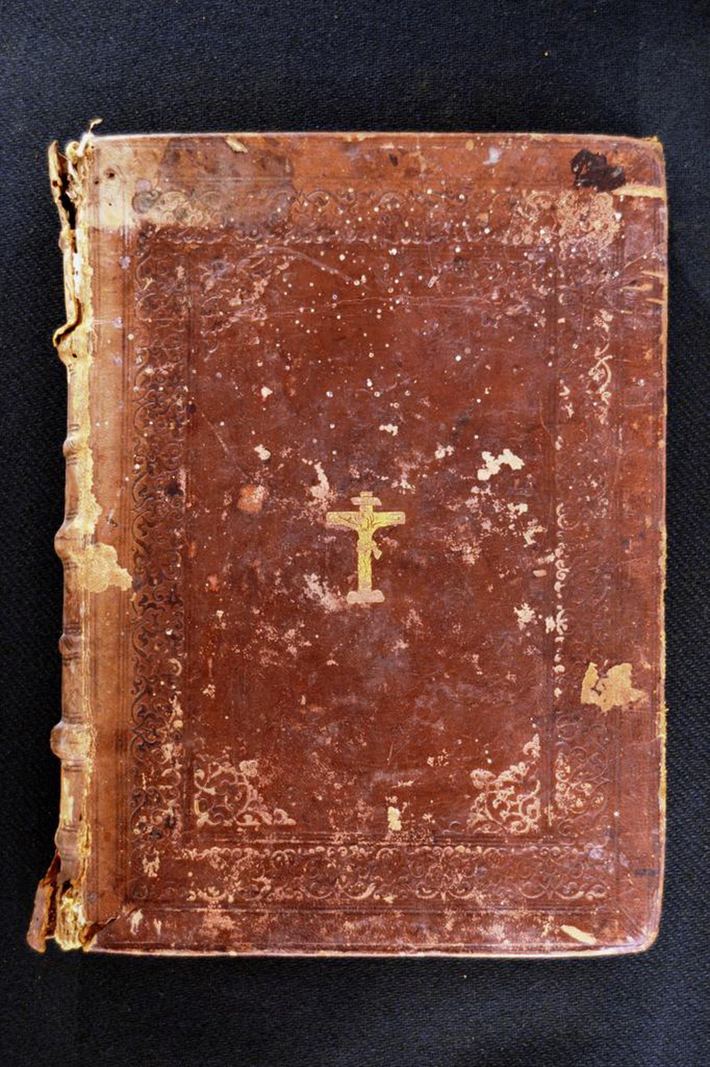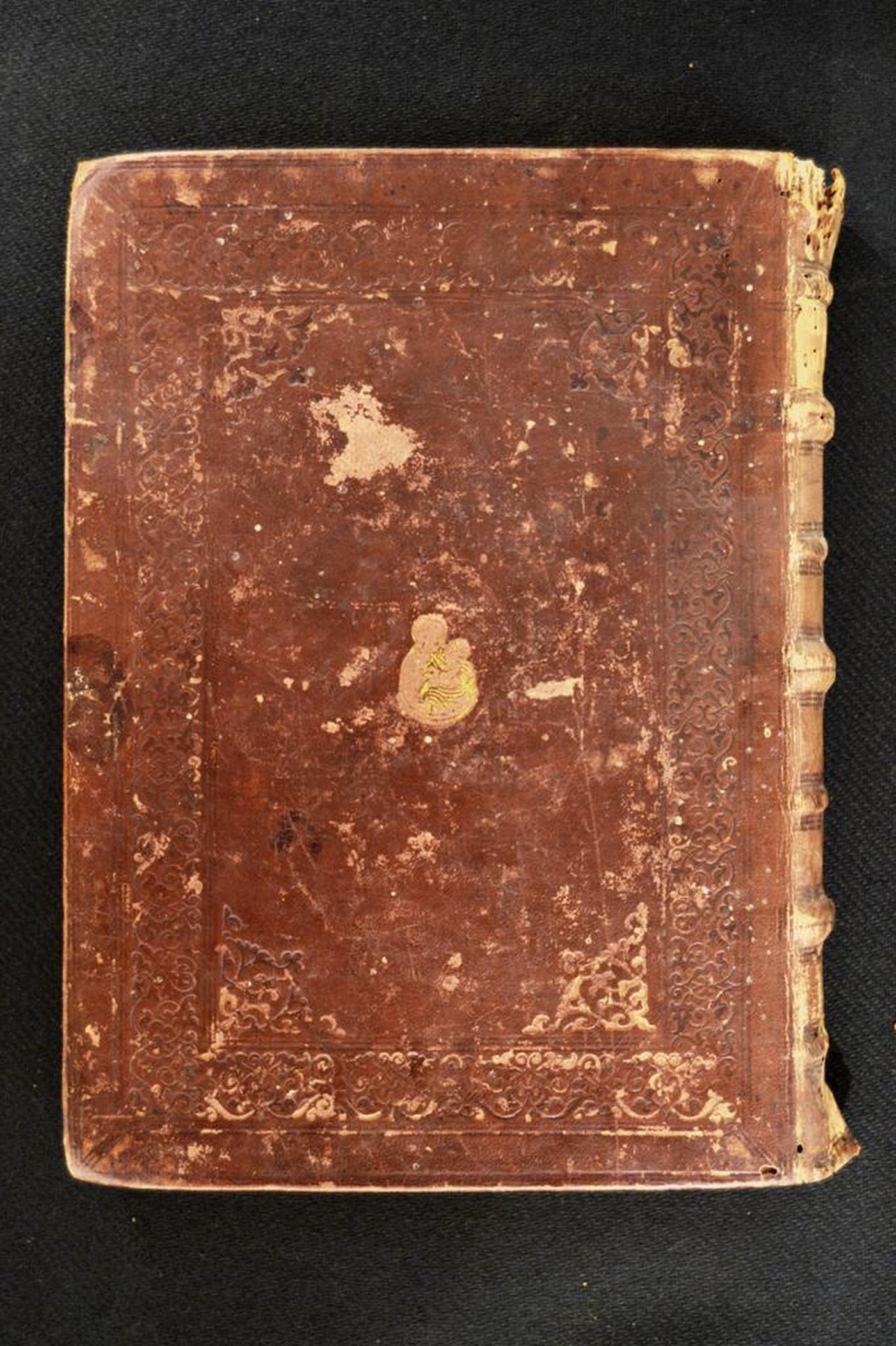 Cuoio di bazzana bruno su quadranti in cartone decorato a secco e in oro. Filetti concentrici. Cornice caratterizzata da arabeschi. Fogliami svasati negli angoli interni dello specchio. Al centro del piatto anteriore la Crocifissione, il busto della Madonna entro crescente rivolta verso destra con il Bambino in braccio. In testa e al piede del dorso, il titolo dell’opera entro il tassello in corame nocciola. Capitelli muniti arabeschi, di anima circolare avvolta da fili in canapa e in lino verde. Cucitura su tre nervi alternati a quattro apparenti. Indorsatura realizzata tramite alette orizzontali cartacee. Rimbocchi rifilati senza particolare cura. Carte di guardia bianche. Tagli rustici. Stato di conservazione: mediocre. Materiale di copertura in parte scomparso. Piatto anteriore in fase di distacco. Angoli ricurvi.