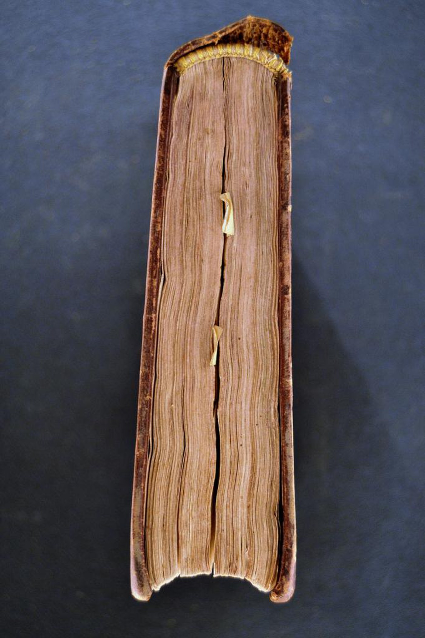 Il cuoio bruno, i fregi e le note tipografiche consentono di assegnare la legatura all’ultimo quarto del XVI, eseguita a Bologna. In evidenza due cavalieri in pergamena al taglio di piede.
