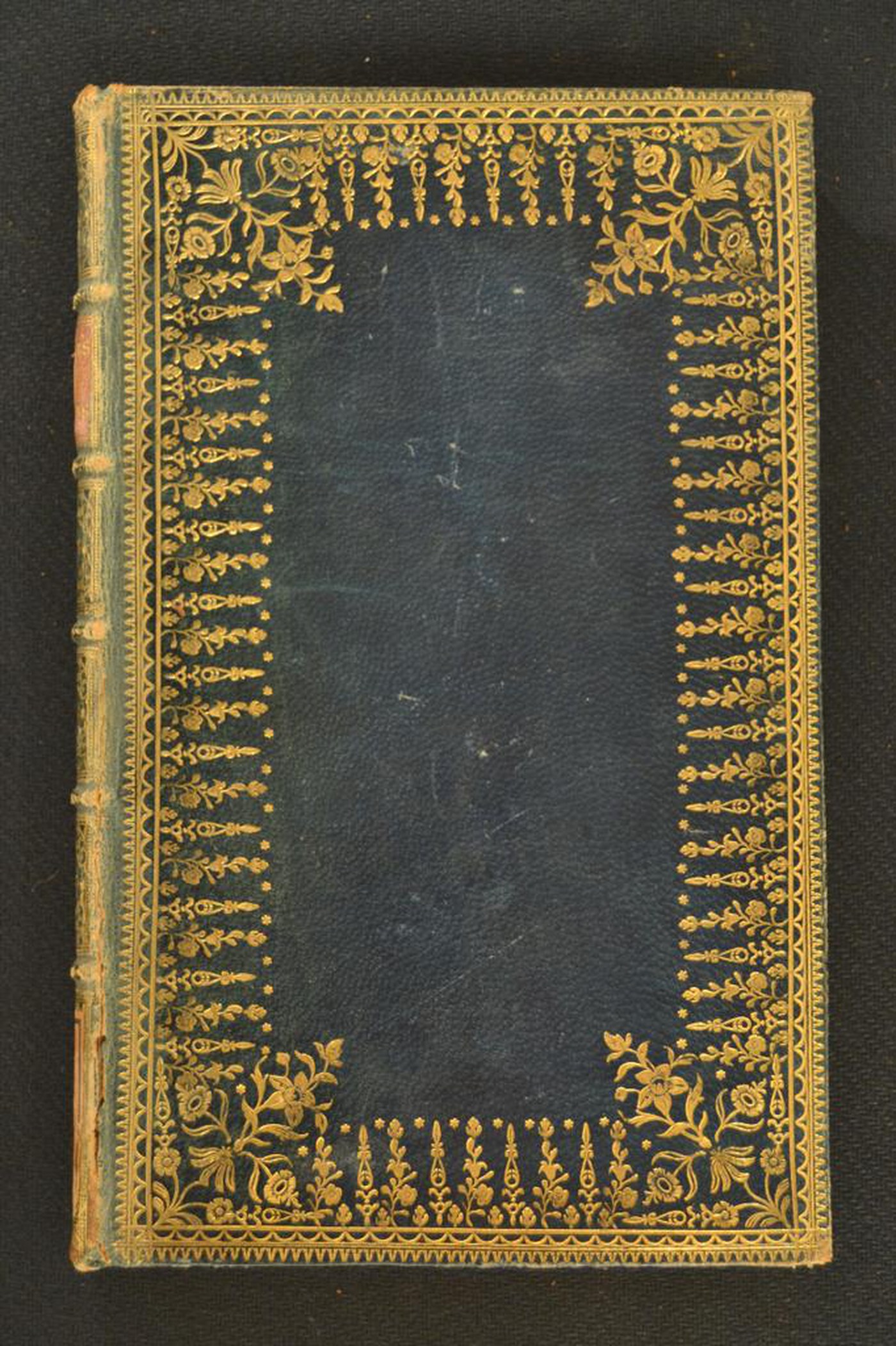 Cuoio di bazzana blu su quadranti in cartone decorato in oro. Cornice caratterizzata da punte e archi. Margini interni provvisti di corolle stilizzate, fogliami, fiorami, minute stelle. Scompartimenti del dorso riquadrati. Nel secondo il cognome dell’autore e il titolo dell’opera entro il tassello in corame rosso; volute fogliate e fiorame centrale in quelli residui. Capitelli muniti di anima circolare avvolta da fili in seta bianca e rosa. Cucitura su cinque nervi rilevati. Indorsatura realizzata tramite alette orizzontali cartacee. Labbri ornati con filetti diagonali grassi alternati a filigranati magri. Rimbocchi non osservabili. Carte di guardia marmorizzate policrome del genere caillouté e bianche. Tagli dorati brillanti. Stato di conservazione: discreto - buono. Marginali spellature al materiale di copertura dalla tonalità scolorita lungo il dorso.