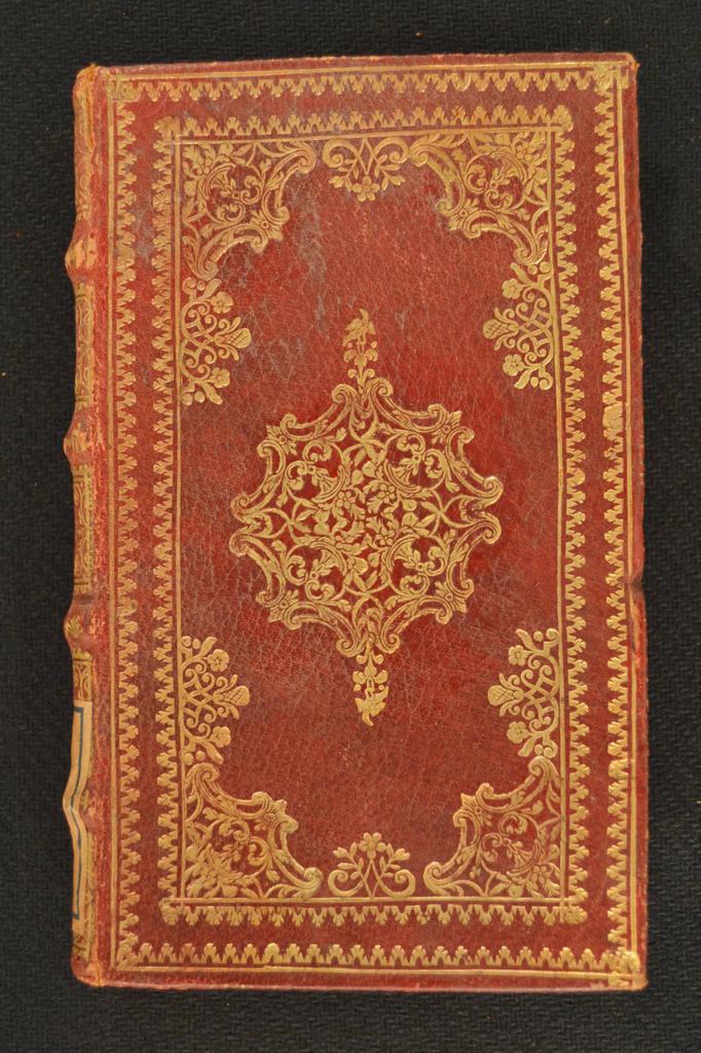 Cuoio di capra rosso su quadranti in spesso cartone decorato in oro. Cornice a due filetti concentrici caratterizzati da monticelli. Margini interni dello specchio provvisti di fregi a culla, nastri intrecciati, fiorami e fogliami ripresi nell’ampia cartella centrale. Scompartimenti del dorso riquadrati. Coppia di volute caudate negli angoli interni; quattro corolle stilizzate addossate in quelli residui. Capitelli muniti di anima circolare avvolta da fili in canapa e seta rosa. Cucitura su quattro nervi rilevati. Indorsatura realizzata tramite alette orizzontali cartacee. Labbri ornati a pizzo. Rimbocchi discretamente rifilati. Carte di guardia marmorizzate policrome pettinate e bianche. Tagli dorati brillanti. Segnacolo in tessuto rosso. Stato di conservazione: buono.