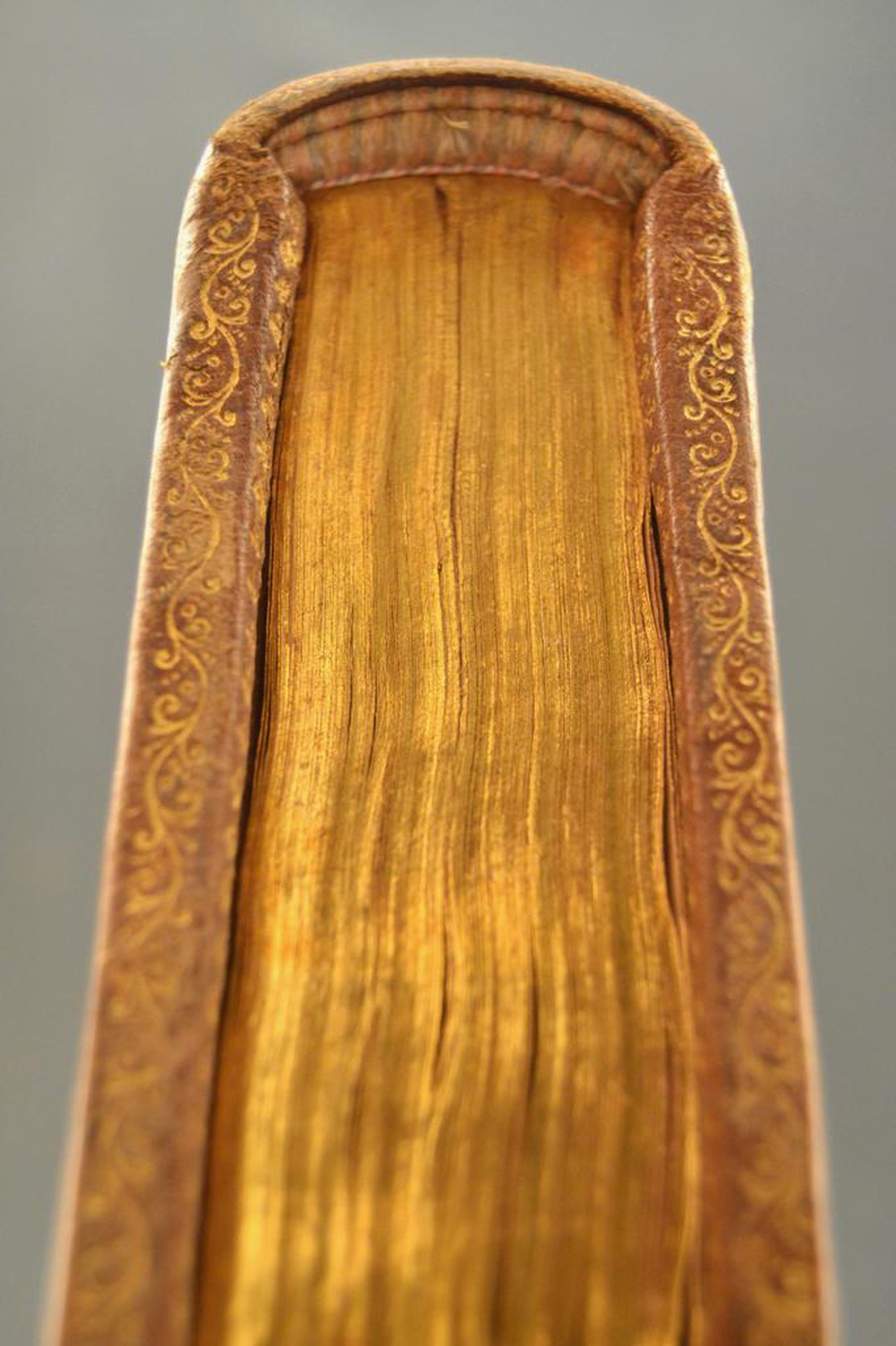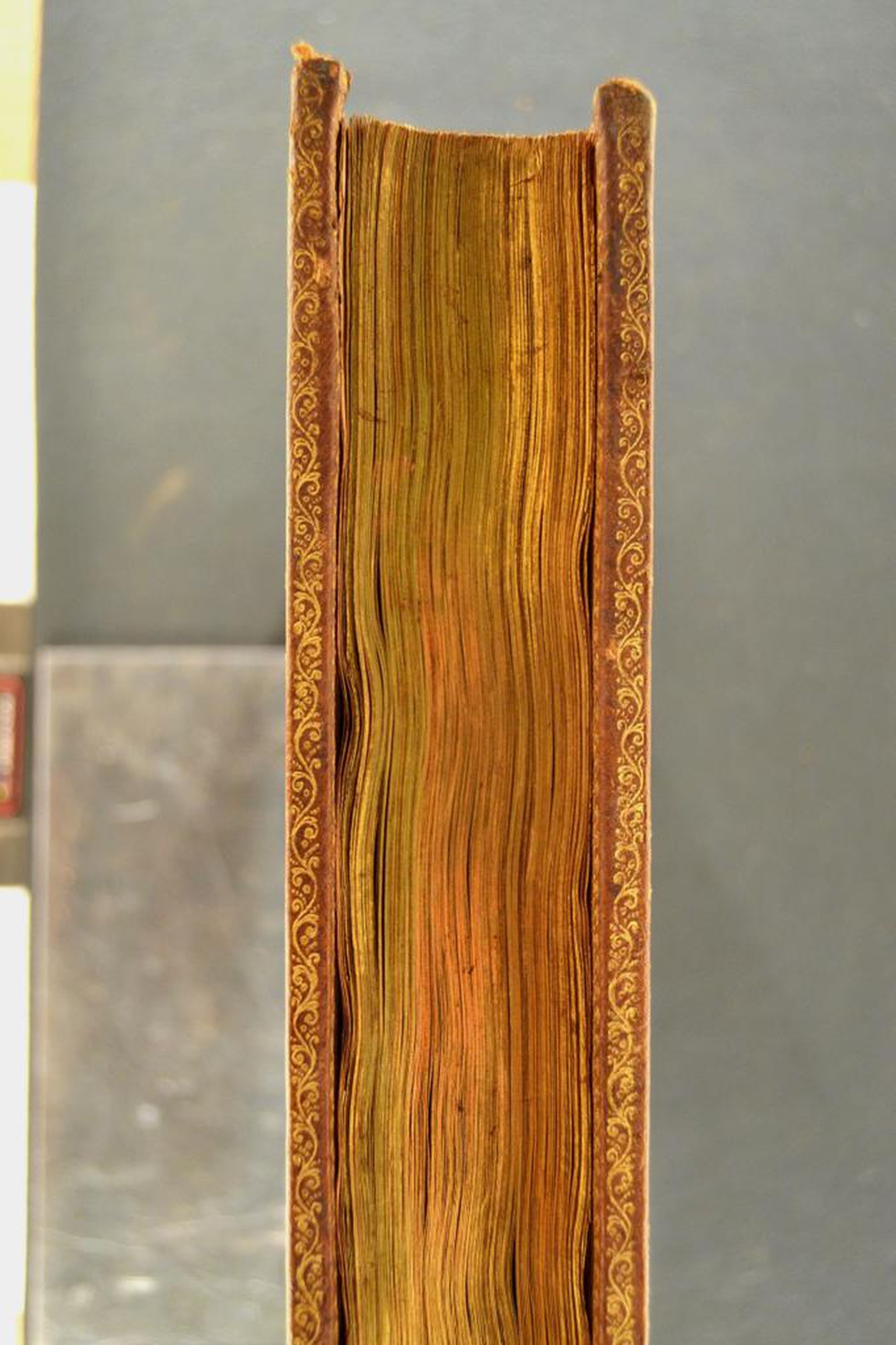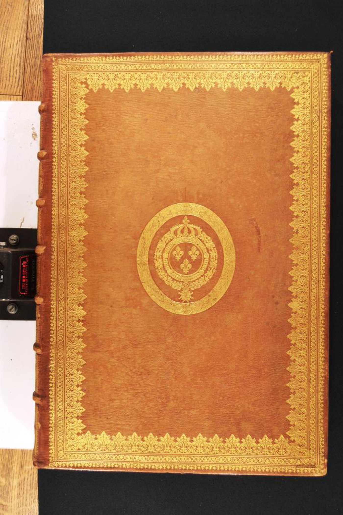 Il genere di manufatto, le armi, il capitello a doppia anima e le note tipografiche propongono di assegnare la legatura, alla metà del XVII secolo, eseguita a Parigi considerato il ruolo egemone svolto dalla ville lumière nel commercio librario transalpino. Da escludere l’attribuzione a Antoine Ruette, legatore reale dal 1643 al 1664, quale artefice del manufatto: alcun fregio è riferibile a questo atelier. In evidenza il colore del materiale di copertura, i contropiatti rivestiti da foglio di carta marmorizzata policroma e i tagli dorati brillanti.