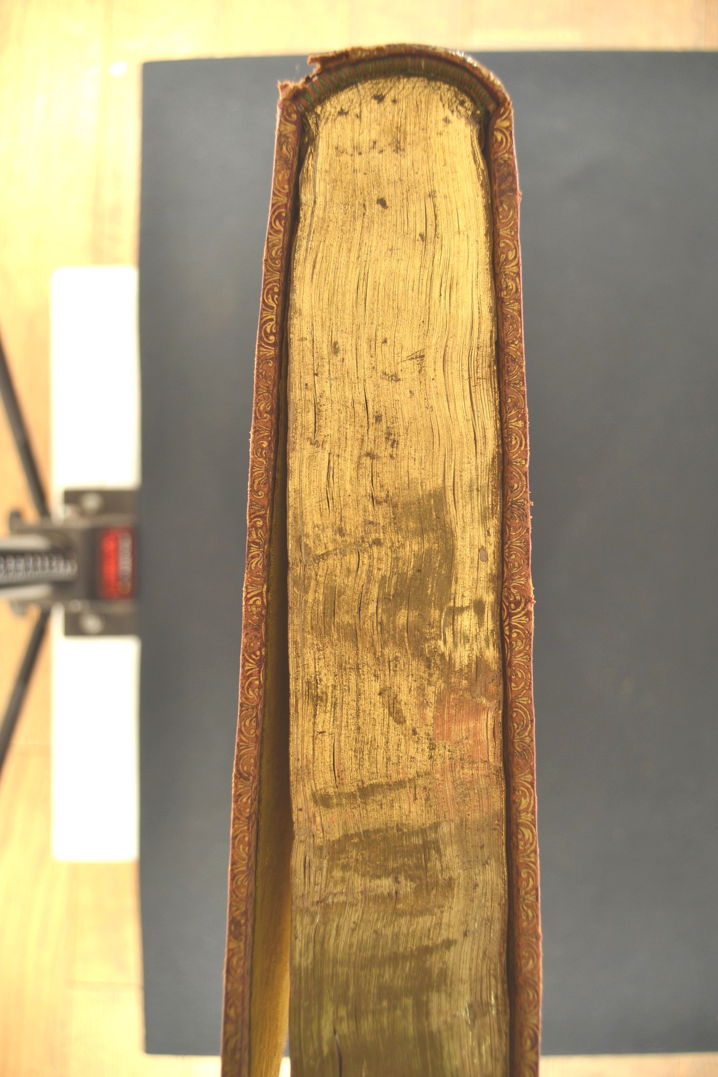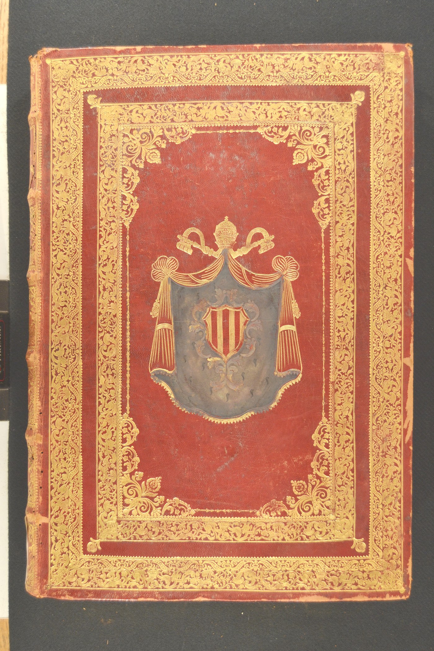 Cuoio di capra su quadranti in cartone decorato in oro. Cornice costituita da monticelli e da due filetti. Margine interno dello specchio caratterizzato da fogliami mossi, uccelli, nastri, ghiande, cestini. Armi (142x104 mm) riferibili al pontefice Benedetto XIV (1740-1758). Scompartimenti del dorso riquadrati. Nel secondo, il titolo dell’opera e la partizione del volume; fiorame entro volute negli angoli interni e fregio fitomorfo centrale entro sfondo losangato in quelli residui. Capitelli muniti di anima circolare avvolta da fili in lino rosso e blu. Cucitura su sei nervi rilevati. Indorsatura realizzata tramite aletta cartacea in foggia di trapezio. Labbri ornati con motivi stilizzati. Rimbocchi discretamente rifilati. Contropiatti rivestiti da lembo in tessuto dorato dai motivi fioriti e fogliati. Carte di guardia bianche. Tagli dorati brillanti incisi. Stato di conservazione: discreto. Spellature e gore grigie al materiale di copertura. Angoli ricurvi.