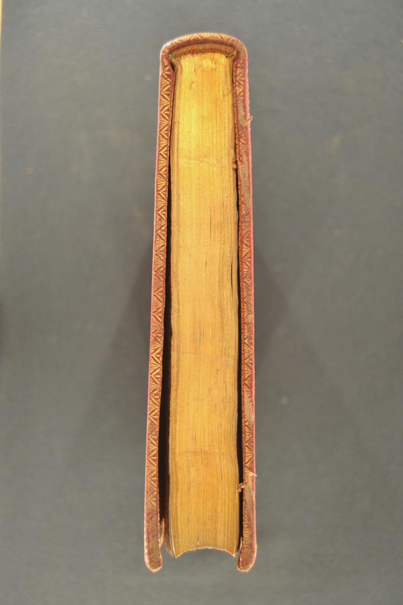 L’ornamento lungo il margine interno dello specchio e le note tipografiche consentono di assegnare la legatura al secondo quarto del XVIII secolo, eseguita in Francia. In evidenza le carte di guardia goffrate realizzate con matrice calcografica impressa a caldo su foglia dorata precedentemente applicata alla carta viola e tagli dorati brillanti.