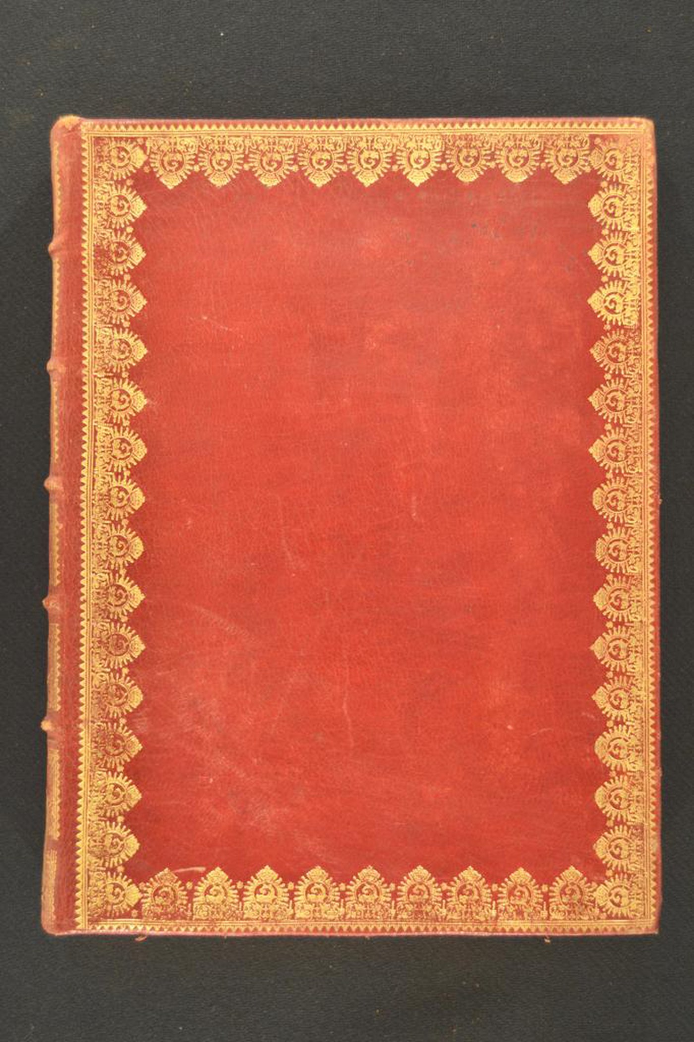 Cuoio di capra rosso su quadranti in cartone decorato in oro. Cornice costituita da punte e due filetti concentrici. Margine interno dello specchio provvisto di delfini coronati entro sfondo circolare raggiato. Scompartimenti del dorso riquadrati. Nel secondo, il titolo dell’opera; fiorami negli angoli interni e fregio fitomorfo centrale in quelli residui. Capitelli muniti di anima circolare avvolta da fili in seta rossa e verde. Cucitura su cinque nervi rilevati. Indorsatura realizzata tramite alette orizzontali cartacee. Labbri ornati a pizzo. Rimbocchi discretamente rifilati. Carte di guardia goffrate provviste di fiorami entro ampie volute, e bianche. Tagli dorati brillanti. Stato di conservazione: buono. Marginali bruniture al materiale di copertura.